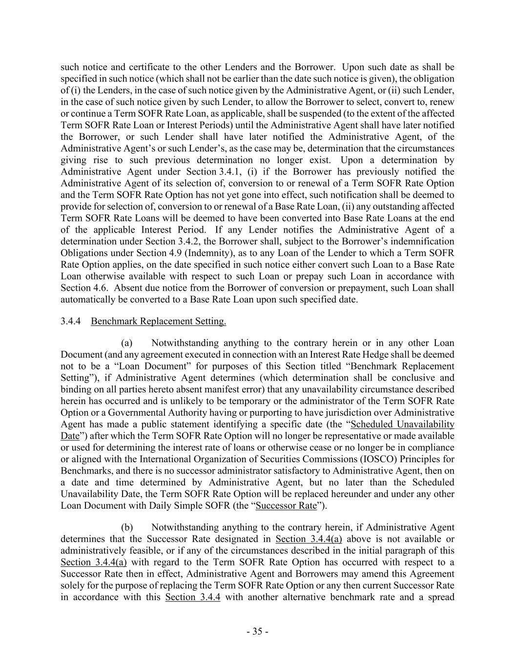 - 35 - such notice and certificate to the other Lenders and the Borrower. Upon such date as shall be specified in such notice (which shall not be earlier than the date such notice is given), the obligation of (i) the Lenders, in the case of such notice given by the Administrative Agent, or (ii) such Lender, in the case of such notice given by such Lender, to allow the Borrower to select, convert to, renew or continue a Term SOFR Rate Loan, as applicable, shall be suspended (to the extent of the affected Term SOFR Rate Loan or Interest Periods) until the Administrative Agent shall have later notified the Borrower, or such Lender shall have later notified the Administrative Agent, of the Administrative Agent’s or such Lender’s, as the case may be, determination that the circumstances giving rise to such previous determination no longer exist. Upon a determination by Administrative Agent under Section 3.4.1, (i) if the Borrower has previously notified the Administrative Agent of its selection of, conversion to or renewal of a Term SOFR Rate Option and the Term SOFR Rate Option has not yet gone into effect, such notification shall be deemed to provide for selection of, conversion to or renewal of a Base Rate Loan, (ii) any outstanding affected Term SOFR Rate Loans will be deemed to have been converted into Base Rate Loans at the end of the applicable Interest Period. If any Lender notifies the Administrative Agent of a determination under Section 3.4.2, the Borrower shall, subject to the Borrower’s indemnification Obligations under Section 4.9 (Indemnity), as to any Loan of the Lender to which a Term SOFR Rate Option applies, on the date specified in such notice either convert such Loan to a Base Rate Loan otherwise available with respect to such Loan or prepay such Loan in accordance with Section 4.6. Absent due notice from the Borrower of conversion or prepayment, such Loan shall automatically be converted to a Base Rate Loan upon such specified date. 3.4.4 Benchmark Replacement Setting. (a) Notwithstanding anything to the contrary herein or in any other Loan Document (and any agreement executed in connection with an Interest Rate Hedge shall be deemed not to be a “Loan Document” for purposes of this Section titled “Benchmark Replacement Setting”), if Administrative Agent determines (which determination shall be conclusive and binding on all parties hereto absent manifest error) that any unavailability circumstance described herein has occurred and is unlikely to be temporary or the administrator of the Term SOFR Rate Option or a Governmental Authority having or purporting to have jurisdiction over Administrative Agent has made a public statement identifying a specific date (the “Scheduled Unavailability Date”) after which the Term SOFR Rate Option will no longer be representative or made available or used for determining the interest rate of loans or otherwise cease or no longer be in compliance or aligned with the International Organization of Securities Commissions (IOSCO) Principles for Benchmarks, and there is no successor administrator satisfactory to Administrative Agent, then on a date and time determined by Administrative Agent, but no later than the Scheduled Unavailability Date, the Term SOFR Rate Option will be replaced hereunder and under any other Loan Document with Daily Simple SOFR (the “Successor Rate”). (b) Notwithstanding anything to the contrary herein, if Administrative Agent determines that the Successor Rate designated in Section 3.4.4(a) above is not available or administratively feasible, or if any of the circumstances described in the initial paragraph of this Section 3.4.4(a) with regard to the Term SOFR Rate Option has occurred with respect to a Successor Rate then in effect, Administrative Agent and Borrowers may amend this Agreement solely for the purpose of replacing the Term SOFR Rate Option or any then current Successor Rate in accordance with this Section 3.4.4 with another alternative benchmark rate and a spread