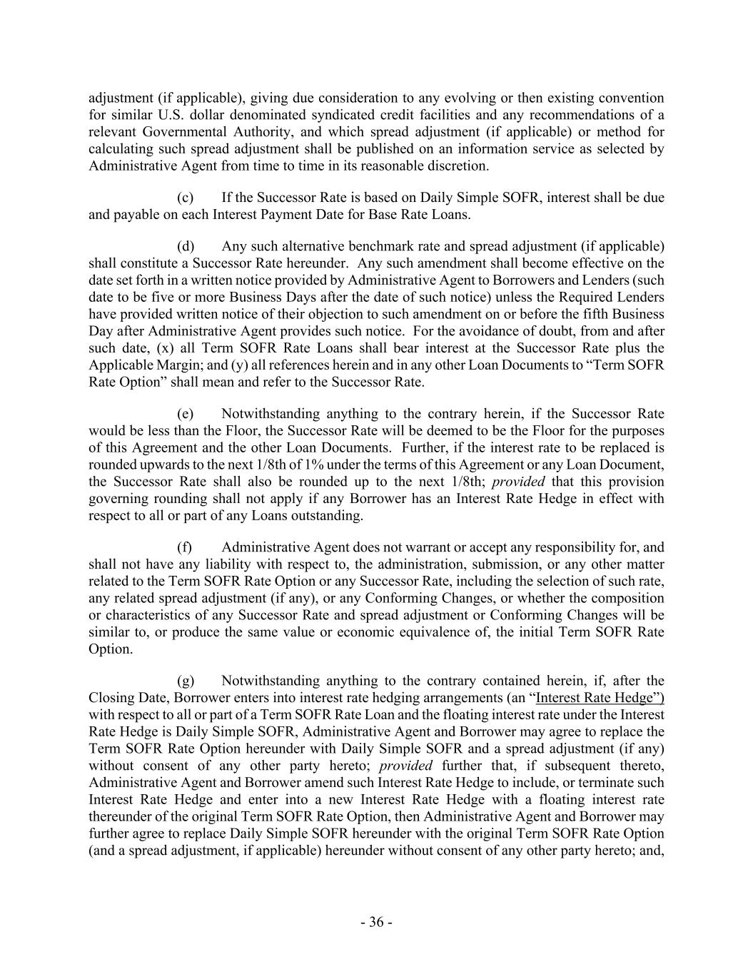 - 36 - adjustment (if applicable), giving due consideration to any evolving or then existing convention for similar U.S. dollar denominated syndicated credit facilities and any recommendations of a relevant Governmental Authority, and which spread adjustment (if applicable) or method for calculating such spread adjustment shall be published on an information service as selected by Administrative Agent from time to time in its reasonable discretion. (c) If the Successor Rate is based on Daily Simple SOFR, interest shall be due and payable on each Interest Payment Date for Base Rate Loans. (d) Any such alternative benchmark rate and spread adjustment (if applicable) shall constitute a Successor Rate hereunder. Any such amendment shall become effective on the date set forth in a written notice provided by Administrative Agent to Borrowers and Lenders (such date to be five or more Business Days after the date of such notice) unless the Required Lenders have provided written notice of their objection to such amendment on or before the fifth Business Day after Administrative Agent provides such notice. For the avoidance of doubt, from and after such date, (x) all Term SOFR Rate Loans shall bear interest at the Successor Rate plus the Applicable Margin; and (y) all references herein and in any other Loan Documents to “Term SOFR Rate Option” shall mean and refer to the Successor Rate. (e) Notwithstanding anything to the contrary herein, if the Successor Rate would be less than the Floor, the Successor Rate will be deemed to be the Floor for the purposes of this Agreement and the other Loan Documents. Further, if the interest rate to be replaced is rounded upwards to the next 1/8th of 1% under the terms of this Agreement or any Loan Document, the Successor Rate shall also be rounded up to the next 1/8th; provided that this provision governing rounding shall not apply if any Borrower has an Interest Rate Hedge in effect with respect to all or part of any Loans outstanding. (f) Administrative Agent does not warrant or accept any responsibility for, and shall not have any liability with respect to, the administration, submission, or any other matter related to the Term SOFR Rate Option or any Successor Rate, including the selection of such rate, any related spread adjustment (if any), or any Conforming Changes, or whether the composition or characteristics of any Successor Rate and spread adjustment or Conforming Changes will be similar to, or produce the same value or economic equivalence of, the initial Term SOFR Rate Option. (g) Notwithstanding anything to the contrary contained herein, if, after the Closing Date, Borrower enters into interest rate hedging arrangements (an “Interest Rate Hedge”) with respect to all or part of a Term SOFR Rate Loan and the floating interest rate under the Interest Rate Hedge is Daily Simple SOFR, Administrative Agent and Borrower may agree to replace the Term SOFR Rate Option hereunder with Daily Simple SOFR and a spread adjustment (if any) without consent of any other party hereto; provided further that, if subsequent thereto, Administrative Agent and Borrower amend such Interest Rate Hedge to include, or terminate such Interest Rate Hedge and enter into a new Interest Rate Hedge with a floating interest rate thereunder of the original Term SOFR Rate Option, then Administrative Agent and Borrower may further agree to replace Daily Simple SOFR hereunder with the original Term SOFR Rate Option (and a spread adjustment, if applicable) hereunder without consent of any other party hereto; and,