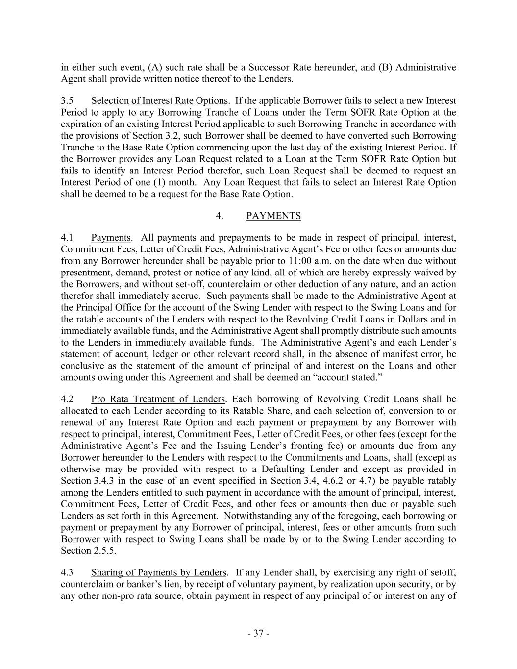 - 37 - in either such event, (A) such rate shall be a Successor Rate hereunder, and (B) Administrative Agent shall provide written notice thereof to the Lenders. 3.5 Selection of Interest Rate Options. If the applicable Borrower fails to select a new Interest Period to apply to any Borrowing Tranche of Loans under the Term SOFR Rate Option at the expiration of an existing Interest Period applicable to such Borrowing Tranche in accordance with the provisions of Section 3.2, such Borrower shall be deemed to have converted such Borrowing Tranche to the Base Rate Option commencing upon the last day of the existing Interest Period. If the Borrower provides any Loan Request related to a Loan at the Term SOFR Rate Option but fails to identify an Interest Period therefor, such Loan Request shall be deemed to request an Interest Period of one (1) month. Any Loan Request that fails to select an Interest Rate Option shall be deemed to be a request for the Base Rate Option. 4. PAYMENTS 4.1 Payments. All payments and prepayments to be made in respect of principal, interest, Commitment Fees, Letter of Credit Fees, Administrative Agent’s Fee or other fees or amounts due from any Borrower hereunder shall be payable prior to 11:00 a.m. on the date when due without presentment, demand, protest or notice of any kind, all of which are hereby expressly waived by the Borrowers, and without set-off, counterclaim or other deduction of any nature, and an action therefor shall immediately accrue. Such payments shall be made to the Administrative Agent at the Principal Office for the account of the Swing Lender with respect to the Swing Loans and for the ratable accounts of the Lenders with respect to the Revolving Credit Loans in Dollars and in immediately available funds, and the Administrative Agent shall promptly distribute such amounts to the Lenders in immediately available funds. The Administrative Agent’s and each Lender’s statement of account, ledger or other relevant record shall, in the absence of manifest error, be conclusive as the statement of the amount of principal of and interest on the Loans and other amounts owing under this Agreement and shall be deemed an “account stated.” 4.2 Pro Rata Treatment of Lenders. Each borrowing of Revolving Credit Loans shall be allocated to each Lender according to its Ratable Share, and each selection of, conversion to or renewal of any Interest Rate Option and each payment or prepayment by any Borrower with respect to principal, interest, Commitment Fees, Letter of Credit Fees, or other fees (except for the Administrative Agent’s Fee and the Issuing Lender’s fronting fee) or amounts due from any Borrower hereunder to the Lenders with respect to the Commitments and Loans, shall (except as otherwise may be provided with respect to a Defaulting Lender and except as provided in Section 3.4.3 in the case of an event specified in Section 3.4, 4.6.2 or 4.7) be payable ratably among the Lenders entitled to such payment in accordance with the amount of principal, interest, Commitment Fees, Letter of Credit Fees, and other fees or amounts then due or payable such Lenders as set forth in this Agreement. Notwithstanding any of the foregoing, each borrowing or payment or prepayment by any Borrower of principal, interest, fees or other amounts from such Borrower with respect to Swing Loans shall be made by or to the Swing Lender according to Section 2.5.5. 4.3 Sharing of Payments by Lenders. If any Lender shall, by exercising any right of setoff, counterclaim or banker’s lien, by receipt of voluntary payment, by realization upon security, or by any other non-pro rata source, obtain payment in respect of any principal of or interest on any of