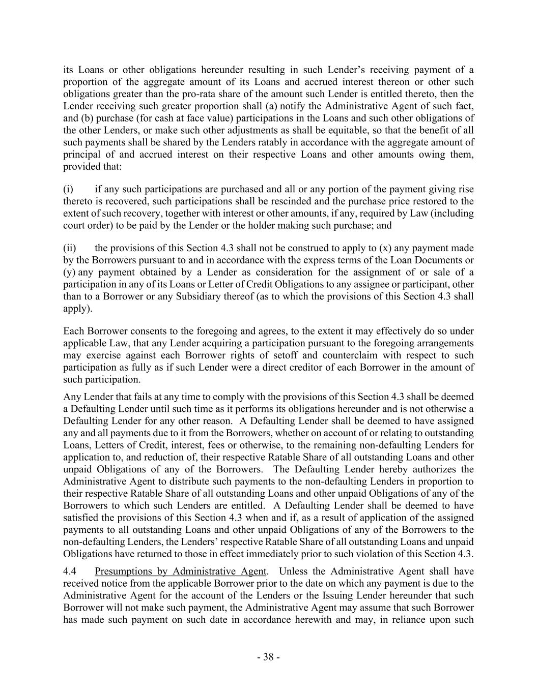 - 38 - its Loans or other obligations hereunder resulting in such Lender’s receiving payment of a proportion of the aggregate amount of its Loans and accrued interest thereon or other such obligations greater than the pro-rata share of the amount such Lender is entitled thereto, then the Lender receiving such greater proportion shall (a) notify the Administrative Agent of such fact, and (b) purchase (for cash at face value) participations in the Loans and such other obligations of the other Lenders, or make such other adjustments as shall be equitable, so that the benefit of all such payments shall be shared by the Lenders ratably in accordance with the aggregate amount of principal of and accrued interest on their respective Loans and other amounts owing them, provided that: (i) if any such participations are purchased and all or any portion of the payment giving rise thereto is recovered, such participations shall be rescinded and the purchase price restored to the extent of such recovery, together with interest or other amounts, if any, required by Law (including court order) to be paid by the Lender or the holder making such purchase; and (ii) the provisions of this Section 4.3 shall not be construed to apply to (x) any payment made by the Borrowers pursuant to and in accordance with the express terms of the Loan Documents or (y) any payment obtained by a Lender as consideration for the assignment of or sale of a participation in any of its Loans or Letter of Credit Obligations to any assignee or participant, other than to a Borrower or any Subsidiary thereof (as to which the provisions of this Section 4.3 shall apply). Each Borrower consents to the foregoing and agrees, to the extent it may effectively do so under applicable Law, that any Lender acquiring a participation pursuant to the foregoing arrangements may exercise against each Borrower rights of setoff and counterclaim with respect to such participation as fully as if such Lender were a direct creditor of each Borrower in the amount of such participation. Any Lender that fails at any time to comply with the provisions of this Section 4.3 shall be deemed a Defaulting Lender until such time as it performs its obligations hereunder and is not otherwise a Defaulting Lender for any other reason. A Defaulting Lender shall be deemed to have assigned any and all payments due to it from the Borrowers, whether on account of or relating to outstanding Loans, Letters of Credit, interest, fees or otherwise, to the remaining non-defaulting Lenders for application to, and reduction of, their respective Ratable Share of all outstanding Loans and other unpaid Obligations of any of the Borrowers. The Defaulting Lender hereby authorizes the Administrative Agent to distribute such payments to the non-defaulting Lenders in proportion to their respective Ratable Share of all outstanding Loans and other unpaid Obligations of any of the Borrowers to which such Lenders are entitled. A Defaulting Lender shall be deemed to have satisfied the provisions of this Section 4.3 when and if, as a result of application of the assigned payments to all outstanding Loans and other unpaid Obligations of any of the Borrowers to the non-defaulting Lenders, the Lenders’ respective Ratable Share of all outstanding Loans and unpaid Obligations have returned to those in effect immediately prior to such violation of this Section 4.3. 4.4 Presumptions by Administrative Agent. Unless the Administrative Agent shall have received notice from the applicable Borrower prior to the date on which any payment is due to the Administrative Agent for the account of the Lenders or the Issuing Lender hereunder that such Borrower will not make such payment, the Administrative Agent may assume that such Borrower has made such payment on such date in accordance herewith and may, in reliance upon such