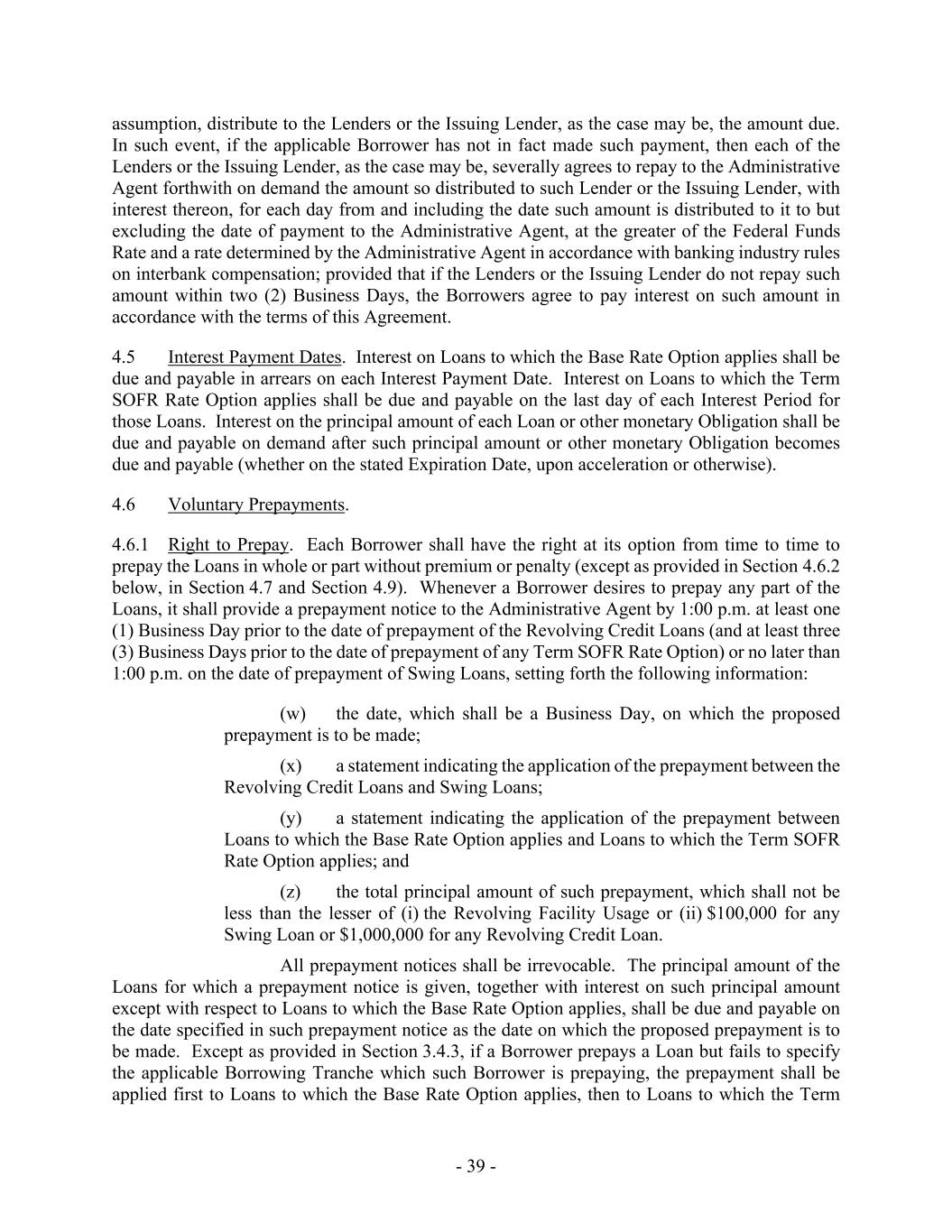 - 39 - assumption, distribute to the Lenders or the Issuing Lender, as the case may be, the amount due. In such event, if the applicable Borrower has not in fact made such payment, then each of the Lenders or the Issuing Lender, as the case may be, severally agrees to repay to the Administrative Agent forthwith on demand the amount so distributed to such Lender or the Issuing Lender, with interest thereon, for each day from and including the date such amount is distributed to it to but excluding the date of payment to the Administrative Agent, at the greater of the Federal Funds Rate and a rate determined by the Administrative Agent in accordance with banking industry rules on interbank compensation; provided that if the Lenders or the Issuing Lender do not repay such amount within two (2) Business Days, the Borrowers agree to pay interest on such amount in accordance with the terms of this Agreement. 4.5 Interest Payment Dates. Interest on Loans to which the Base Rate Option applies shall be due and payable in arrears on each Interest Payment Date. Interest on Loans to which the Term SOFR Rate Option applies shall be due and payable on the last day of each Interest Period for those Loans. Interest on the principal amount of each Loan or other monetary Obligation shall be due and payable on demand after such principal amount or other monetary Obligation becomes due and payable (whether on the stated Expiration Date, upon acceleration or otherwise). 4.6 Voluntary Prepayments. 4.6.1 Right to Prepay. Each Borrower shall have the right at its option from time to time to prepay the Loans in whole or part without premium or penalty (except as provided in Section 4.6.2 below, in Section 4.7 and Section 4.9). Whenever a Borrower desires to prepay any part of the Loans, it shall provide a prepayment notice to the Administrative Agent by 1:00 p.m. at least one (1) Business Day prior to the date of prepayment of the Revolving Credit Loans (and at least three (3) Business Days prior to the date of prepayment of any Term SOFR Rate Option) or no later than 1:00 p.m. on the date of prepayment of Swing Loans, setting forth the following information: (w) the date, which shall be a Business Day, on which the proposed prepayment is to be made; (x) a statement indicating the application of the prepayment between the Revolving Credit Loans and Swing Loans; (y) a statement indicating the application of the prepayment between Loans to which the Base Rate Option applies and Loans to which the Term SOFR Rate Option applies; and (z) the total principal amount of such prepayment, which shall not be less than the lesser of (i) the Revolving Facility Usage or (ii) $100,000 for any Swing Loan or $1,000,000 for any Revolving Credit Loan. All prepayment notices shall be irrevocable. The principal amount of the Loans for which a prepayment notice is given, together with interest on such principal amount except with respect to Loans to which the Base Rate Option applies, shall be due and payable on the date specified in such prepayment notice as the date on which the proposed prepayment is to be made. Except as provided in Section 3.4.3, if a Borrower prepays a Loan but fails to specify the applicable Borrowing Tranche which such Borrower is prepaying, the prepayment shall be applied first to Loans to which the Base Rate Option applies, then to Loans to which the Term