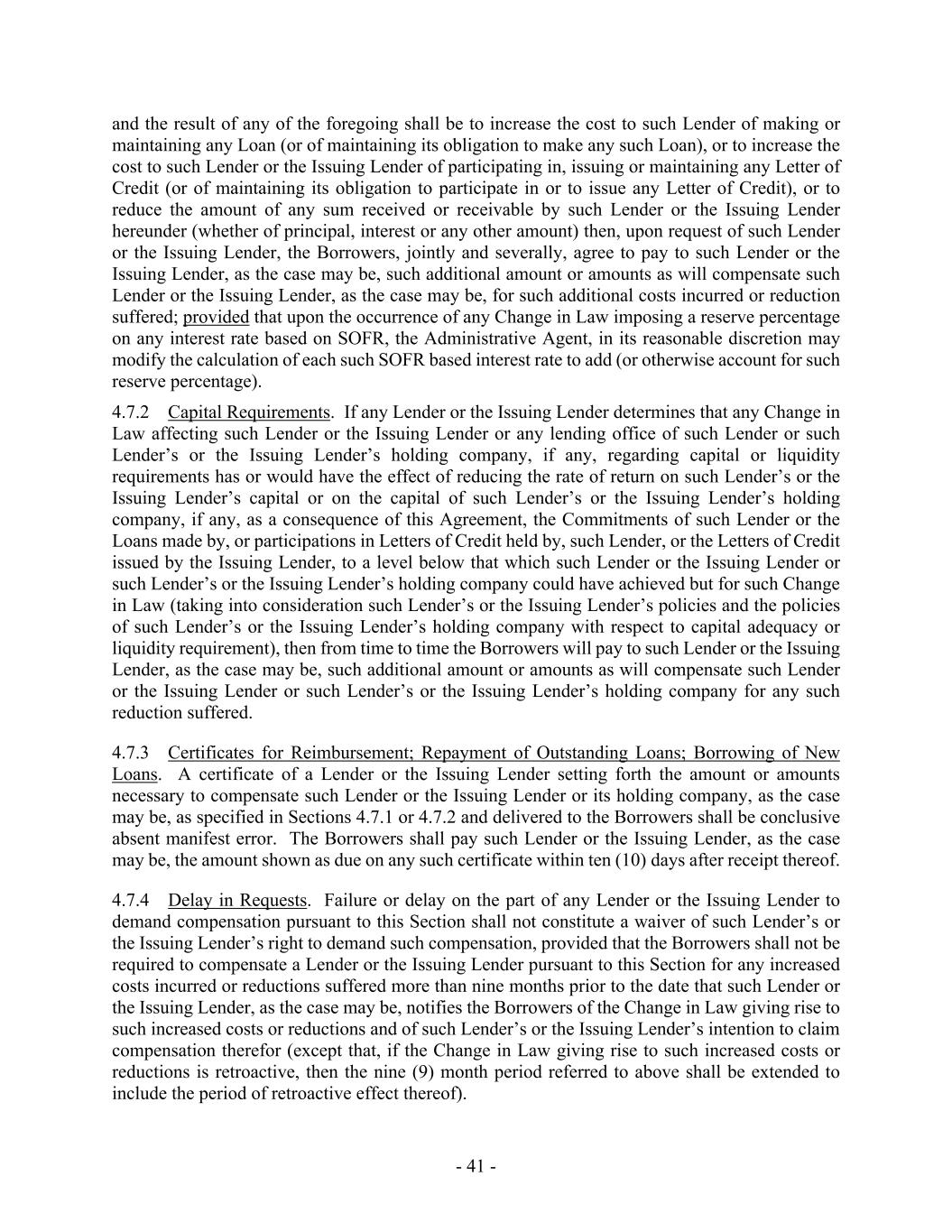 - 41 - and the result of any of the foregoing shall be to increase the cost to such Lender of making or maintaining any Loan (or of maintaining its obligation to make any such Loan), or to increase the cost to such Lender or the Issuing Lender of participating in, issuing or maintaining any Letter of Credit (or of maintaining its obligation to participate in or to issue any Letter of Credit), or to reduce the amount of any sum received or receivable by such Lender or the Issuing Lender hereunder (whether of principal, interest or any other amount) then, upon request of such Lender or the Issuing Lender, the Borrowers, jointly and severally, agree to pay to such Lender or the Issuing Lender, as the case may be, such additional amount or amounts as will compensate such Lender or the Issuing Lender, as the case may be, for such additional costs incurred or reduction suffered; provided that upon the occurrence of any Change in Law imposing a reserve percentage on any interest rate based on SOFR, the Administrative Agent, in its reasonable discretion may modify the calculation of each such SOFR based interest rate to add (or otherwise account for such reserve percentage). 4.7.2 Capital Requirements. If any Lender or the Issuing Lender determines that any Change in Law affecting such Lender or the Issuing Lender or any lending office of such Lender or such Lender’s or the Issuing Lender’s holding company, if any, regarding capital or liquidity requirements has or would have the effect of reducing the rate of return on such Lender’s or the Issuing Lender’s capital or on the capital of such Lender’s or the Issuing Lender’s holding company, if any, as a consequence of this Agreement, the Commitments of such Lender or the Loans made by, or participations in Letters of Credit held by, such Lender, or the Letters of Credit issued by the Issuing Lender, to a level below that which such Lender or the Issuing Lender or such Lender’s or the Issuing Lender’s holding company could have achieved but for such Change in Law (taking into consideration such Lender’s or the Issuing Lender’s policies and the policies of such Lender’s or the Issuing Lender’s holding company with respect to capital adequacy or liquidity requirement), then from time to time the Borrowers will pay to such Lender or the Issuing Lender, as the case may be, such additional amount or amounts as will compensate such Lender or the Issuing Lender or such Lender’s or the Issuing Lender’s holding company for any such reduction suffered. 4.7.3 Certificates for Reimbursement; Repayment of Outstanding Loans; Borrowing of New Loans. A certificate of a Lender or the Issuing Lender setting forth the amount or amounts necessary to compensate such Lender or the Issuing Lender or its holding company, as the case may be, as specified in Sections 4.7.1 or 4.7.2 and delivered to the Borrowers shall be conclusive absent manifest error. The Borrowers shall pay such Lender or the Issuing Lender, as the case may be, the amount shown as due on any such certificate within ten (10) days after receipt thereof. 4.7.4 Delay in Requests. Failure or delay on the part of any Lender or the Issuing Lender to demand compensation pursuant to this Section shall not constitute a waiver of such Lender’s or the Issuing Lender’s right to demand such compensation, provided that the Borrowers shall not be required to compensate a Lender or the Issuing Lender pursuant to this Section for any increased costs incurred or reductions suffered more than nine months prior to the date that such Lender or the Issuing Lender, as the case may be, notifies the Borrowers of the Change in Law giving rise to such increased costs or reductions and of such Lender’s or the Issuing Lender’s intention to claim compensation therefor (except that, if the Change in Law giving rise to such increased costs or reductions is retroactive, then the nine (9) month period referred to above shall be extended to include the period of retroactive effect thereof).