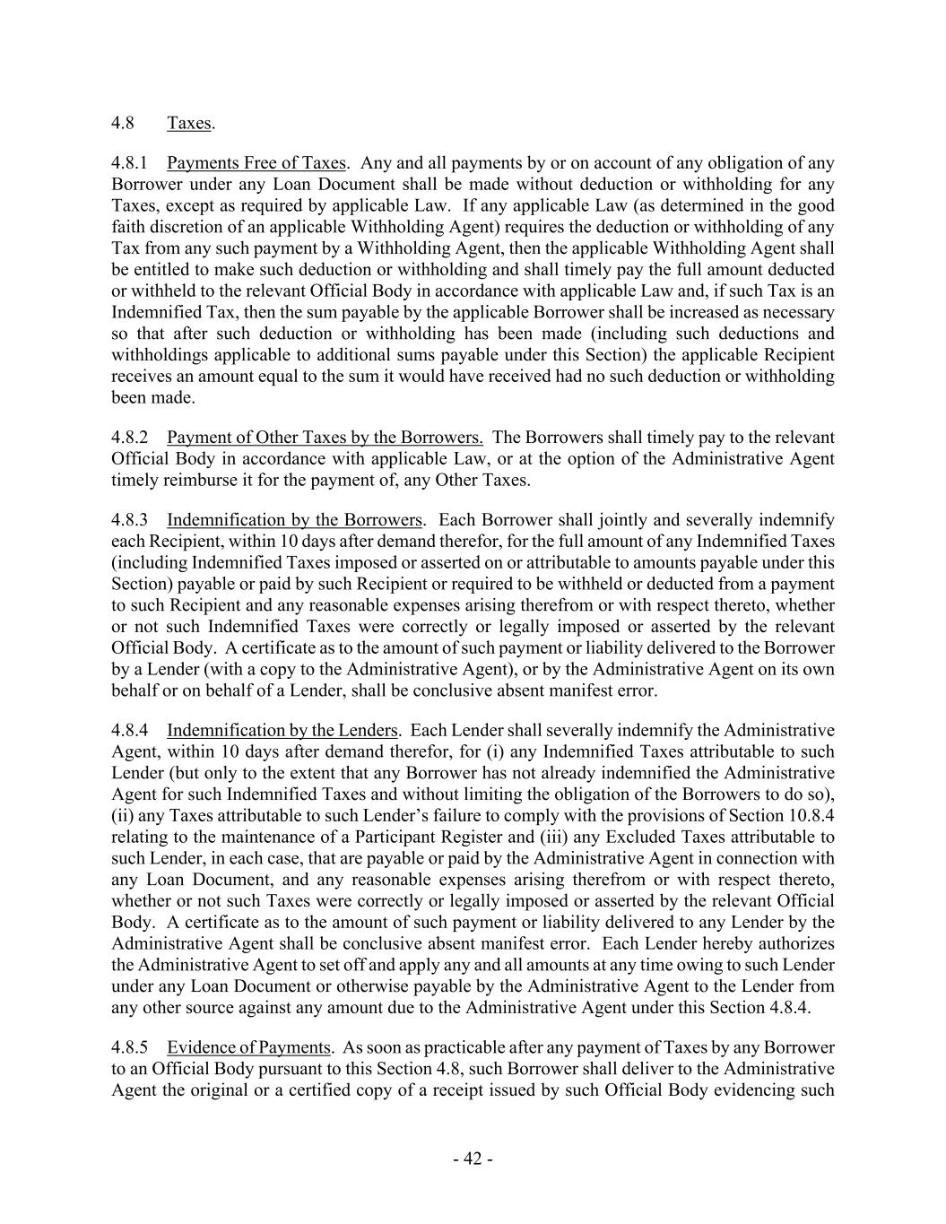 - 42 - 4.8 Taxes. 4.8.1 Payments Free of Taxes. Any and all payments by or on account of any obligation of any Borrower under any Loan Document shall be made without deduction or withholding for any Taxes, except as required by applicable Law. If any applicable Law (as determined in the good faith discretion of an applicable Withholding Agent) requires the deduction or withholding of any Tax from any such payment by a Withholding Agent, then the applicable Withholding Agent shall be entitled to make such deduction or withholding and shall timely pay the full amount deducted or withheld to the relevant Official Body in accordance with applicable Law and, if such Tax is an Indemnified Tax, then the sum payable by the applicable Borrower shall be increased as necessary so that after such deduction or withholding has been made (including such deductions and withholdings applicable to additional sums payable under this Section) the applicable Recipient receives an amount equal to the sum it would have received had no such deduction or withholding been made. 4.8.2 Payment of Other Taxes by the Borrowers. The Borrowers shall timely pay to the relevant Official Body in accordance with applicable Law, or at the option of the Administrative Agent timely reimburse it for the payment of, any Other Taxes. 4.8.3 Indemnification by the Borrowers. Each Borrower shall jointly and severally indemnify each Recipient, within 10 days after demand therefor, for the full amount of any Indemnified Taxes (including Indemnified Taxes imposed or asserted on or attributable to amounts payable under this Section) payable or paid by such Recipient or required to be withheld or deducted from a payment to such Recipient and any reasonable expenses arising therefrom or with respect thereto, whether or not such Indemnified Taxes were correctly or legally imposed or asserted by the relevant Official Body. A certificate as to the amount of such payment or liability delivered to the Borrower by a Lender (with a copy to the Administrative Agent), or by the Administrative Agent on its own behalf or on behalf of a Lender, shall be conclusive absent manifest error. 4.8.4 Indemnification by the Lenders. Each Lender shall severally indemnify the Administrative Agent, within 10 days after demand therefor, for (i) any Indemnified Taxes attributable to such Lender (but only to the extent that any Borrower has not already indemnified the Administrative Agent for such Indemnified Taxes and without limiting the obligation of the Borrowers to do so), (ii) any Taxes attributable to such Lender’s failure to comply with the provisions of Section 10.8.4 relating to the maintenance of a Participant Register and (iii) any Excluded Taxes attributable to such Lender, in each case, that are payable or paid by the Administrative Agent in connection with any Loan Document, and any reasonable expenses arising therefrom or with respect thereto, whether or not such Taxes were correctly or legally imposed or asserted by the relevant Official Body. A certificate as to the amount of such payment or liability delivered to any Lender by the Administrative Agent shall be conclusive absent manifest error. Each Lender hereby authorizes the Administrative Agent to set off and apply any and all amounts at any time owing to such Lender under any Loan Document or otherwise payable by the Administrative Agent to the Lender from any other source against any amount due to the Administrative Agent under this Section 4.8.4. 4.8.5 Evidence of Payments. As soon as practicable after any payment of Taxes by any Borrower to an Official Body pursuant to this Section 4.8, such Borrower shall deliver to the Administrative Agent the original or a certified copy of a receipt issued by such Official Body evidencing such