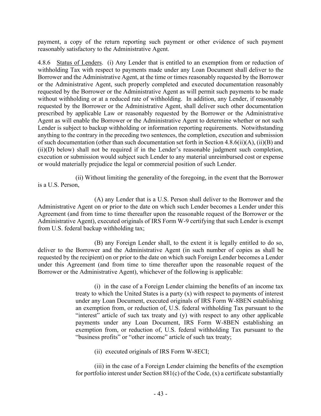 - 43 - payment, a copy of the return reporting such payment or other evidence of such payment reasonably satisfactory to the Administrative Agent. 4.8.6 Status of Lenders. (i) Any Lender that is entitled to an exemption from or reduction of withholding Tax with respect to payments made under any Loan Document shall deliver to the Borrower and the Administrative Agent, at the time or times reasonably requested by the Borrower or the Administrative Agent, such properly completed and executed documentation reasonably requested by the Borrower or the Administrative Agent as will permit such payments to be made without withholding or at a reduced rate of withholding. In addition, any Lender, if reasonably requested by the Borrower or the Administrative Agent, shall deliver such other documentation prescribed by applicable Law or reasonably requested by the Borrower or the Administrative Agent as will enable the Borrower or the Administrative Agent to determine whether or not such Lender is subject to backup withholding or information reporting requirements. Notwithstanding anything to the contrary in the preceding two sentences, the completion, execution and submission of such documentation (other than such documentation set forth in Section 4.8.6(ii)(A), (ii)(B) and (ii)(D) below) shall not be required if in the Lender’s reasonable judgment such completion, execution or submission would subject such Lender to any material unreimbursed cost or expense or would materially prejudice the legal or commercial position of such Lender. (ii) Without limiting the generality of the foregoing, in the event that the Borrower is a U.S. Person, (A) any Lender that is a U.S. Person shall deliver to the Borrower and the Administrative Agent on or prior to the date on which such Lender becomes a Lender under this Agreement (and from time to time thereafter upon the reasonable request of the Borrower or the Administrative Agent), executed originals of IRS Form W-9 certifying that such Lender is exempt from U.S. federal backup withholding tax; (B) any Foreign Lender shall, to the extent it is legally entitled to do so, deliver to the Borrower and the Administrative Agent (in such number of copies as shall be requested by the recipient) on or prior to the date on which such Foreign Lender becomes a Lender under this Agreement (and from time to time thereafter upon the reasonable request of the Borrower or the Administrative Agent), whichever of the following is applicable: (i) in the case of a Foreign Lender claiming the benefits of an income tax treaty to which the United States is a party (x) with respect to payments of interest under any Loan Document, executed originals of IRS Form W-8BEN establishing an exemption from, or reduction of, U.S. federal withholding Tax pursuant to the “interest” article of such tax treaty and (y) with respect to any other applicable payments under any Loan Document, IRS Form W-8BEN establishing an exemption from, or reduction of, U.S. federal withholding Tax pursuant to the “business profits” or “other income” article of such tax treaty; (ii) executed originals of IRS Form W-8ECI; (iii) in the case of a Foreign Lender claiming the benefits of the exemption for portfolio interest under Section 881(c) of the Code, (x) a certificate substantially