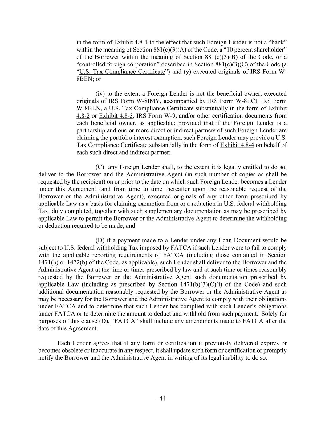 - 44 - in the form of Exhibit 4.8-1 to the effect that such Foreign Lender is not a “bank” within the meaning of Section 881(c)(3)(A) of the Code, a “10 percent shareholder” of the Borrower within the meaning of Section 881(c)(3)(B) of the Code, or a “controlled foreign corporation” described in Section 881(c)(3)(C) of the Code (a “U.S. Tax Compliance Certificate”) and (y) executed originals of IRS Form W- 8BEN; or (iv) to the extent a Foreign Lender is not the beneficial owner, executed originals of IRS Form W-8IMY, accompanied by IRS Form W-8ECI, IRS Form W-8BEN, a U.S. Tax Compliance Certificate substantially in the form of Exhibit 4.8-2 or Exhibit 4.8-3, IRS Form W-9, and/or other certification documents from each beneficial owner, as applicable; provided that if the Foreign Lender is a partnership and one or more direct or indirect partners of such Foreign Lender are claiming the portfolio interest exemption, such Foreign Lender may provide a U.S. Tax Compliance Certificate substantially in the form of Exhibit 4.8-4 on behalf of each such direct and indirect partner; (C) any Foreign Lender shall, to the extent it is legally entitled to do so, deliver to the Borrower and the Administrative Agent (in such number of copies as shall be requested by the recipient) on or prior to the date on which such Foreign Lender becomes a Lender under this Agreement (and from time to time thereafter upon the reasonable request of the Borrower or the Administrative Agent), executed originals of any other form prescribed by applicable Law as a basis for claiming exemption from or a reduction in U.S. federal withholding Tax, duly completed, together with such supplementary documentation as may be prescribed by applicable Law to permit the Borrower or the Administrative Agent to determine the withholding or deduction required to be made; and (D) if a payment made to a Lender under any Loan Document would be subject to U.S. federal withholding Tax imposed by FATCA if such Lender were to fail to comply with the applicable reporting requirements of FATCA (including those contained in Section 1471(b) or 1472(b) of the Code, as applicable), such Lender shall deliver to the Borrower and the Administrative Agent at the time or times prescribed by law and at such time or times reasonably requested by the Borrower or the Administrative Agent such documentation prescribed by applicable Law (including as prescribed by Section 1471(b)(3)(C)(i) of the Code) and such additional documentation reasonably requested by the Borrower or the Administrative Agent as may be necessary for the Borrower and the Administrative Agent to comply with their obligations under FATCA and to determine that such Lender has complied with such Lender’s obligations under FATCA or to determine the amount to deduct and withhold from such payment. Solely for purposes of this clause (D), “FATCA” shall include any amendments made to FATCA after the date of this Agreement. Each Lender agrees that if any form or certification it previously delivered expires or becomes obsolete or inaccurate in any respect, it shall update such form or certification or promptly notify the Borrower and the Administrative Agent in writing of its legal inability to do so.