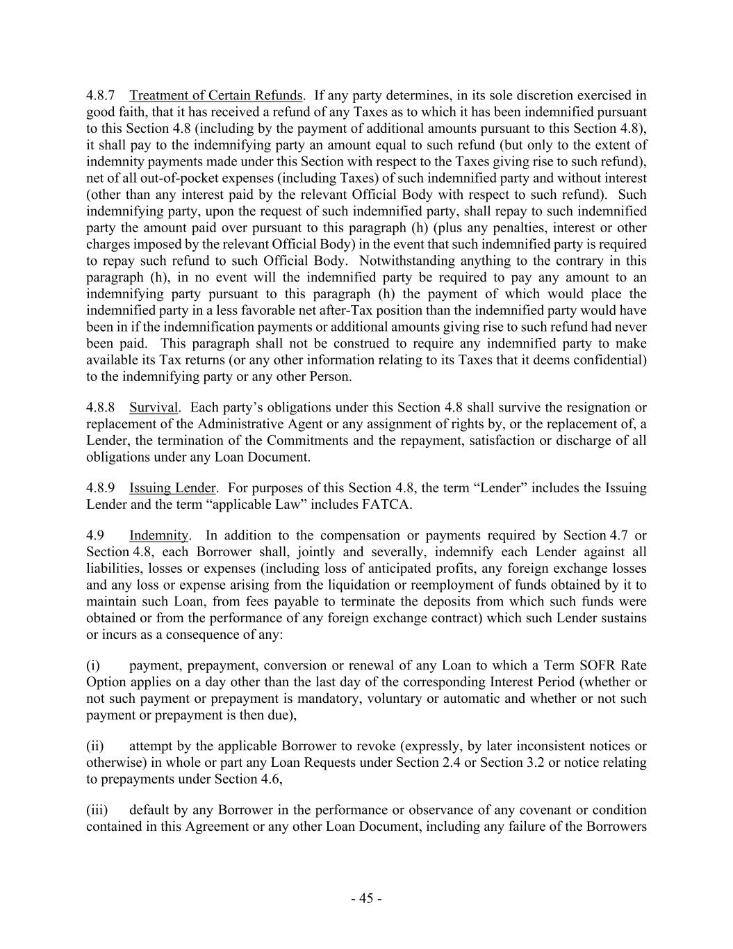 - 45 - 4.8.7 Treatment of Certain Refunds. If any party determines, in its sole discretion exercised in good faith, that it has received a refund of any Taxes as to which it has been indemnified pursuant to this Section 4.8 (including by the payment of additional amounts pursuant to this Section 4.8), it shall pay to the indemnifying party an amount equal to such refund (but only to the extent of indemnity payments made under this Section with respect to the Taxes giving rise to such refund), net of all out-of-pocket expenses (including Taxes) of such indemnified party and without interest (other than any interest paid by the relevant Official Body with respect to such refund). Such indemnifying party, upon the request of such indemnified party, shall repay to such indemnified party the amount paid over pursuant to this paragraph (h) (plus any penalties, interest or other charges imposed by the relevant Official Body) in the event that such indemnified party is required to repay such refund to such Official Body. Notwithstanding anything to the contrary in this paragraph (h), in no event will the indemnified party be required to pay any amount to an indemnifying party pursuant to this paragraph (h) the payment of which would place the indemnified party in a less favorable net after-Tax position than the indemnified party would have been in if the indemnification payments or additional amounts giving rise to such refund had never been paid. This paragraph shall not be construed to require any indemnified party to make available its Tax returns (or any other information relating to its Taxes that it deems confidential) to the indemnifying party or any other Person. 4.8.8 Survival. Each party’s obligations under this Section 4.8 shall survive the resignation or replacement of the Administrative Agent or any assignment of rights by, or the replacement of, a Lender, the termination of the Commitments and the repayment, satisfaction or discharge of all obligations under any Loan Document. 4.8.9 Issuing Lender. For purposes of this Section 4.8, the term “Lender” includes the Issuing Lender and the term “applicable Law” includes FATCA. 4.9 Indemnity. In addition to the compensation or payments required by Section 4.7 or Section 4.8, each Borrower shall, jointly and severally, indemnify each Lender against all liabilities, losses or expenses (including loss of anticipated profits, any foreign exchange losses and any loss or expense arising from the liquidation or reemployment of funds obtained by it to maintain such Loan, from fees payable to terminate the deposits from which such funds were obtained or from the performance of any foreign exchange contract) which such Lender sustains or incurs as a consequence of any: (i) payment, prepayment, conversion or renewal of any Loan to which a Term SOFR Rate Option applies on a day other than the last day of the corresponding Interest Period (whether or not such payment or prepayment is mandatory, voluntary or automatic and whether or not such payment or prepayment is then due), (ii) attempt by the applicable Borrower to revoke (expressly, by later inconsistent notices or otherwise) in whole or part any Loan Requests under Section 2.4 or Section 3.2 or notice relating to prepayments under Section 4.6, (iii) default by any Borrower in the performance or observance of any covenant or condition contained in this Agreement or any other Loan Document, including any failure of the Borrowers