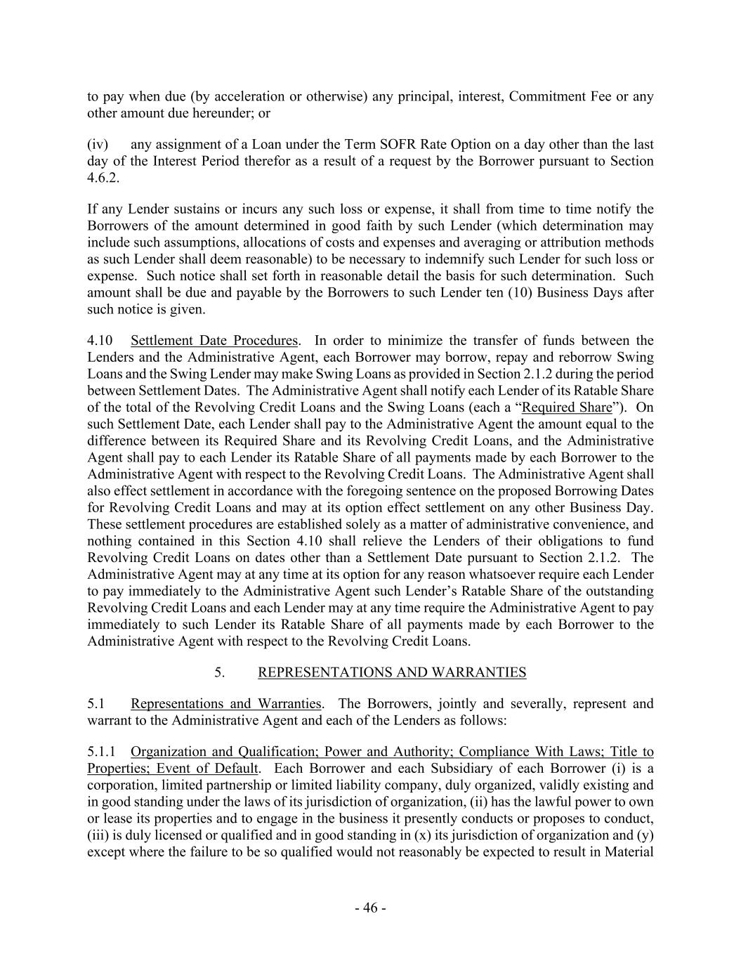 - 46 - to pay when due (by acceleration or otherwise) any principal, interest, Commitment Fee or any other amount due hereunder; or (iv) any assignment of a Loan under the Term SOFR Rate Option on a day other than the last day of the Interest Period therefor as a result of a request by the Borrower pursuant to Section 4.6.2. If any Lender sustains or incurs any such loss or expense, it shall from time to time notify the Borrowers of the amount determined in good faith by such Lender (which determination may include such assumptions, allocations of costs and expenses and averaging or attribution methods as such Lender shall deem reasonable) to be necessary to indemnify such Lender for such loss or expense. Such notice shall set forth in reasonable detail the basis for such determination. Such amount shall be due and payable by the Borrowers to such Lender ten (10) Business Days after such notice is given. 4.10 Settlement Date Procedures. In order to minimize the transfer of funds between the Lenders and the Administrative Agent, each Borrower may borrow, repay and reborrow Swing Loans and the Swing Lender may make Swing Loans as provided in Section 2.1.2 during the period between Settlement Dates. The Administrative Agent shall notify each Lender of its Ratable Share of the total of the Revolving Credit Loans and the Swing Loans (each a “Required Share”). On such Settlement Date, each Lender shall pay to the Administrative Agent the amount equal to the difference between its Required Share and its Revolving Credit Loans, and the Administrative Agent shall pay to each Lender its Ratable Share of all payments made by each Borrower to the Administrative Agent with respect to the Revolving Credit Loans. The Administrative Agent shall also effect settlement in accordance with the foregoing sentence on the proposed Borrowing Dates for Revolving Credit Loans and may at its option effect settlement on any other Business Day. These settlement procedures are established solely as a matter of administrative convenience, and nothing contained in this Section 4.10 shall relieve the Lenders of their obligations to fund Revolving Credit Loans on dates other than a Settlement Date pursuant to Section 2.1.2. The Administrative Agent may at any time at its option for any reason whatsoever require each Lender to pay immediately to the Administrative Agent such Lender’s Ratable Share of the outstanding Revolving Credit Loans and each Lender may at any time require the Administrative Agent to pay immediately to such Lender its Ratable Share of all payments made by each Borrower to the Administrative Agent with respect to the Revolving Credit Loans. 5. REPRESENTATIONS AND WARRANTIES 5.1 Representations and Warranties. The Borrowers, jointly and severally, represent and warrant to the Administrative Agent and each of the Lenders as follows: 5.1.1 Organization and Qualification; Power and Authority; Compliance With Laws; Title to Properties; Event of Default. Each Borrower and each Subsidiary of each Borrower (i) is a corporation, limited partnership or limited liability company, duly organized, validly existing and in good standing under the laws of its jurisdiction of organization, (ii) has the lawful power to own or lease its properties and to engage in the business it presently conducts or proposes to conduct, (iii) is duly licensed or qualified and in good standing in (x) its jurisdiction of organization and (y) except where the failure to be so qualified would not reasonably be expected to result in Material