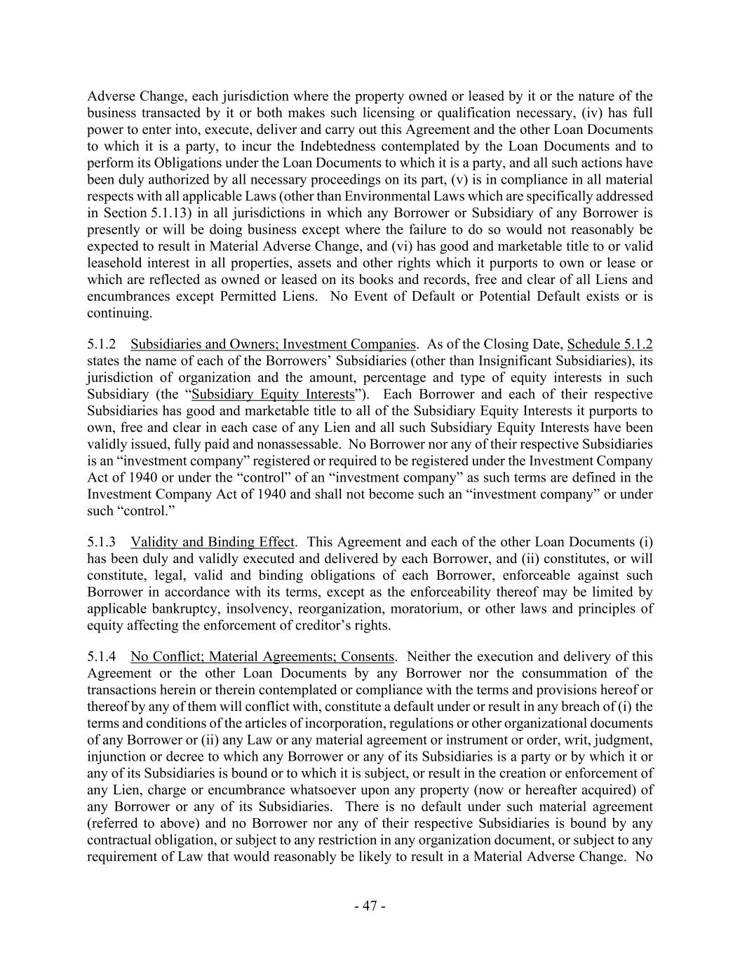 - 47 - Adverse Change, each jurisdiction where the property owned or leased by it or the nature of the business transacted by it or both makes such licensing or qualification necessary, (iv) has full power to enter into, execute, deliver and carry out this Agreement and the other Loan Documents to which it is a party, to incur the Indebtedness contemplated by the Loan Documents and to perform its Obligations under the Loan Documents to which it is a party, and all such actions have been duly authorized by all necessary proceedings on its part, (v) is in compliance in all material respects with all applicable Laws (other than Environmental Laws which are specifically addressed in Section 5.1.13) in all jurisdictions in which any Borrower or Subsidiary of any Borrower is presently or will be doing business except where the failure to do so would not reasonably be expected to result in Material Adverse Change, and (vi) has good and marketable title to or valid leasehold interest in all properties, assets and other rights which it purports to own or lease or which are reflected as owned or leased on its books and records, free and clear of all Liens and encumbrances except Permitted Liens. No Event of Default or Potential Default exists or is continuing. 5.1.2 Subsidiaries and Owners; Investment Companies. As of the Closing Date, Schedule 5.1.2 states the name of each of the Borrowers’ Subsidiaries (other than Insignificant Subsidiaries), its jurisdiction of organization and the amount, percentage and type of equity interests in such Subsidiary (the “Subsidiary Equity Interests”). Each Borrower and each of their respective Subsidiaries has good and marketable title to all of the Subsidiary Equity Interests it purports to own, free and clear in each case of any Lien and all such Subsidiary Equity Interests have been validly issued, fully paid and nonassessable. No Borrower nor any of their respective Subsidiaries is an “investment company” registered or required to be registered under the Investment Company Act of 1940 or under the “control” of an “investment company” as such terms are defined in the Investment Company Act of 1940 and shall not become such an “investment company” or under such “control.” 5.1.3 Validity and Binding Effect. This Agreement and each of the other Loan Documents (i) has been duly and validly executed and delivered by each Borrower, and (ii) constitutes, or will constitute, legal, valid and binding obligations of each Borrower, enforceable against such Borrower in accordance with its terms, except as the enforceability thereof may be limited by applicable bankruptcy, insolvency, reorganization, moratorium, or other laws and principles of equity affecting the enforcement of creditor’s rights. 5.1.4 No Conflict; Material Agreements; Consents. Neither the execution and delivery of this Agreement or the other Loan Documents by any Borrower nor the consummation of the transactions herein or therein contemplated or compliance with the terms and provisions hereof or thereof by any of them will conflict with, constitute a default under or result in any breach of (i) the terms and conditions of the articles of incorporation, regulations or other organizational documents of any Borrower or (ii) any Law or any material agreement or instrument or order, writ, judgment, injunction or decree to which any Borrower or any of its Subsidiaries is a party or by which it or any of its Subsidiaries is bound or to which it is subject, or result in the creation or enforcement of any Lien, charge or encumbrance whatsoever upon any property (now or hereafter acquired) of any Borrower or any of its Subsidiaries. There is no default under such material agreement (referred to above) and no Borrower nor any of their respective Subsidiaries is bound by any contractual obligation, or subject to any restriction in any organization document, or subject to any requirement of Law that would reasonably be likely to result in a Material Adverse Change. No