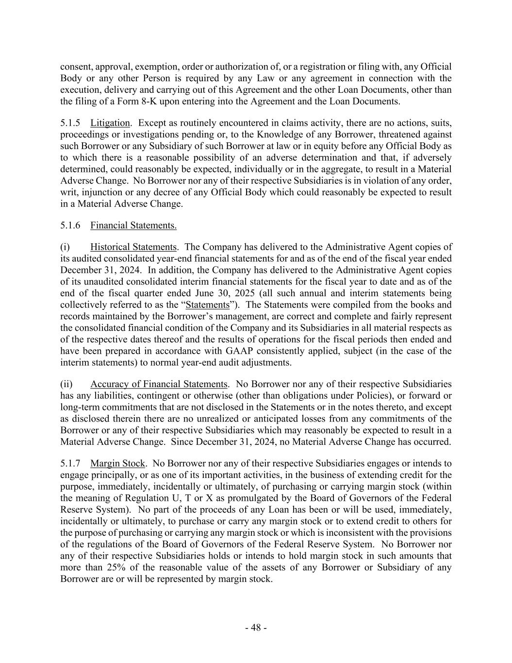 - 48 - consent, approval, exemption, order or authorization of, or a registration or filing with, any Official Body or any other Person is required by any Law or any agreement in connection with the execution, delivery and carrying out of this Agreement and the other Loan Documents, other than the filing of a Form 8-K upon entering into the Agreement and the Loan Documents. 5.1.5 Litigation. Except as routinely encountered in claims activity, there are no actions, suits, proceedings or investigations pending or, to the Knowledge of any Borrower, threatened against such Borrower or any Subsidiary of such Borrower at law or in equity before any Official Body as to which there is a reasonable possibility of an adverse determination and that, if adversely determined, could reasonably be expected, individually or in the aggregate, to result in a Material Adverse Change. No Borrower nor any of their respective Subsidiaries is in violation of any order, writ, injunction or any decree of any Official Body which could reasonably be expected to result in a Material Adverse Change. 5.1.6 Financial Statements. (i) Historical Statements. The Company has delivered to the Administrative Agent copies of its audited consolidated year-end financial statements for and as of the end of the fiscal year ended December 31, 2024. In addition, the Company has delivered to the Administrative Agent copies of its unaudited consolidated interim financial statements for the fiscal year to date and as of the end of the fiscal quarter ended June 30, 2025 (all such annual and interim statements being collectively referred to as the “Statements”). The Statements were compiled from the books and records maintained by the Borrower’s management, are correct and complete and fairly represent the consolidated financial condition of the Company and its Subsidiaries in all material respects as of the respective dates thereof and the results of operations for the fiscal periods then ended and have been prepared in accordance with GAAP consistently applied, subject (in the case of the interim statements) to normal year-end audit adjustments. (ii) Accuracy of Financial Statements. No Borrower nor any of their respective Subsidiaries has any liabilities, contingent or otherwise (other than obligations under Policies), or forward or long-term commitments that are not disclosed in the Statements or in the notes thereto, and except as disclosed therein there are no unrealized or anticipated losses from any commitments of the Borrower or any of their respective Subsidiaries which may reasonably be expected to result in a Material Adverse Change. Since December 31, 2024, no Material Adverse Change has occurred. 5.1.7 Margin Stock. No Borrower nor any of their respective Subsidiaries engages or intends to engage principally, or as one of its important activities, in the business of extending credit for the purpose, immediately, incidentally or ultimately, of purchasing or carrying margin stock (within the meaning of Regulation U, T or X as promulgated by the Board of Governors of the Federal Reserve System). No part of the proceeds of any Loan has been or will be used, immediately, incidentally or ultimately, to purchase or carry any margin stock or to extend credit to others for the purpose of purchasing or carrying any margin stock or which is inconsistent with the provisions of the regulations of the Board of Governors of the Federal Reserve System. No Borrower nor any of their respective Subsidiaries holds or intends to hold margin stock in such amounts that more than 25% of the reasonable value of the assets of any Borrower or Subsidiary of any Borrower are or will be represented by margin stock.