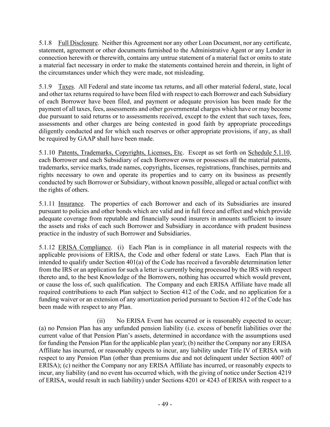 - 49 - 5.1.8 Full Disclosure. Neither this Agreement nor any other Loan Document, nor any certificate, statement, agreement or other documents furnished to the Administrative Agent or any Lender in connection herewith or therewith, contains any untrue statement of a material fact or omits to state a material fact necessary in order to make the statements contained herein and therein, in light of the circumstances under which they were made, not misleading. 5.1.9 Taxes. All Federal and state income tax returns, and all other material federal, state, local and other tax returns required to have been filed with respect to each Borrower and each Subsidiary of each Borrower have been filed, and payment or adequate provision has been made for the payment of all taxes, fees, assessments and other governmental charges which have or may become due pursuant to said returns or to assessments received, except to the extent that such taxes, fees, assessments and other charges are being contested in good faith by appropriate proceedings diligently conducted and for which such reserves or other appropriate provisions, if any, as shall be required by GAAP shall have been made. 5.1.10 Patents, Trademarks, Copyrights, Licenses, Etc. Except as set forth on Schedule 5.1.10, each Borrower and each Subsidiary of each Borrower owns or possesses all the material patents, trademarks, service marks, trade names, copyrights, licenses, registrations, franchises, permits and rights necessary to own and operate its properties and to carry on its business as presently conducted by such Borrower or Subsidiary, without known possible, alleged or actual conflict with the rights of others. 5.1.11 Insurance. The properties of each Borrower and each of its Subsidiaries are insured pursuant to policies and other bonds which are valid and in full force and effect and which provide adequate coverage from reputable and financially sound insurers in amounts sufficient to insure the assets and risks of each such Borrower and Subsidiary in accordance with prudent business practice in the industry of such Borrower and Subsidiaries. 5.1.12 ERISA Compliance. (i) Each Plan is in compliance in all material respects with the applicable provisions of ERISA, the Code and other federal or state Laws. Each Plan that is intended to qualify under Section 401(a) of the Code has received a favorable determination letter from the IRS or an application for such a letter is currently being processed by the IRS with respect thereto and, to the best Knowledge of the Borrowers, nothing has occurred which would prevent, or cause the loss of, such qualification. The Company and each ERISA Affiliate have made all required contributions to each Plan subject to Section 412 of the Code, and no application for a funding waiver or an extension of any amortization period pursuant to Section 412 of the Code has been made with respect to any Plan. (ii) No ERISA Event has occurred or is reasonably expected to occur; (a) no Pension Plan has any unfunded pension liability (i.e. excess of benefit liabilities over the current value of that Pension Plan’s assets, determined in accordance with the assumptions used for funding the Pension Plan for the applicable plan year); (b) neither the Company nor any ERISA Affiliate has incurred, or reasonably expects to incur, any liability under Title IV of ERISA with respect to any Pension Plan (other than premiums due and not delinquent under Section 4007 of ERISA); (c) neither the Company nor any ERISA Affiliate has incurred, or reasonably expects to incur, any liability (and no event has occurred which, with the giving of notice under Section 4219 of ERISA, would result in such liability) under Sections 4201 or 4243 of ERISA with respect to a