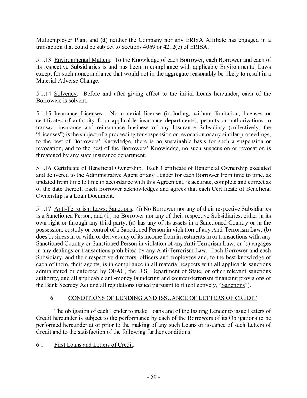 - 50 - Multiemployer Plan; and (d) neither the Company nor any ERISA Affiliate has engaged in a transaction that could be subject to Sections 4069 or 4212(c) of ERISA. 5.1.13 Environmental Matters. To the Knowledge of each Borrower, each Borrower and each of its respective Subsidiaries is and has been in compliance with applicable Environmental Laws except for such noncompliance that would not in the aggregate reasonably be likely to result in a Material Adverse Change. 5.1.14 Solvency. Before and after giving effect to the initial Loans hereunder, each of the Borrowers is solvent. 5.1.15 Insurance Licenses. No material license (including, without limitation, licenses or certificates of authority from applicable insurance departments), permits or authorizations to transact insurance and reinsurance business of any Insurance Subsidiary (collectively, the “Licenses”) is the subject of a proceeding for suspension or revocation or any similar proceedings, to the best of Borrowers’ Knowledge, there is no sustainable basis for such a suspension or revocation, and to the best of the Borrowers’ Knowledge, no such suspension or revocation is threatened by any state insurance department. 5.1.16 Certificate of Beneficial Ownership. Each Certificate of Beneficial Ownership executed and delivered to the Administrative Agent or any Lender for each Borrower from time to time, as updated from time to time in accordance with this Agreement, is accurate, complete and correct as of the date thereof. Each Borrower acknowledges and agrees that each Certificate of Beneficial Ownership is a Loan Document. 5.1.17 Anti-Terrorism Laws; Sanctions. (i) No Borrower nor any of their respective Subsidiaries is a Sanctioned Person, and (ii) no Borrower nor any of their respective Subsidiaries, either in its own right or through any third party, (a) has any of its assets in a Sanctioned Country or in the possession, custody or control of a Sanctioned Person in violation of any Anti-Terrorism Law, (b) does business in or with, or derives any of its income from investments in or transactions with, any Sanctioned Country or Sanctioned Person in violation of any Anti-Terrorism Law; or (c) engages in any dealings or transactions prohibited by any Anti-Terrorism Law. Each Borrower and each Subsidiary, and their respective directors, officers and employees and, to the best knowledge of each of them, their agents, is in compliance in all material respects with all applicable sanctions administered or enforced by OFAC, the U.S. Department of State, or other relevant sanctions authority, and all applicable anti-money laundering and counter-terrorism financing provisions of the Bank Secrecy Act and all regulations issued pursuant to it (collectively, “Sanctions”). 6. CONDITIONS OF LENDING AND ISSUANCE OF LETTERS OF CREDIT The obligation of each Lender to make Loans and of the Issuing Lender to issue Letters of Credit hereunder is subject to the performance by each of the Borrowers of its Obligations to be performed hereunder at or prior to the making of any such Loans or issuance of such Letters of Credit and to the satisfaction of the following further conditions: 6.1 First Loans and Letters of Credit.