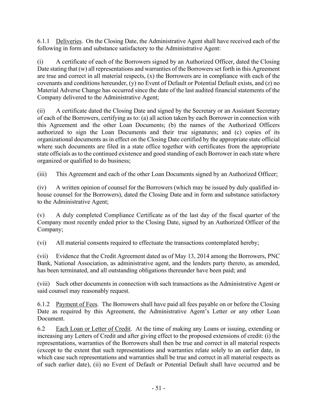 - 51 - 6.1.1 Deliveries. On the Closing Date, the Administrative Agent shall have received each of the following in form and substance satisfactory to the Administrative Agent: (i) A certificate of each of the Borrowers signed by an Authorized Officer, dated the Closing Date stating that (w) all representations and warranties of the Borrowers set forth in this Agreement are true and correct in all material respects, (x) the Borrowers are in compliance with each of the covenants and conditions hereunder, (y) no Event of Default or Potential Default exists, and (z) no Material Adverse Change has occurred since the date of the last audited financial statements of the Company delivered to the Administrative Agent; (ii) A certificate dated the Closing Date and signed by the Secretary or an Assistant Secretary of each of the Borrowers, certifying as to: (a) all action taken by each Borrower in connection with this Agreement and the other Loan Documents; (b) the names of the Authorized Officers authorized to sign the Loan Documents and their true signatures; and (c) copies of its organizational documents as in effect on the Closing Date certified by the appropriate state official where such documents are filed in a state office together with certificates from the appropriate state officials as to the continued existence and good standing of each Borrower in each state where organized or qualified to do business; (iii) This Agreement and each of the other Loan Documents signed by an Authorized Officer; (iv) A written opinion of counsel for the Borrowers (which may be issued by duly qualified in- house counsel for the Borrowers), dated the Closing Date and in form and substance satisfactory to the Administrative Agent; (v) A duly completed Compliance Certificate as of the last day of the fiscal quarter of the Company most recently ended prior to the Closing Date, signed by an Authorized Officer of the Company; (vi) All material consents required to effectuate the transactions contemplated hereby; (vii) Evidence that the Credit Agreement dated as of May 13, 2014 among the Borrowers, PNC Bank, National Association, as administrative agent, and the lenders party thereto, as amended, has been terminated, and all outstanding obligations thereunder have been paid; and (viii) Such other documents in connection with such transactions as the Administrative Agent or said counsel may reasonably request. 6.1.2 Payment of Fees. The Borrowers shall have paid all fees payable on or before the Closing Date as required by this Agreement, the Administrative Agent’s Letter or any other Loan Document. 6.2 Each Loan or Letter of Credit. At the time of making any Loans or issuing, extending or increasing any Letters of Credit and after giving effect to the proposed extensions of credit: (i) the representations, warranties of the Borrowers shall then be true and correct in all material respects (except to the extent that such representations and warranties relate solely to an earlier date, in which case such representations and warranties shall be true and correct in all material respects as of such earlier date), (ii) no Event of Default or Potential Default shall have occurred and be