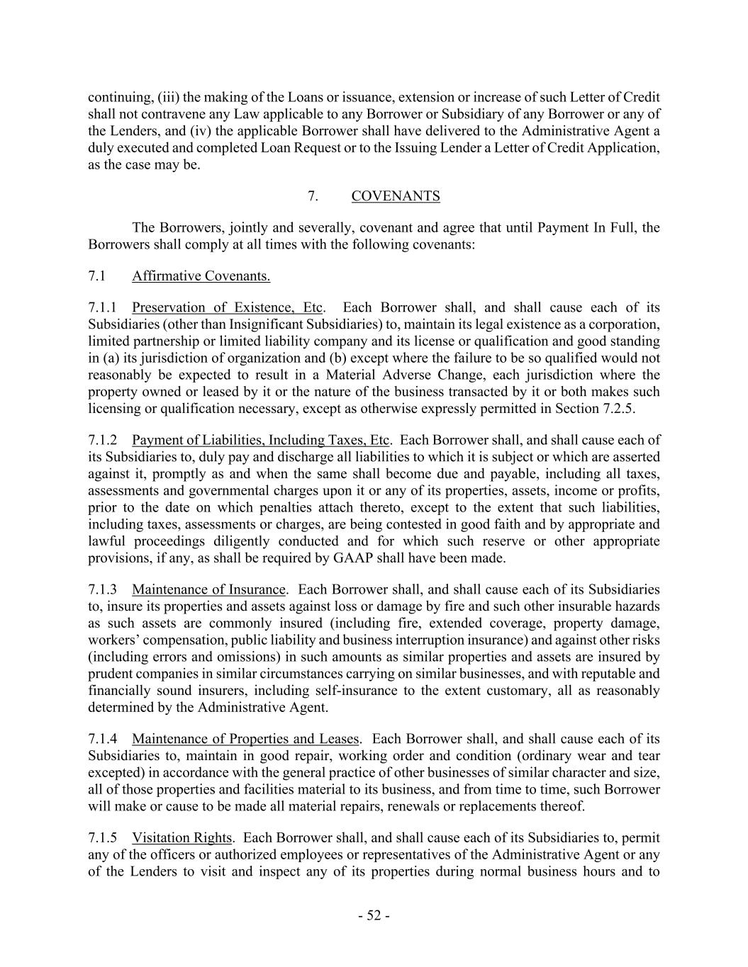 - 52 - continuing, (iii) the making of the Loans or issuance, extension or increase of such Letter of Credit shall not contravene any Law applicable to any Borrower or Subsidiary of any Borrower or any of the Lenders, and (iv) the applicable Borrower shall have delivered to the Administrative Agent a duly executed and completed Loan Request or to the Issuing Lender a Letter of Credit Application, as the case may be. 7. COVENANTS The Borrowers, jointly and severally, covenant and agree that until Payment In Full, the Borrowers shall comply at all times with the following covenants: 7.1 Affirmative Covenants. 7.1.1 Preservation of Existence, Etc. Each Borrower shall, and shall cause each of its Subsidiaries (other than Insignificant Subsidiaries) to, maintain its legal existence as a corporation, limited partnership or limited liability company and its license or qualification and good standing in (a) its jurisdiction of organization and (b) except where the failure to be so qualified would not reasonably be expected to result in a Material Adverse Change, each jurisdiction where the property owned or leased by it or the nature of the business transacted by it or both makes such licensing or qualification necessary, except as otherwise expressly permitted in Section 7.2.5. 7.1.2 Payment of Liabilities, Including Taxes, Etc. Each Borrower shall, and shall cause each of its Subsidiaries to, duly pay and discharge all liabilities to which it is subject or which are asserted against it, promptly as and when the same shall become due and payable, including all taxes, assessments and governmental charges upon it or any of its properties, assets, income or profits, prior to the date on which penalties attach thereto, except to the extent that such liabilities, including taxes, assessments or charges, are being contested in good faith and by appropriate and lawful proceedings diligently conducted and for which such reserve or other appropriate provisions, if any, as shall be required by GAAP shall have been made. 7.1.3 Maintenance of Insurance. Each Borrower shall, and shall cause each of its Subsidiaries to, insure its properties and assets against loss or damage by fire and such other insurable hazards as such assets are commonly insured (including fire, extended coverage, property damage, workers’ compensation, public liability and business interruption insurance) and against other risks (including errors and omissions) in such amounts as similar properties and assets are insured by prudent companies in similar circumstances carrying on similar businesses, and with reputable and financially sound insurers, including self-insurance to the extent customary, all as reasonably determined by the Administrative Agent. 7.1.4 Maintenance of Properties and Leases. Each Borrower shall, and shall cause each of its Subsidiaries to, maintain in good repair, working order and condition (ordinary wear and tear excepted) in accordance with the general practice of other businesses of similar character and size, all of those properties and facilities material to its business, and from time to time, such Borrower will make or cause to be made all material repairs, renewals or replacements thereof. 7.1.5 Visitation Rights. Each Borrower shall, and shall cause each of its Subsidiaries to, permit any of the officers or authorized employees or representatives of the Administrative Agent or any of the Lenders to visit and inspect any of its properties during normal business hours and to