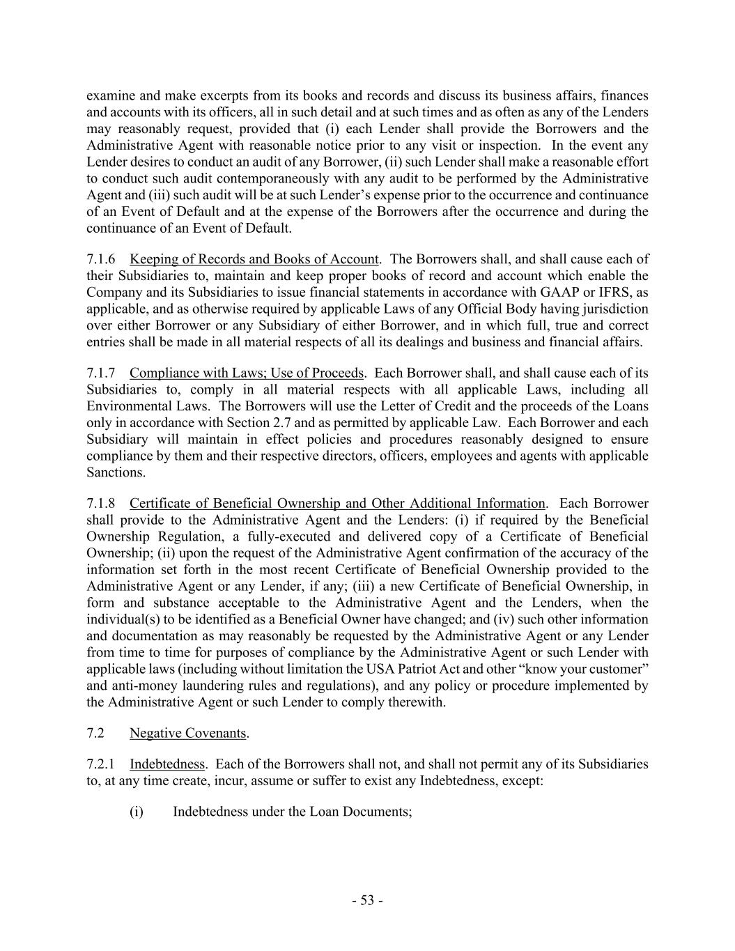 - 53 - examine and make excerpts from its books and records and discuss its business affairs, finances and accounts with its officers, all in such detail and at such times and as often as any of the Lenders may reasonably request, provided that (i) each Lender shall provide the Borrowers and the Administrative Agent with reasonable notice prior to any visit or inspection. In the event any Lender desires to conduct an audit of any Borrower, (ii) such Lender shall make a reasonable effort to conduct such audit contemporaneously with any audit to be performed by the Administrative Agent and (iii) such audit will be at such Lender’s expense prior to the occurrence and continuance of an Event of Default and at the expense of the Borrowers after the occurrence and during the continuance of an Event of Default. 7.1.6 Keeping of Records and Books of Account. The Borrowers shall, and shall cause each of their Subsidiaries to, maintain and keep proper books of record and account which enable the Company and its Subsidiaries to issue financial statements in accordance with GAAP or IFRS, as applicable, and as otherwise required by applicable Laws of any Official Body having jurisdiction over either Borrower or any Subsidiary of either Borrower, and in which full, true and correct entries shall be made in all material respects of all its dealings and business and financial affairs. 7.1.7 Compliance with Laws; Use of Proceeds. Each Borrower shall, and shall cause each of its Subsidiaries to, comply in all material respects with all applicable Laws, including all Environmental Laws. The Borrowers will use the Letter of Credit and the proceeds of the Loans only in accordance with Section 2.7 and as permitted by applicable Law. Each Borrower and each Subsidiary will maintain in effect policies and procedures reasonably designed to ensure compliance by them and their respective directors, officers, employees and agents with applicable Sanctions. 7.1.8 Certificate of Beneficial Ownership and Other Additional Information. Each Borrower shall provide to the Administrative Agent and the Lenders: (i) if required by the Beneficial Ownership Regulation, a fully-executed and delivered copy of a Certificate of Beneficial Ownership; (ii) upon the request of the Administrative Agent confirmation of the accuracy of the information set forth in the most recent Certificate of Beneficial Ownership provided to the Administrative Agent or any Lender, if any; (iii) a new Certificate of Beneficial Ownership, in form and substance acceptable to the Administrative Agent and the Lenders, when the individual(s) to be identified as a Beneficial Owner have changed; and (iv) such other information and documentation as may reasonably be requested by the Administrative Agent or any Lender from time to time for purposes of compliance by the Administrative Agent or such Lender with applicable laws (including without limitation the USA Patriot Act and other “know your customer” and anti-money laundering rules and regulations), and any policy or procedure implemented by the Administrative Agent or such Lender to comply therewith. 7.2 Negative Covenants. 7.2.1 Indebtedness. Each of the Borrowers shall not, and shall not permit any of its Subsidiaries to, at any time create, incur, assume or suffer to exist any Indebtedness, except: (i) Indebtedness under the Loan Documents;