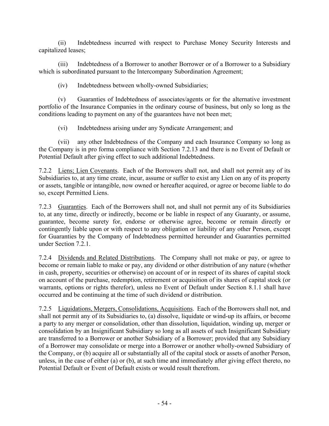 - 54 - (ii) Indebtedness incurred with respect to Purchase Money Security Interests and capitalized leases; (iii) Indebtedness of a Borrower to another Borrower or of a Borrower to a Subsidiary which is subordinated pursuant to the Intercompany Subordination Agreement; (iv) Indebtedness between wholly-owned Subsidiaries; (v) Guaranties of Indebtedness of associates/agents or for the alternative investment portfolio of the Insurance Companies in the ordinary course of business, but only so long as the conditions leading to payment on any of the guarantees have not been met; (vi) Indebtedness arising under any Syndicate Arrangement; and (vii) any other Indebtedness of the Company and each Insurance Company so long as the Company is in pro forma compliance with Section 7.2.13 and there is no Event of Default or Potential Default after giving effect to such additional Indebtedness. 7.2.2 Liens; Lien Covenants. Each of the Borrowers shall not, and shall not permit any of its Subsidiaries to, at any time create, incur, assume or suffer to exist any Lien on any of its property or assets, tangible or intangible, now owned or hereafter acquired, or agree or become liable to do so, except Permitted Liens. 7.2.3 Guaranties. Each of the Borrowers shall not, and shall not permit any of its Subsidiaries to, at any time, directly or indirectly, become or be liable in respect of any Guaranty, or assume, guarantee, become surety for, endorse or otherwise agree, become or remain directly or contingently liable upon or with respect to any obligation or liability of any other Person, except for Guaranties by the Company of Indebtedness permitted hereunder and Guaranties permitted under Section 7.2.1. 7.2.4 Dividends and Related Distributions. The Company shall not make or pay, or agree to become or remain liable to make or pay, any dividend or other distribution of any nature (whether in cash, property, securities or otherwise) on account of or in respect of its shares of capital stock on account of the purchase, redemption, retirement or acquisition of its shares of capital stock (or warrants, options or rights therefor), unless no Event of Default under Section 8.1.1 shall have occurred and be continuing at the time of such dividend or distribution. 7.2.5 Liquidations, Mergers, Consolidations, Acquisitions. Each of the Borrowers shall not, and shall not permit any of its Subsidiaries to, (a) dissolve, liquidate or wind-up its affairs, or become a party to any merger or consolidation, other than dissolution, liquidation, winding up, merger or consolidation by an Insignificant Subsidiary so long as all assets of such Insignificant Subsidiary are transferred to a Borrower or another Subsidiary of a Borrower; provided that any Subsidiary of a Borrower may consolidate or merge into a Borrower or another wholly-owned Subsidiary of the Company, or (b) acquire all or substantially all of the capital stock or assets of another Person, unless, in the case of either (a) or (b), at such time and immediately after giving effect thereto, no Potential Default or Event of Default exists or would result therefrom.
