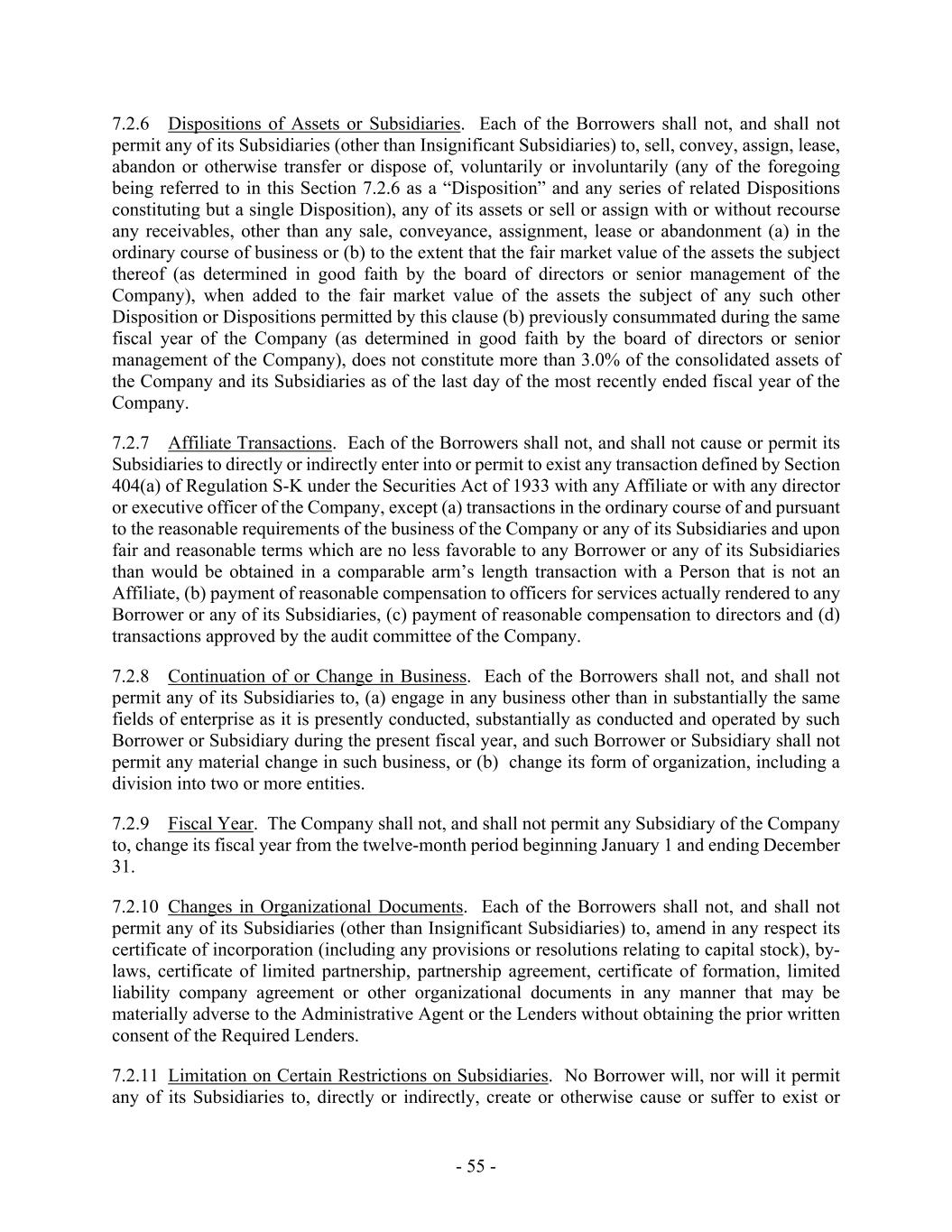 - 55 - 7.2.6 Dispositions of Assets or Subsidiaries. Each of the Borrowers shall not, and shall not permit any of its Subsidiaries (other than Insignificant Subsidiaries) to, sell, convey, assign, lease, abandon or otherwise transfer or dispose of, voluntarily or involuntarily (any of the foregoing being referred to in this Section 7.2.6 as a “Disposition” and any series of related Dispositions constituting but a single Disposition), any of its assets or sell or assign with or without recourse any receivables, other than any sale, conveyance, assignment, lease or abandonment (a) in the ordinary course of business or (b) to the extent that the fair market value of the assets the subject thereof (as determined in good faith by the board of directors or senior management of the Company), when added to the fair market value of the assets the subject of any such other Disposition or Dispositions permitted by this clause (b) previously consummated during the same fiscal year of the Company (as determined in good faith by the board of directors or senior management of the Company), does not constitute more than 3.0% of the consolidated assets of the Company and its Subsidiaries as of the last day of the most recently ended fiscal year of the Company. 7.2.7 Affiliate Transactions. Each of the Borrowers shall not, and shall not cause or permit its Subsidiaries to directly or indirectly enter into or permit to exist any transaction defined by Section 404(a) of Regulation S-K under the Securities Act of 1933 with any Affiliate or with any director or executive officer of the Company, except (a) transactions in the ordinary course of and pursuant to the reasonable requirements of the business of the Company or any of its Subsidiaries and upon fair and reasonable terms which are no less favorable to any Borrower or any of its Subsidiaries than would be obtained in a comparable arm’s length transaction with a Person that is not an Affiliate, (b) payment of reasonable compensation to officers for services actually rendered to any Borrower or any of its Subsidiaries, (c) payment of reasonable compensation to directors and (d) transactions approved by the audit committee of the Company. 7.2.8 Continuation of or Change in Business. Each of the Borrowers shall not, and shall not permit any of its Subsidiaries to, (a) engage in any business other than in substantially the same fields of enterprise as it is presently conducted, substantially as conducted and operated by such Borrower or Subsidiary during the present fiscal year, and such Borrower or Subsidiary shall not permit any material change in such business, or (b) change its form of organization, including a division into two or more entities. 7.2.9 Fiscal Year. The Company shall not, and shall not permit any Subsidiary of the Company to, change its fiscal year from the twelve-month period beginning January 1 and ending December 31. 7.2.10 Changes in Organizational Documents. Each of the Borrowers shall not, and shall not permit any of its Subsidiaries (other than Insignificant Subsidiaries) to, amend in any respect its certificate of incorporation (including any provisions or resolutions relating to capital stock), by- laws, certificate of limited partnership, partnership agreement, certificate of formation, limited liability company agreement or other organizational documents in any manner that may be materially adverse to the Administrative Agent or the Lenders without obtaining the prior written consent of the Required Lenders. 7.2.11 Limitation on Certain Restrictions on Subsidiaries. No Borrower will, nor will it permit any of its Subsidiaries to, directly or indirectly, create or otherwise cause or suffer to exist or