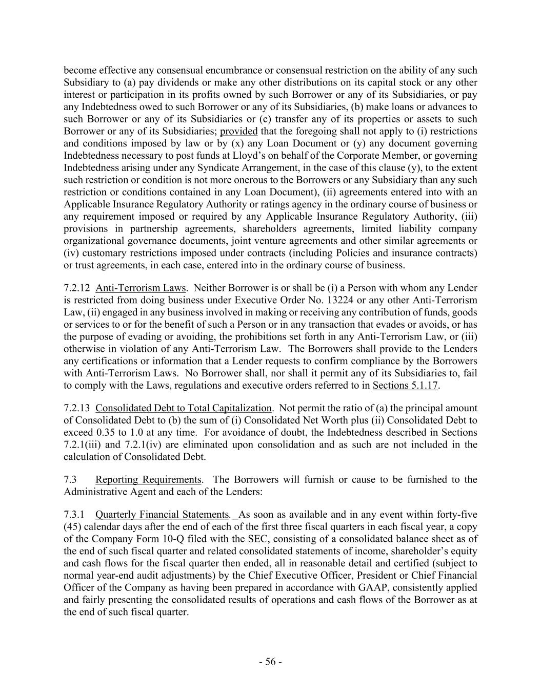 - 56 - become effective any consensual encumbrance or consensual restriction on the ability of any such Subsidiary to (a) pay dividends or make any other distributions on its capital stock or any other interest or participation in its profits owned by such Borrower or any of its Subsidiaries, or pay any Indebtedness owed to such Borrower or any of its Subsidiaries, (b) make loans or advances to such Borrower or any of its Subsidiaries or (c) transfer any of its properties or assets to such Borrower or any of its Subsidiaries; provided that the foregoing shall not apply to (i) restrictions and conditions imposed by law or by (x) any Loan Document or (y) any document governing Indebtedness necessary to post funds at Lloyd’s on behalf of the Corporate Member, or governing Indebtedness arising under any Syndicate Arrangement, in the case of this clause (y), to the extent such restriction or condition is not more onerous to the Borrowers or any Subsidiary than any such restriction or conditions contained in any Loan Document), (ii) agreements entered into with an Applicable Insurance Regulatory Authority or ratings agency in the ordinary course of business or any requirement imposed or required by any Applicable Insurance Regulatory Authority, (iii) provisions in partnership agreements, shareholders agreements, limited liability company organizational governance documents, joint venture agreements and other similar agreements or (iv) customary restrictions imposed under contracts (including Policies and insurance contracts) or trust agreements, in each case, entered into in the ordinary course of business. 7.2.12 Anti-Terrorism Laws. Neither Borrower is or shall be (i) a Person with whom any Lender is restricted from doing business under Executive Order No. 13224 or any other Anti-Terrorism Law, (ii) engaged in any business involved in making or receiving any contribution of funds, goods or services to or for the benefit of such a Person or in any transaction that evades or avoids, or has the purpose of evading or avoiding, the prohibitions set forth in any Anti-Terrorism Law, or (iii) otherwise in violation of any Anti-Terrorism Law. The Borrowers shall provide to the Lenders any certifications or information that a Lender requests to confirm compliance by the Borrowers with Anti-Terrorism Laws. No Borrower shall, nor shall it permit any of its Subsidiaries to, fail to comply with the Laws, regulations and executive orders referred to in Sections 5.1.17. 7.2.13 Consolidated Debt to Total Capitalization. Not permit the ratio of (a) the principal amount of Consolidated Debt to (b) the sum of (i) Consolidated Net Worth plus (ii) Consolidated Debt to exceed 0.35 to 1.0 at any time. For avoidance of doubt, the Indebtedness described in Sections 7.2.1(iii) and 7.2.1(iv) are eliminated upon consolidation and as such are not included in the calculation of Consolidated Debt. 7.3 Reporting Requirements. The Borrowers will furnish or cause to be furnished to the Administrative Agent and each of the Lenders: 7.3.1 Quarterly Financial Statements. As soon as available and in any event within forty-five (45) calendar days after the end of each of the first three fiscal quarters in each fiscal year, a copy of the Company Form 10-Q filed with the SEC, consisting of a consolidated balance sheet as of the end of such fiscal quarter and related consolidated statements of income, shareholder’s equity and cash flows for the fiscal quarter then ended, all in reasonable detail and certified (subject to normal year-end audit adjustments) by the Chief Executive Officer, President or Chief Financial Officer of the Company as having been prepared in accordance with GAAP, consistently applied and fairly presenting the consolidated results of operations and cash flows of the Borrower as at the end of such fiscal quarter.