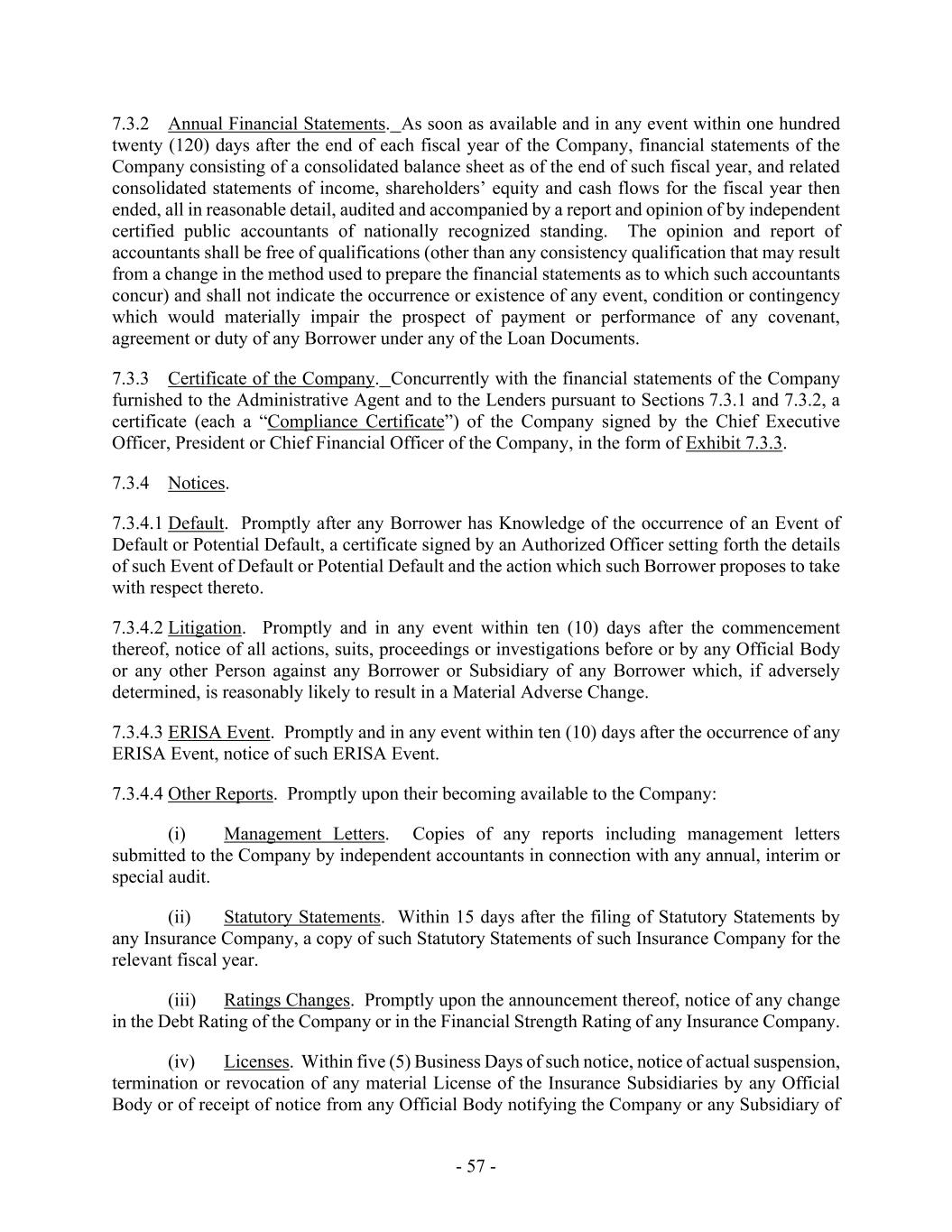 - 57 - 7.3.2 Annual Financial Statements. As soon as available and in any event within one hundred twenty (120) days after the end of each fiscal year of the Company, financial statements of the Company consisting of a consolidated balance sheet as of the end of such fiscal year, and related consolidated statements of income, shareholders’ equity and cash flows for the fiscal year then ended, all in reasonable detail, audited and accompanied by a report and opinion of by independent certified public accountants of nationally recognized standing. The opinion and report of accountants shall be free of qualifications (other than any consistency qualification that may result from a change in the method used to prepare the financial statements as to which such accountants concur) and shall not indicate the occurrence or existence of any event, condition or contingency which would materially impair the prospect of payment or performance of any covenant, agreement or duty of any Borrower under any of the Loan Documents. 7.3.3 Certificate of the Company. Concurrently with the financial statements of the Company furnished to the Administrative Agent and to the Lenders pursuant to Sections 7.3.1 and 7.3.2, a certificate (each a “Compliance Certificate”) of the Company signed by the Chief Executive Officer, President or Chief Financial Officer of the Company, in the form of Exhibit 7.3.3. 7.3.4 Notices. 7.3.4.1 Default. Promptly after any Borrower has Knowledge of the occurrence of an Event of Default or Potential Default, a certificate signed by an Authorized Officer setting forth the details of such Event of Default or Potential Default and the action which such Borrower proposes to take with respect thereto. 7.3.4.2 Litigation. Promptly and in any event within ten (10) days after the commencement thereof, notice of all actions, suits, proceedings or investigations before or by any Official Body or any other Person against any Borrower or Subsidiary of any Borrower which, if adversely determined, is reasonably likely to result in a Material Adverse Change. 7.3.4.3 ERISA Event. Promptly and in any event within ten (10) days after the occurrence of any ERISA Event, notice of such ERISA Event. 7.3.4.4 Other Reports. Promptly upon their becoming available to the Company: (i) Management Letters. Copies of any reports including management letters submitted to the Company by independent accountants in connection with any annual, interim or special audit. (ii) Statutory Statements. Within 15 days after the filing of Statutory Statements by any Insurance Company, a copy of such Statutory Statements of such Insurance Company for the relevant fiscal year. (iii) Ratings Changes. Promptly upon the announcement thereof, notice of any change in the Debt Rating of the Company or in the Financial Strength Rating of any Insurance Company. (iv) Licenses. Within five (5) Business Days of such notice, notice of actual suspension, termination or revocation of any material License of the Insurance Subsidiaries by any Official Body or of receipt of notice from any Official Body notifying the Company or any Subsidiary of