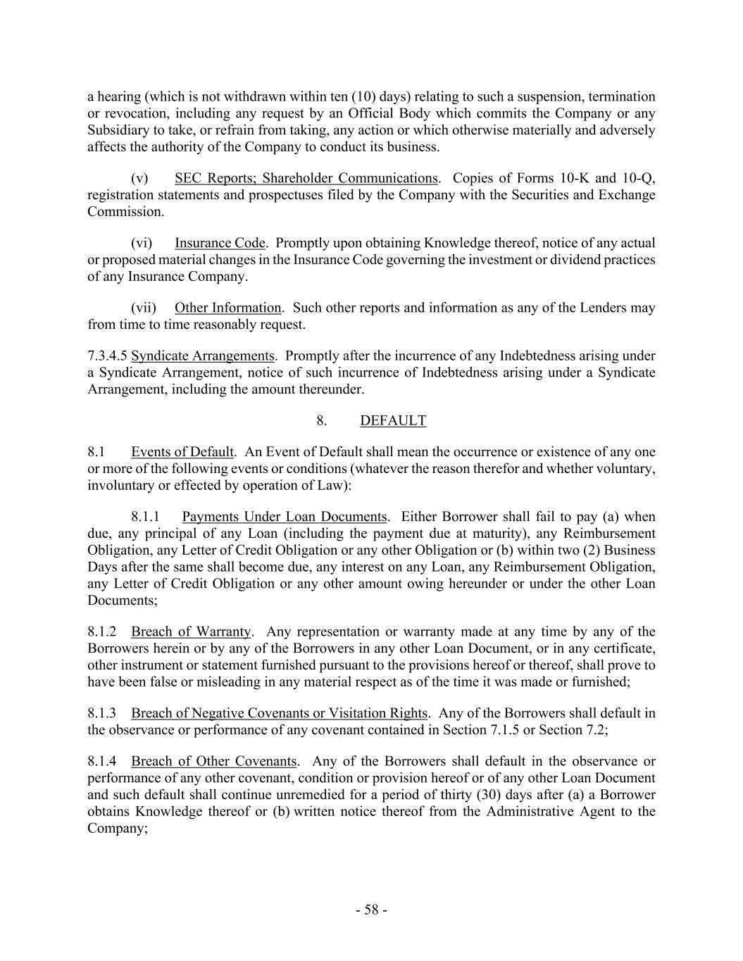 - 58 - a hearing (which is not withdrawn within ten (10) days) relating to such a suspension, termination or revocation, including any request by an Official Body which commits the Company or any Subsidiary to take, or refrain from taking, any action or which otherwise materially and adversely affects the authority of the Company to conduct its business. (v) SEC Reports; Shareholder Communications. Copies of Forms 10-K and 10-Q, registration statements and prospectuses filed by the Company with the Securities and Exchange Commission. (vi) Insurance Code. Promptly upon obtaining Knowledge thereof, notice of any actual or proposed material changes in the Insurance Code governing the investment or dividend practices of any Insurance Company. (vii) Other Information. Such other reports and information as any of the Lenders may from time to time reasonably request. 7.3.4.5 Syndicate Arrangements. Promptly after the incurrence of any Indebtedness arising under a Syndicate Arrangement, notice of such incurrence of Indebtedness arising under a Syndicate Arrangement, including the amount thereunder. 8. DEFAULT 8.1 Events of Default. An Event of Default shall mean the occurrence or existence of any one or more of the following events or conditions (whatever the reason therefor and whether voluntary, involuntary or effected by operation of Law): 8.1.1 Payments Under Loan Documents. Either Borrower shall fail to pay (a) when due, any principal of any Loan (including the payment due at maturity), any Reimbursement Obligation, any Letter of Credit Obligation or any other Obligation or (b) within two (2) Business Days after the same shall become due, any interest on any Loan, any Reimbursement Obligation, any Letter of Credit Obligation or any other amount owing hereunder or under the other Loan Documents; 8.1.2 Breach of Warranty. Any representation or warranty made at any time by any of the Borrowers herein or by any of the Borrowers in any other Loan Document, or in any certificate, other instrument or statement furnished pursuant to the provisions hereof or thereof, shall prove to have been false or misleading in any material respect as of the time it was made or furnished; 8.1.3 Breach of Negative Covenants or Visitation Rights. Any of the Borrowers shall default in the observance or performance of any covenant contained in Section 7.1.5 or Section 7.2; 8.1.4 Breach of Other Covenants. Any of the Borrowers shall default in the observance or performance of any other covenant, condition or provision hereof or of any other Loan Document and such default shall continue unremedied for a period of thirty (30) days after (a) a Borrower obtains Knowledge thereof or (b) written notice thereof from the Administrative Agent to the Company;