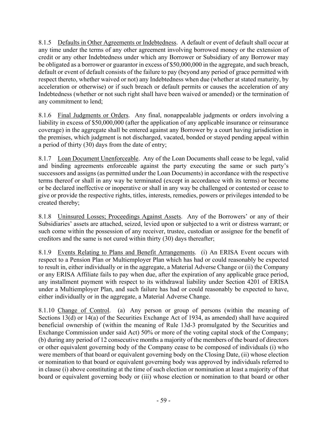 - 59 - 8.1.5 Defaults in Other Agreements or Indebtedness. A default or event of default shall occur at any time under the terms of any other agreement involving borrowed money or the extension of credit or any other Indebtedness under which any Borrower or Subsidiary of any Borrower may be obligated as a borrower or guarantor in excess of $50,000,000 in the aggregate, and such breach, default or event of default consists of the failure to pay (beyond any period of grace permitted with respect thereto, whether waived or not) any Indebtedness when due (whether at stated maturity, by acceleration or otherwise) or if such breach or default permits or causes the acceleration of any Indebtedness (whether or not such right shall have been waived or amended) or the termination of any commitment to lend; 8.1.6 Final Judgments or Orders. Any final, nonappealable judgments or orders involving a liability in excess of $50,000,000 (after the application of any applicable insurance or reinsurance coverage) in the aggregate shall be entered against any Borrower by a court having jurisdiction in the premises, which judgment is not discharged, vacated, bonded or stayed pending appeal within a period of thirty (30) days from the date of entry; 8.1.7 Loan Document Unenforceable. Any of the Loan Documents shall cease to be legal, valid and binding agreements enforceable against the party executing the same or such party’s successors and assigns (as permitted under the Loan Documents) in accordance with the respective terms thereof or shall in any way be terminated (except in accordance with its terms) or become or be declared ineffective or inoperative or shall in any way be challenged or contested or cease to give or provide the respective rights, titles, interests, remedies, powers or privileges intended to be created thereby; 8.1.8 Uninsured Losses; Proceedings Against Assets. Any of the Borrowers’ or any of their Subsidiaries’ assets are attached, seized, levied upon or subjected to a writ or distress warrant; or such come within the possession of any receiver, trustee, custodian or assignee for the benefit of creditors and the same is not cured within thirty (30) days thereafter; 8.1.9 Events Relating to Plans and Benefit Arrangements. (i) An ERISA Event occurs with respect to a Pension Plan or Multiemployer Plan which has had or could reasonably be expected to result in, either individually or in the aggregate, a Material Adverse Change or (ii) the Company or any ERISA Affiliate fails to pay when due, after the expiration of any applicable grace period, any installment payment with respect to its withdrawal liability under Section 4201 of ERISA under a Multiemployer Plan, and such failure has had or could reasonably be expected to have, either individually or in the aggregate, a Material Adverse Change. 8.1.10 Change of Control. (a) Any person or group of persons (within the meaning of Sections 13(d) or 14(a) of the Securities Exchange Act of 1934, as amended) shall have acquired beneficial ownership of (within the meaning of Rule 13d-3 promulgated by the Securities and Exchange Commission under said Act) 50% or more of the voting capital stock of the Company; (b) during any period of 12 consecutive months a majority of the members of the board of directors or other equivalent governing body of the Company cease to be composed of individuals (i) who were members of that board or equivalent governing body on the Closing Date, (ii) whose election or nomination to that board or equivalent governing body was approved by individuals referred to in clause (i) above constituting at the time of such election or nomination at least a majority of that board or equivalent governing body or (iii) whose election or nomination to that board or other