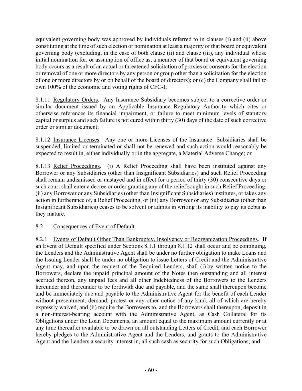 - 60 - equivalent governing body was approved by individuals referred to in clauses (i) and (ii) above constituting at the time of such election or nomination at least a majority of that board or equivalent governing body (excluding, in the case of both clause (ii) and clause (iii), any individual whose initial nomination for, or assumption of office as, a member of that board or equivalent governing body occurs as a result of an actual or threatened solicitation of proxies or consents for the election or removal of one or more directors by any person or group other than a solicitation for the election of one or more directors by or on behalf of the board of directors); or (c) the Company shall fail to own 100% of the economic and voting rights of CFC-I; 8.1.11 Regulatory Orders. Any Insurance Subsidiary becomes subject to a corrective order or similar document issued by an Applicable Insurance Regulatory Authority which cites or otherwise references its financial impairment, or failure to meet minimum levels of statutory capital or surplus and such failure is not cured within thirty (30) days of the date of such corrective order or similar document; 8.1.12 Insurance Licenses. Any one or more Licenses of the Insurance Subsidiaries shall be suspended, limited or terminated or shall not be renewed and such action would reasonably be expected to result in, either individually or in the aggregate, a Material Adverse Change; or 8.1.13 Relief Proceedings. (i) A Relief Proceeding shall have been instituted against any Borrower or any Subsidiaries (other than Insignificant Subsidiaries) and such Relief Proceeding shall remain undismissed or unstayed and in effect for a period of thirty (30) consecutive days or such court shall enter a decree or order granting any of the relief sought in such Relief Proceeding, (ii) any Borrower or any Subsidiaries (other than Insignificant Subsidiaries) institutes, or takes any action in furtherance of, a Relief Proceeding, or (iii) any Borrower or any Subsidiaries (other than Insignificant Subsidiaries) ceases to be solvent or admits in writing its inability to pay its debts as they mature. 8.2 Consequences of Event of Default. 8.2.1 Events of Default Other Than Bankruptcy, Insolvency or Reorganization Proceedings. If an Event of Default specified under Sections 8.1.1 through 8.1.12 shall occur and be continuing, the Lenders and the Administrative Agent shall be under no further obligation to make Loans and the Issuing Lender shall be under no obligation to issue Letters of Credit and the Administrative Agent may, and upon the request of the Required Lenders, shall (i) by written notice to the Borrowers, declare the unpaid principal amount of the Notes then outstanding and all interest accrued thereon, any unpaid fees and all other Indebtedness of the Borrowers to the Lenders hereunder and thereunder to be forthwith due and payable, and the same shall thereupon become and be immediately due and payable to the Administrative Agent for the benefit of each Lender without presentment, demand, protest or any other notice of any kind, all of which are hereby expressly waived, and (ii) require the Borrowers to, and the Borrowers shall thereupon, deposit in a non-interest-bearing account with the Administrative Agent, as Cash Collateral for its Obligations under the Loan Documents, an amount equal to the maximum amount currently or at any time thereafter available to be drawn on all outstanding Letters of Credit, and each Borrower hereby pledges to the Administrative Agent and the Lenders, and grants to the Administrative Agent and the Lenders a security interest in, all such cash as security for such Obligations; and