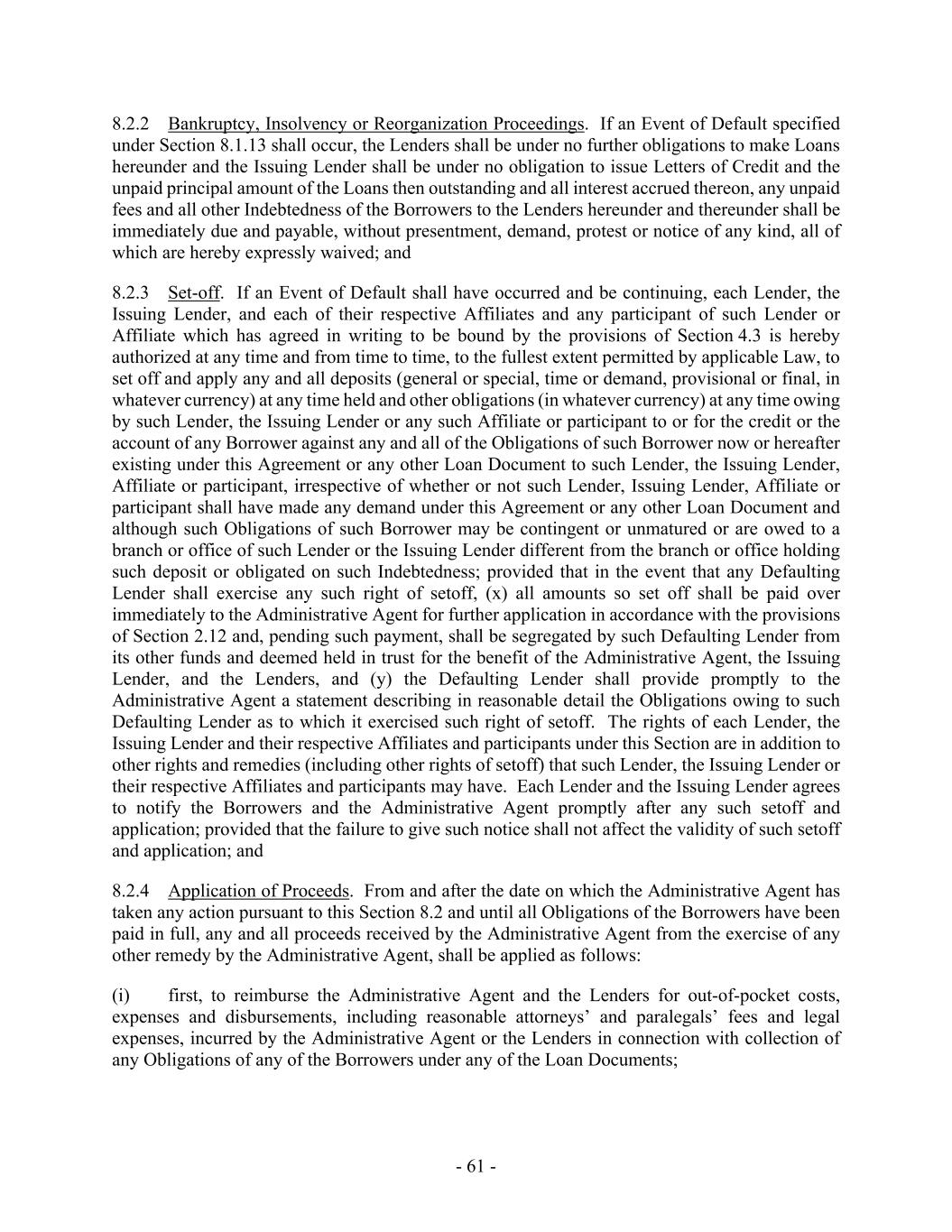 - 61 - 8.2.2 Bankruptcy, Insolvency or Reorganization Proceedings. If an Event of Default specified under Section 8.1.13 shall occur, the Lenders shall be under no further obligations to make Loans hereunder and the Issuing Lender shall be under no obligation to issue Letters of Credit and the unpaid principal amount of the Loans then outstanding and all interest accrued thereon, any unpaid fees and all other Indebtedness of the Borrowers to the Lenders hereunder and thereunder shall be immediately due and payable, without presentment, demand, protest or notice of any kind, all of which are hereby expressly waived; and 8.2.3 Set-off. If an Event of Default shall have occurred and be continuing, each Lender, the Issuing Lender, and each of their respective Affiliates and any participant of such Lender or Affiliate which has agreed in writing to be bound by the provisions of Section 4.3 is hereby authorized at any time and from time to time, to the fullest extent permitted by applicable Law, to set off and apply any and all deposits (general or special, time or demand, provisional or final, in whatever currency) at any time held and other obligations (in whatever currency) at any time owing by such Lender, the Issuing Lender or any such Affiliate or participant to or for the credit or the account of any Borrower against any and all of the Obligations of such Borrower now or hereafter existing under this Agreement or any other Loan Document to such Lender, the Issuing Lender, Affiliate or participant, irrespective of whether or not such Lender, Issuing Lender, Affiliate or participant shall have made any demand under this Agreement or any other Loan Document and although such Obligations of such Borrower may be contingent or unmatured or are owed to a branch or office of such Lender or the Issuing Lender different from the branch or office holding such deposit or obligated on such Indebtedness; provided that in the event that any Defaulting Lender shall exercise any such right of setoff, (x) all amounts so set off shall be paid over immediately to the Administrative Agent for further application in accordance with the provisions of Section 2.12 and, pending such payment, shall be segregated by such Defaulting Lender from its other funds and deemed held in trust for the benefit of the Administrative Agent, the Issuing Lender, and the Lenders, and (y) the Defaulting Lender shall provide promptly to the Administrative Agent a statement describing in reasonable detail the Obligations owing to such Defaulting Lender as to which it exercised such right of setoff. The rights of each Lender, the Issuing Lender and their respective Affiliates and participants under this Section are in addition to other rights and remedies (including other rights of setoff) that such Lender, the Issuing Lender or their respective Affiliates and participants may have. Each Lender and the Issuing Lender agrees to notify the Borrowers and the Administrative Agent promptly after any such setoff and application; provided that the failure to give such notice shall not affect the validity of such setoff and application; and 8.2.4 Application of Proceeds. From and after the date on which the Administrative Agent has taken any action pursuant to this Section 8.2 and until all Obligations of the Borrowers have been paid in full, any and all proceeds received by the Administrative Agent from the exercise of any other remedy by the Administrative Agent, shall be applied as follows: (i) first, to reimburse the Administrative Agent and the Lenders for out-of-pocket costs, expenses and disbursements, including reasonable attorneys’ and paralegals’ fees and legal expenses, incurred by the Administrative Agent or the Lenders in connection with collection of any Obligations of any of the Borrowers under any of the Loan Documents;