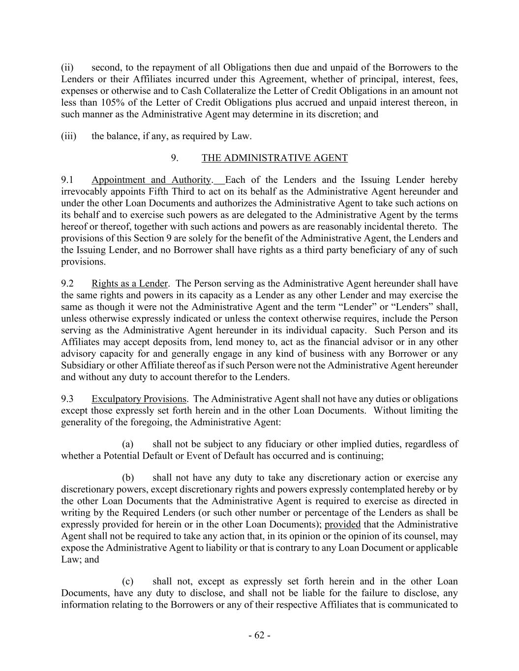 - 62 - (ii) second, to the repayment of all Obligations then due and unpaid of the Borrowers to the Lenders or their Affiliates incurred under this Agreement, whether of principal, interest, fees, expenses or otherwise and to Cash Collateralize the Letter of Credit Obligations in an amount not less than 105% of the Letter of Credit Obligations plus accrued and unpaid interest thereon, in such manner as the Administrative Agent may determine in its discretion; and (iii) the balance, if any, as required by Law. 9. THE ADMINISTRATIVE AGENT 9.1 Appointment and Authority. Each of the Lenders and the Issuing Lender hereby irrevocably appoints Fifth Third to act on its behalf as the Administrative Agent hereunder and under the other Loan Documents and authorizes the Administrative Agent to take such actions on its behalf and to exercise such powers as are delegated to the Administrative Agent by the terms hereof or thereof, together with such actions and powers as are reasonably incidental thereto. The provisions of this Section 9 are solely for the benefit of the Administrative Agent, the Lenders and the Issuing Lender, and no Borrower shall have rights as a third party beneficiary of any of such provisions. 9.2 Rights as a Lender. The Person serving as the Administrative Agent hereunder shall have the same rights and powers in its capacity as a Lender as any other Lender and may exercise the same as though it were not the Administrative Agent and the term “Lender” or “Lenders” shall, unless otherwise expressly indicated or unless the context otherwise requires, include the Person serving as the Administrative Agent hereunder in its individual capacity. Such Person and its Affiliates may accept deposits from, lend money to, act as the financial advisor or in any other advisory capacity for and generally engage in any kind of business with any Borrower or any Subsidiary or other Affiliate thereof as if such Person were not the Administrative Agent hereunder and without any duty to account therefor to the Lenders. 9.3 Exculpatory Provisions. The Administrative Agent shall not have any duties or obligations except those expressly set forth herein and in the other Loan Documents. Without limiting the generality of the foregoing, the Administrative Agent: (a) shall not be subject to any fiduciary or other implied duties, regardless of whether a Potential Default or Event of Default has occurred and is continuing; (b) shall not have any duty to take any discretionary action or exercise any discretionary powers, except discretionary rights and powers expressly contemplated hereby or by the other Loan Documents that the Administrative Agent is required to exercise as directed in writing by the Required Lenders (or such other number or percentage of the Lenders as shall be expressly provided for herein or in the other Loan Documents); provided that the Administrative Agent shall not be required to take any action that, in its opinion or the opinion of its counsel, may expose the Administrative Agent to liability or that is contrary to any Loan Document or applicable Law; and (c) shall not, except as expressly set forth herein and in the other Loan Documents, have any duty to disclose, and shall not be liable for the failure to disclose, any information relating to the Borrowers or any of their respective Affiliates that is communicated to