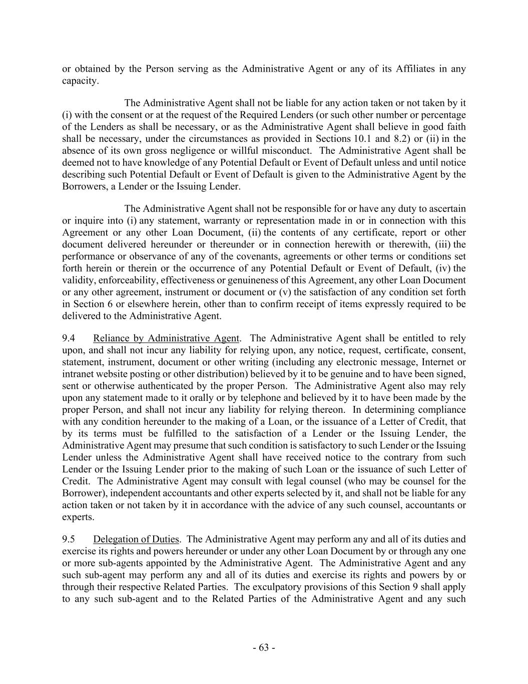 - 63 - or obtained by the Person serving as the Administrative Agent or any of its Affiliates in any capacity. The Administrative Agent shall not be liable for any action taken or not taken by it (i) with the consent or at the request of the Required Lenders (or such other number or percentage of the Lenders as shall be necessary, or as the Administrative Agent shall believe in good faith shall be necessary, under the circumstances as provided in Sections 10.1 and 8.2) or (ii) in the absence of its own gross negligence or willful misconduct. The Administrative Agent shall be deemed not to have knowledge of any Potential Default or Event of Default unless and until notice describing such Potential Default or Event of Default is given to the Administrative Agent by the Borrowers, a Lender or the Issuing Lender. The Administrative Agent shall not be responsible for or have any duty to ascertain or inquire into (i) any statement, warranty or representation made in or in connection with this Agreement or any other Loan Document, (ii) the contents of any certificate, report or other document delivered hereunder or thereunder or in connection herewith or therewith, (iii) the performance or observance of any of the covenants, agreements or other terms or conditions set forth herein or therein or the occurrence of any Potential Default or Event of Default, (iv) the validity, enforceability, effectiveness or genuineness of this Agreement, any other Loan Document or any other agreement, instrument or document or (v) the satisfaction of any condition set forth in Section 6 or elsewhere herein, other than to confirm receipt of items expressly required to be delivered to the Administrative Agent. 9.4 Reliance by Administrative Agent. The Administrative Agent shall be entitled to rely upon, and shall not incur any liability for relying upon, any notice, request, certificate, consent, statement, instrument, document or other writing (including any electronic message, Internet or intranet website posting or other distribution) believed by it to be genuine and to have been signed, sent or otherwise authenticated by the proper Person. The Administrative Agent also may rely upon any statement made to it orally or by telephone and believed by it to have been made by the proper Person, and shall not incur any liability for relying thereon. In determining compliance with any condition hereunder to the making of a Loan, or the issuance of a Letter of Credit, that by its terms must be fulfilled to the satisfaction of a Lender or the Issuing Lender, the Administrative Agent may presume that such condition is satisfactory to such Lender or the Issuing Lender unless the Administrative Agent shall have received notice to the contrary from such Lender or the Issuing Lender prior to the making of such Loan or the issuance of such Letter of Credit. The Administrative Agent may consult with legal counsel (who may be counsel for the Borrower), independent accountants and other experts selected by it, and shall not be liable for any action taken or not taken by it in accordance with the advice of any such counsel, accountants or experts. 9.5 Delegation of Duties. The Administrative Agent may perform any and all of its duties and exercise its rights and powers hereunder or under any other Loan Document by or through any one or more sub-agents appointed by the Administrative Agent. The Administrative Agent and any such sub-agent may perform any and all of its duties and exercise its rights and powers by or through their respective Related Parties. The exculpatory provisions of this Section 9 shall apply to any such sub-agent and to the Related Parties of the Administrative Agent and any such