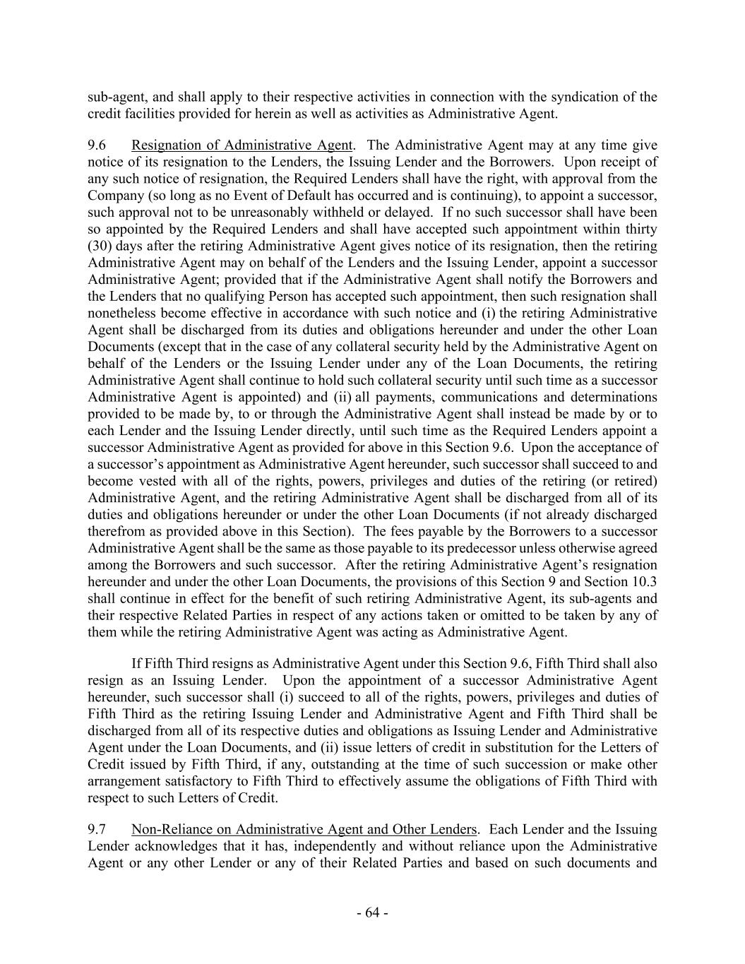 - 64 - sub-agent, and shall apply to their respective activities in connection with the syndication of the credit facilities provided for herein as well as activities as Administrative Agent. 9.6 Resignation of Administrative Agent. The Administrative Agent may at any time give notice of its resignation to the Lenders, the Issuing Lender and the Borrowers. Upon receipt of any such notice of resignation, the Required Lenders shall have the right, with approval from the Company (so long as no Event of Default has occurred and is continuing), to appoint a successor, such approval not to be unreasonably withheld or delayed. If no such successor shall have been so appointed by the Required Lenders and shall have accepted such appointment within thirty (30) days after the retiring Administrative Agent gives notice of its resignation, then the retiring Administrative Agent may on behalf of the Lenders and the Issuing Lender, appoint a successor Administrative Agent; provided that if the Administrative Agent shall notify the Borrowers and the Lenders that no qualifying Person has accepted such appointment, then such resignation shall nonetheless become effective in accordance with such notice and (i) the retiring Administrative Agent shall be discharged from its duties and obligations hereunder and under the other Loan Documents (except that in the case of any collateral security held by the Administrative Agent on behalf of the Lenders or the Issuing Lender under any of the Loan Documents, the retiring Administrative Agent shall continue to hold such collateral security until such time as a successor Administrative Agent is appointed) and (ii) all payments, communications and determinations provided to be made by, to or through the Administrative Agent shall instead be made by or to each Lender and the Issuing Lender directly, until such time as the Required Lenders appoint a successor Administrative Agent as provided for above in this Section 9.6. Upon the acceptance of a successor’s appointment as Administrative Agent hereunder, such successor shall succeed to and become vested with all of the rights, powers, privileges and duties of the retiring (or retired) Administrative Agent, and the retiring Administrative Agent shall be discharged from all of its duties and obligations hereunder or under the other Loan Documents (if not already discharged therefrom as provided above in this Section). The fees payable by the Borrowers to a successor Administrative Agent shall be the same as those payable to its predecessor unless otherwise agreed among the Borrowers and such successor. After the retiring Administrative Agent’s resignation hereunder and under the other Loan Documents, the provisions of this Section 9 and Section 10.3 shall continue in effect for the benefit of such retiring Administrative Agent, its sub-agents and their respective Related Parties in respect of any actions taken or omitted to be taken by any of them while the retiring Administrative Agent was acting as Administrative Agent. If Fifth Third resigns as Administrative Agent under this Section 9.6, Fifth Third shall also resign as an Issuing Lender. Upon the appointment of a successor Administrative Agent hereunder, such successor shall (i) succeed to all of the rights, powers, privileges and duties of Fifth Third as the retiring Issuing Lender and Administrative Agent and Fifth Third shall be discharged from all of its respective duties and obligations as Issuing Lender and Administrative Agent under the Loan Documents, and (ii) issue letters of credit in substitution for the Letters of Credit issued by Fifth Third, if any, outstanding at the time of such succession or make other arrangement satisfactory to Fifth Third to effectively assume the obligations of Fifth Third with respect to such Letters of Credit. 9.7 Non-Reliance on Administrative Agent and Other Lenders. Each Lender and the Issuing Lender acknowledges that it has, independently and without reliance upon the Administrative Agent or any other Lender or any of their Related Parties and based on such documents and