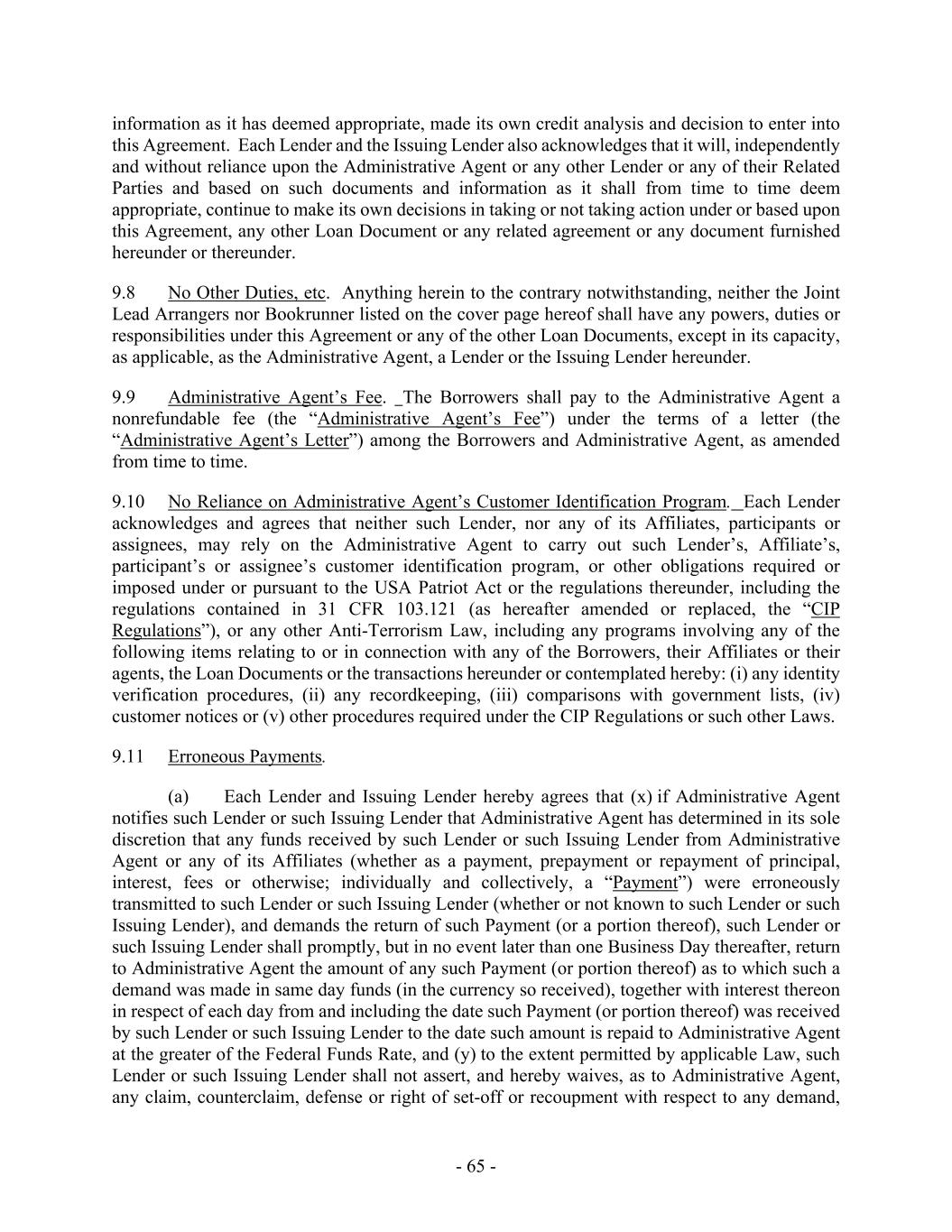 - 65 - information as it has deemed appropriate, made its own credit analysis and decision to enter into this Agreement. Each Lender and the Issuing Lender also acknowledges that it will, independently and without reliance upon the Administrative Agent or any other Lender or any of their Related Parties and based on such documents and information as it shall from time to time deem appropriate, continue to make its own decisions in taking or not taking action under or based upon this Agreement, any other Loan Document or any related agreement or any document furnished hereunder or thereunder. 9.8 No Other Duties, etc. Anything herein to the contrary notwithstanding, neither the Joint Lead Arrangers nor Bookrunner listed on the cover page hereof shall have any powers, duties or responsibilities under this Agreement or any of the other Loan Documents, except in its capacity, as applicable, as the Administrative Agent, a Lender or the Issuing Lender hereunder. 9.9 Administrative Agent’s Fee. The Borrowers shall pay to the Administrative Agent a nonrefundable fee (the “Administrative Agent’s Fee”) under the terms of a letter (the “Administrative Agent’s Letter”) among the Borrowers and Administrative Agent, as amended from time to time. 9.10 No Reliance on Administrative Agent’s Customer Identification Program. Each Lender acknowledges and agrees that neither such Lender, nor any of its Affiliates, participants or assignees, may rely on the Administrative Agent to carry out such Lender’s, Affiliate’s, participant’s or assignee’s customer identification program, or other obligations required or imposed under or pursuant to the USA Patriot Act or the regulations thereunder, including the regulations contained in 31 CFR 103.121 (as hereafter amended or replaced, the “CIP Regulations”), or any other Anti-Terrorism Law, including any programs involving any of the following items relating to or in connection with any of the Borrowers, their Affiliates or their agents, the Loan Documents or the transactions hereunder or contemplated hereby: (i) any identity verification procedures, (ii) any recordkeeping, (iii) comparisons with government lists, (iv) customer notices or (v) other procedures required under the CIP Regulations or such other Laws. 9.11 Erroneous Payments. (a) Each Lender and Issuing Lender hereby agrees that (x) if Administrative Agent notifies such Lender or such Issuing Lender that Administrative Agent has determined in its sole discretion that any funds received by such Lender or such Issuing Lender from Administrative Agent or any of its Affiliates (whether as a payment, prepayment or repayment of principal, interest, fees or otherwise; individually and collectively, a “Payment”) were erroneously transmitted to such Lender or such Issuing Lender (whether or not known to such Lender or such Issuing Lender), and demands the return of such Payment (or a portion thereof), such Lender or such Issuing Lender shall promptly, but in no event later than one Business Day thereafter, return to Administrative Agent the amount of any such Payment (or portion thereof) as to which such a demand was made in same day funds (in the currency so received), together with interest thereon in respect of each day from and including the date such Payment (or portion thereof) was received by such Lender or such Issuing Lender to the date such amount is repaid to Administrative Agent at the greater of the Federal Funds Rate, and (y) to the extent permitted by applicable Law, such Lender or such Issuing Lender shall not assert, and hereby waives, as to Administrative Agent, any claim, counterclaim, defense or right of set-off or recoupment with respect to any demand,