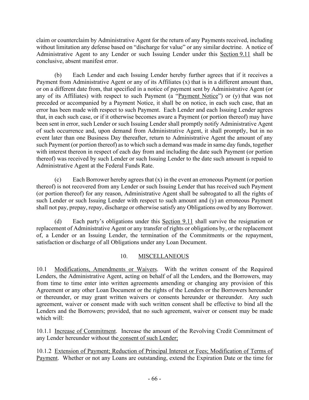 - 66 - claim or counterclaim by Administrative Agent for the return of any Payments received, including without limitation any defense based on “discharge for value” or any similar doctrine. A notice of Administrative Agent to any Lender or such Issuing Lender under this Section 9.11 shall be conclusive, absent manifest error. (b) Each Lender and each Issuing Lender hereby further agrees that if it receives a Payment from Administrative Agent or any of its Affiliates (x) that is in a different amount than, or on a different date from, that specified in a notice of payment sent by Administrative Agent (or any of its Affiliates) with respect to such Payment (a “Payment Notice”) or (y) that was not preceded or accompanied by a Payment Notice, it shall be on notice, in each such case, that an error has been made with respect to such Payment. Each Lender and each Issuing Lender agrees that, in each such case, or if it otherwise becomes aware a Payment (or portion thereof) may have been sent in error, such Lender or such Issuing Lender shall promptly notify Administrative Agent of such occurrence and, upon demand from Administrative Agent, it shall promptly, but in no event later than one Business Day thereafter, return to Administrative Agent the amount of any such Payment (or portion thereof) as to which such a demand was made in same day funds, together with interest thereon in respect of each day from and including the date such Payment (or portion thereof) was received by such Lender or such Issuing Lender to the date such amount is repaid to Administrative Agent at the Federal Funds Rate. (c) Each Borrower hereby agrees that (x) in the event an erroneous Payment (or portion thereof) is not recovered from any Lender or such Issuing Lender that has received such Payment (or portion thereof) for any reason, Administrative Agent shall be subrogated to all the rights of such Lender or such Issuing Lender with respect to such amount and (y) an erroneous Payment shall not pay, prepay, repay, discharge or otherwise satisfy any Obligations owed by any Borrower. (d) Each party’s obligations under this Section 9.11 shall survive the resignation or replacement of Administrative Agent or any transfer of rights or obligations by, or the replacement of, a Lender or an Issuing Lender, the termination of the Commitments or the repayment, satisfaction or discharge of all Obligations under any Loan Document. 10. MISCELLANEOUS 10.1 Modifications, Amendments or Waivers. With the written consent of the Required Lenders, the Administrative Agent, acting on behalf of all the Lenders, and the Borrowers, may from time to time enter into written agreements amending or changing any provision of this Agreement or any other Loan Document or the rights of the Lenders or the Borrowers hereunder or thereunder, or may grant written waivers or consents hereunder or thereunder. Any such agreement, waiver or consent made with such written consent shall be effective to bind all the Lenders and the Borrowers; provided, that no such agreement, waiver or consent may be made which will: 10.1.1 Increase of Commitment. Increase the amount of the Revolving Credit Commitment of any Lender hereunder without the consent of such Lender; 10.1.2 Extension of Payment; Reduction of Principal Interest or Fees; Modification of Terms of Payment. Whether or not any Loans are outstanding, extend the Expiration Date or the time for