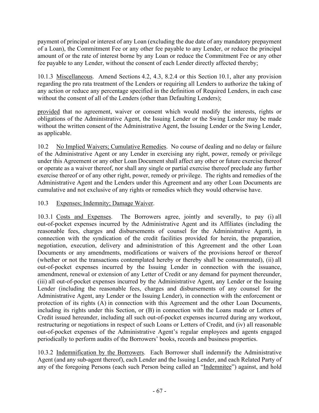 - 67 - payment of principal or interest of any Loan (excluding the due date of any mandatory prepayment of a Loan), the Commitment Fee or any other fee payable to any Lender, or reduce the principal amount of or the rate of interest borne by any Loan or reduce the Commitment Fee or any other fee payable to any Lender, without the consent of each Lender directly affected thereby; 10.1.3 Miscellaneous. Amend Sections 4.2, 4.3, 8.2.4 or this Section 10.1, alter any provision regarding the pro rata treatment of the Lenders or requiring all Lenders to authorize the taking of any action or reduce any percentage specified in the definition of Required Lenders, in each case without the consent of all of the Lenders (other than Defaulting Lenders); provided that no agreement, waiver or consent which would modify the interests, rights or obligations of the Administrative Agent, the Issuing Lender or the Swing Lender may be made without the written consent of the Administrative Agent, the Issuing Lender or the Swing Lender, as applicable. 10.2 No Implied Waivers; Cumulative Remedies. No course of dealing and no delay or failure of the Administrative Agent or any Lender in exercising any right, power, remedy or privilege under this Agreement or any other Loan Document shall affect any other or future exercise thereof or operate as a waiver thereof, nor shall any single or partial exercise thereof preclude any further exercise thereof or of any other right, power, remedy or privilege. The rights and remedies of the Administrative Agent and the Lenders under this Agreement and any other Loan Documents are cumulative and not exclusive of any rights or remedies which they would otherwise have. 10.3 Expenses; Indemnity; Damage Waiver. 10.3.1 Costs and Expenses. The Borrowers agree, jointly and severally, to pay (i) all out-of-pocket expenses incurred by the Administrative Agent and its Affiliates (including the reasonable fees, charges and disbursements of counsel for the Administrative Agent), in connection with the syndication of the credit facilities provided for herein, the preparation, negotiation, execution, delivery and administration of this Agreement and the other Loan Documents or any amendments, modifications or waivers of the provisions hereof or thereof (whether or not the transactions contemplated hereby or thereby shall be consummated), (ii) all out-of-pocket expenses incurred by the Issuing Lender in connection with the issuance, amendment, renewal or extension of any Letter of Credit or any demand for payment thereunder, (iii) all out-of-pocket expenses incurred by the Administrative Agent, any Lender or the Issuing Lender (including the reasonable fees, charges and disbursements of any counsel for the Administrative Agent, any Lender or the Issuing Lender), in connection with the enforcement or protection of its rights (A) in connection with this Agreement and the other Loan Documents, including its rights under this Section, or (B) in connection with the Loans made or Letters of Credit issued hereunder, including all such out-of-pocket expenses incurred during any workout, restructuring or negotiations in respect of such Loans or Letters of Credit, and (iv) all reasonable out-of-pocket expenses of the Administrative Agent’s regular employees and agents engaged periodically to perform audits of the Borrowers’ books, records and business properties. 10.3.2 Indemnification by the Borrowers. Each Borrower shall indemnify the Administrative Agent (and any sub-agent thereof), each Lender and the Issuing Lender, and each Related Party of any of the foregoing Persons (each such Person being called an “Indemnitee”) against, and hold