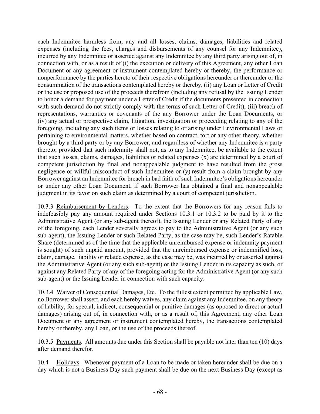 - 68 - each Indemnitee harmless from, any and all losses, claims, damages, liabilities and related expenses (including the fees, charges and disbursements of any counsel for any Indemnitee), incurred by any Indemnitee or asserted against any Indemnitee by any third party arising out of, in connection with, or as a result of (i) the execution or delivery of this Agreement, any other Loan Document or any agreement or instrument contemplated hereby or thereby, the performance or nonperformance by the parties hereto of their respective obligations hereunder or thereunder or the consummation of the transactions contemplated hereby or thereby, (ii) any Loan or Letter of Credit or the use or proposed use of the proceeds therefrom (including any refusal by the Issuing Lender to honor a demand for payment under a Letter of Credit if the documents presented in connection with such demand do not strictly comply with the terms of such Letter of Credit), (iii) breach of representations, warranties or covenants of the any Borrower under the Loan Documents, or (iv) any actual or prospective claim, litigation, investigation or proceeding relating to any of the foregoing, including any such items or losses relating to or arising under Environmental Laws or pertaining to environmental matters, whether based on contract, tort or any other theory, whether brought by a third party or by any Borrower, and regardless of whether any Indemnitee is a party thereto; provided that such indemnity shall not, as to any Indemnitee, be available to the extent that such losses, claims, damages, liabilities or related expenses (x) are determined by a court of competent jurisdiction by final and nonappealable judgment to have resulted from the gross negligence or willful misconduct of such Indemnitee or (y) result from a claim brought by any Borrower against an Indemnitee for breach in bad faith of such Indemnitee’s obligations hereunder or under any other Loan Document, if such Borrower has obtained a final and nonappealable judgment in its favor on such claim as determined by a court of competent jurisdiction. 10.3.3 Reimbursement by Lenders. To the extent that the Borrowers for any reason fails to indefeasibly pay any amount required under Sections 10.3.1 or 10.3.2 to be paid by it to the Administrative Agent (or any sub-agent thereof), the Issuing Lender or any Related Party of any of the foregoing, each Lender severally agrees to pay to the Administrative Agent (or any such sub-agent), the Issuing Lender or such Related Party, as the case may be, such Lender’s Ratable Share (determined as of the time that the applicable unreimbursed expense or indemnity payment is sought) of such unpaid amount, provided that the unreimbursed expense or indemnified loss, claim, damage, liability or related expense, as the case may be, was incurred by or asserted against the Administrative Agent (or any such sub-agent) or the Issuing Lender in its capacity as such, or against any Related Party of any of the foregoing acting for the Administrative Agent (or any such sub-agent) or the Issuing Lender in connection with such capacity. 10.3.4 Waiver of Consequential Damages, Etc. To the fullest extent permitted by applicable Law, no Borrower shall assert, and each hereby waives, any claim against any Indemnitee, on any theory of liability, for special, indirect, consequential or punitive damages (as opposed to direct or actual damages) arising out of, in connection with, or as a result of, this Agreement, any other Loan Document or any agreement or instrument contemplated hereby, the transactions contemplated hereby or thereby, any Loan, or the use of the proceeds thereof. 10.3.5 Payments. All amounts due under this Section shall be payable not later than ten (10) days after demand therefor. 10.4 Holidays. Whenever payment of a Loan to be made or taken hereunder shall be due on a day which is not a Business Day such payment shall be due on the next Business Day (except as