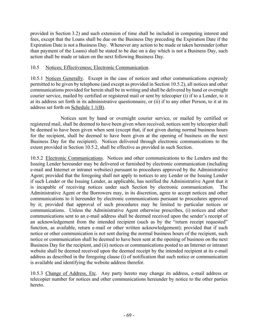 - 69 - provided in Section 3.2) and such extension of time shall be included in computing interest and fees, except that the Loans shall be due on the Business Day preceding the Expiration Date if the Expiration Date is not a Business Day. Whenever any action to be made or taken hereunder (other than payment of the Loans) shall be stated to be due on a day which is not a Business Day, such action shall be made or taken on the next following Business Day. 10.5 Notices; Effectiveness; Electronic Communication. 10.5.1 Notices Generally. Except in the case of notices and other communications expressly permitted to be given by telephone (and except as provided in Section 10.5.2), all notices and other communications provided for herein shall be in writing and shall be delivered by hand or overnight courier service, mailed by certified or registered mail or sent by telecopier (i) if to a Lender, to it at its address set forth in its administrative questionnaire, or (ii) if to any other Person, to it at its address set forth on Schedule 1.1(B). Notices sent by hand or overnight courier service, or mailed by certified or registered mail, shall be deemed to have been given when received; notices sent by telecopier shall be deemed to have been given when sent (except that, if not given during normal business hours for the recipient, shall be deemed to have been given at the opening of business on the next Business Day for the recipient). Notices delivered through electronic communications to the extent provided in Section 10.5.2, shall be effective as provided in such Section. 10.5.2 Electronic Communications. Notices and other communications to the Lenders and the Issuing Lender hereunder may be delivered or furnished by electronic communication (including e-mail and Internet or intranet websites) pursuant to procedures approved by the Administrative Agent; provided that the foregoing shall not apply to notices to any Lender or the Issuing Lender if such Lender or the Issuing Lender, as applicable, has notified the Administrative Agent that it is incapable of receiving notices under such Section by electronic communication. The Administrative Agent or the Borrowers may, in its discretion, agree to accept notices and other communications to it hereunder by electronic communications pursuant to procedures approved by it; provided that approval of such procedures may be limited to particular notices or communications. Unless the Administrative Agent otherwise prescribes, (i) notices and other communications sent to an e-mail address shall be deemed received upon the sender’s receipt of an acknowledgement from the intended recipient (such as by the “return receipt requested” function, as available, return e-mail or other written acknowledgement); provided that if such notice or other communication is not sent during the normal business hours of the recipient, such notice or communication shall be deemed to have been sent at the opening of business on the next Business Day for the recipient, and (ii) notices or communications posted to an Internet or intranet website shall be deemed received upon the deemed receipt by the intended recipient at its e-mail address as described in the foregoing clause (i) of notification that such notice or communication is available and identifying the website address therefor. 10.5.3 Change of Address, Etc. Any party hereto may change its address, e-mail address or telecopier number for notices and other communications hereunder by notice to the other parties hereto.