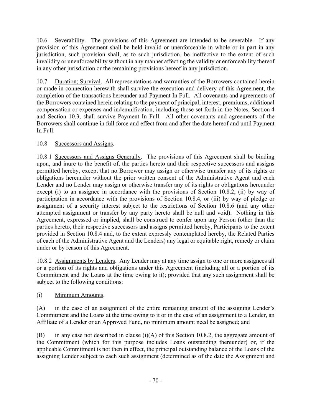 - 70 - 10.6 Severability. The provisions of this Agreement are intended to be severable. If any provision of this Agreement shall be held invalid or unenforceable in whole or in part in any jurisdiction, such provision shall, as to such jurisdiction, be ineffective to the extent of such invalidity or unenforceability without in any manner affecting the validity or enforceability thereof in any other jurisdiction or the remaining provisions hereof in any jurisdiction. 10.7 Duration; Survival. All representations and warranties of the Borrowers contained herein or made in connection herewith shall survive the execution and delivery of this Agreement, the completion of the transactions hereunder and Payment In Full. All covenants and agreements of the Borrowers contained herein relating to the payment of principal, interest, premiums, additional compensation or expenses and indemnification, including those set forth in the Notes, Section 4 and Section 10.3, shall survive Payment In Full. All other covenants and agreements of the Borrowers shall continue in full force and effect from and after the date hereof and until Payment In Full. 10.8 Successors and Assigns. 10.8.1 Successors and Assigns Generally. The provisions of this Agreement shall be binding upon, and inure to the benefit of, the parties hereto and their respective successors and assigns permitted hereby, except that no Borrower may assign or otherwise transfer any of its rights or obligations hereunder without the prior written consent of the Administrative Agent and each Lender and no Lender may assign or otherwise transfer any of its rights or obligations hereunder except (i) to an assignee in accordance with the provisions of Section 10.8.2, (ii) by way of participation in accordance with the provisions of Section 10.8.4, or (iii) by way of pledge or assignment of a security interest subject to the restrictions of Section 10.8.6 (and any other attempted assignment or transfer by any party hereto shall be null and void). Nothing in this Agreement, expressed or implied, shall be construed to confer upon any Person (other than the parties hereto, their respective successors and assigns permitted hereby, Participants to the extent provided in Section 10.8.4 and, to the extent expressly contemplated hereby, the Related Parties of each of the Administrative Agent and the Lenders) any legal or equitable right, remedy or claim under or by reason of this Agreement. 10.8.2 Assignments by Lenders. Any Lender may at any time assign to one or more assignees all or a portion of its rights and obligations under this Agreement (including all or a portion of its Commitment and the Loans at the time owing to it); provided that any such assignment shall be subject to the following conditions: (i) Minimum Amounts. (A) in the case of an assignment of the entire remaining amount of the assigning Lender’s Commitment and the Loans at the time owing to it or in the case of an assignment to a Lender, an Affiliate of a Lender or an Approved Fund, no minimum amount need be assigned; and (B) in any case not described in clause (i)(A) of this Section 10.8.2, the aggregate amount of the Commitment (which for this purpose includes Loans outstanding thereunder) or, if the applicable Commitment is not then in effect, the principal outstanding balance of the Loans of the assigning Lender subject to each such assignment (determined as of the date the Assignment and