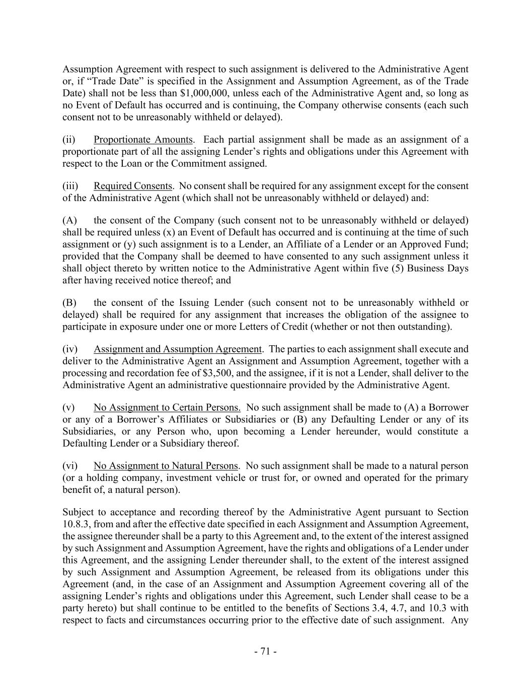 - 71 - Assumption Agreement with respect to such assignment is delivered to the Administrative Agent or, if “Trade Date” is specified in the Assignment and Assumption Agreement, as of the Trade Date) shall not be less than $1,000,000, unless each of the Administrative Agent and, so long as no Event of Default has occurred and is continuing, the Company otherwise consents (each such consent not to be unreasonably withheld or delayed). (ii) Proportionate Amounts. Each partial assignment shall be made as an assignment of a proportionate part of all the assigning Lender’s rights and obligations under this Agreement with respect to the Loan or the Commitment assigned. (iii) Required Consents. No consent shall be required for any assignment except for the consent of the Administrative Agent (which shall not be unreasonably withheld or delayed) and: (A) the consent of the Company (such consent not to be unreasonably withheld or delayed) shall be required unless (x) an Event of Default has occurred and is continuing at the time of such assignment or (y) such assignment is to a Lender, an Affiliate of a Lender or an Approved Fund; provided that the Company shall be deemed to have consented to any such assignment unless it shall object thereto by written notice to the Administrative Agent within five (5) Business Days after having received notice thereof; and (B) the consent of the Issuing Lender (such consent not to be unreasonably withheld or delayed) shall be required for any assignment that increases the obligation of the assignee to participate in exposure under one or more Letters of Credit (whether or not then outstanding). (iv) Assignment and Assumption Agreement. The parties to each assignment shall execute and deliver to the Administrative Agent an Assignment and Assumption Agreement, together with a processing and recordation fee of $3,500, and the assignee, if it is not a Lender, shall deliver to the Administrative Agent an administrative questionnaire provided by the Administrative Agent. (v) No Assignment to Certain Persons. No such assignment shall be made to (A) a Borrower or any of a Borrower’s Affiliates or Subsidiaries or (B) any Defaulting Lender or any of its Subsidiaries, or any Person who, upon becoming a Lender hereunder, would constitute a Defaulting Lender or a Subsidiary thereof. (vi) No Assignment to Natural Persons. No such assignment shall be made to a natural person (or a holding company, investment vehicle or trust for, or owned and operated for the primary benefit of, a natural person). Subject to acceptance and recording thereof by the Administrative Agent pursuant to Section 10.8.3, from and after the effective date specified in each Assignment and Assumption Agreement, the assignee thereunder shall be a party to this Agreement and, to the extent of the interest assigned by such Assignment and Assumption Agreement, have the rights and obligations of a Lender under this Agreement, and the assigning Lender thereunder shall, to the extent of the interest assigned by such Assignment and Assumption Agreement, be released from its obligations under this Agreement (and, in the case of an Assignment and Assumption Agreement covering all of the assigning Lender’s rights and obligations under this Agreement, such Lender shall cease to be a party hereto) but shall continue to be entitled to the benefits of Sections 3.4, 4.7, and 10.3 with respect to facts and circumstances occurring prior to the effective date of such assignment. Any