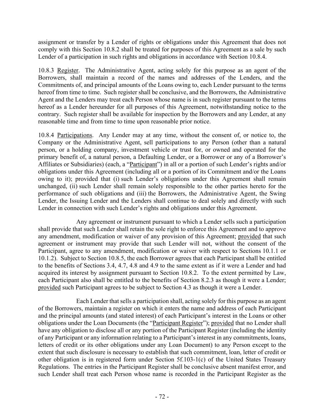 - 72 - assignment or transfer by a Lender of rights or obligations under this Agreement that does not comply with this Section 10.8.2 shall be treated for purposes of this Agreement as a sale by such Lender of a participation in such rights and obligations in accordance with Section 10.8.4. 10.8.3 Register. The Administrative Agent, acting solely for this purpose as an agent of the Borrowers, shall maintain a record of the names and addresses of the Lenders, and the Commitments of, and principal amounts of the Loans owing to, each Lender pursuant to the terms hereof from time to time. Such register shall be conclusive, and the Borrowers, the Administrative Agent and the Lenders may treat each Person whose name is in such register pursuant to the terms hereof as a Lender hereunder for all purposes of this Agreement, notwithstanding notice to the contrary. Such register shall be available for inspection by the Borrowers and any Lender, at any reasonable time and from time to time upon reasonable prior notice. 10.8.4 Participations. Any Lender may at any time, without the consent of, or notice to, the Company or the Administrative Agent, sell participations to any Person (other than a natural person, or a holding company, investment vehicle or trust for, or owned and operated for the primary benefit of, a natural person, a Defaulting Lender, or a Borrower or any of a Borrower’s Affiliates or Subsidiaries) (each, a “Participant”) in all or a portion of such Lender’s rights and/or obligations under this Agreement (including all or a portion of its Commitment and/or the Loans owing to it); provided that (i) such Lender’s obligations under this Agreement shall remain unchanged, (ii) such Lender shall remain solely responsible to the other parties hereto for the performance of such obligations and (iii) the Borrowers, the Administrative Agent, the Swing Lender, the Issuing Lender and the Lenders shall continue to deal solely and directly with such Lender in connection with such Lender’s rights and obligations under this Agreement. Any agreement or instrument pursuant to which a Lender sells such a participation shall provide that such Lender shall retain the sole right to enforce this Agreement and to approve any amendment, modification or waiver of any provision of this Agreement; provided that such agreement or instrument may provide that such Lender will not, without the consent of the Participant, agree to any amendment, modification or waiver with respect to Sections 10.1.1 or 10.1.2). Subject to Section 10.8.5, the each Borrower agrees that each Participant shall be entitled to the benefits of Sections 3.4, 4.7, 4.8 and 4.9 to the same extent as if it were a Lender and had acquired its interest by assignment pursuant to Section 10.8.2. To the extent permitted by Law, each Participant also shall be entitled to the benefits of Section 8.2.3 as though it were a Lender; provided such Participant agrees to be subject to Section 4.3 as though it were a Lender. Each Lender that sells a participation shall, acting solely for this purpose as an agent of the Borrowers, maintain a register on which it enters the name and address of each Participant and the principal amounts (and stated interest) of each Participant’s interest in the Loans or other obligations under the Loan Documents (the “Participant Register”); provided that no Lender shall have any obligation to disclose all or any portion of the Participant Register (including the identity of any Participant or any information relating to a Participant’s interest in any commitments, loans, letters of credit or its other obligations under any Loan Document) to any Person except to the extent that such disclosure is necessary to establish that such commitment, loan, letter of credit or other obligation is in registered form under Section 5f.103-1(c) of the United States Treasury Regulations. The entries in the Participant Register shall be conclusive absent manifest error, and such Lender shall treat each Person whose name is recorded in the Participant Register as the