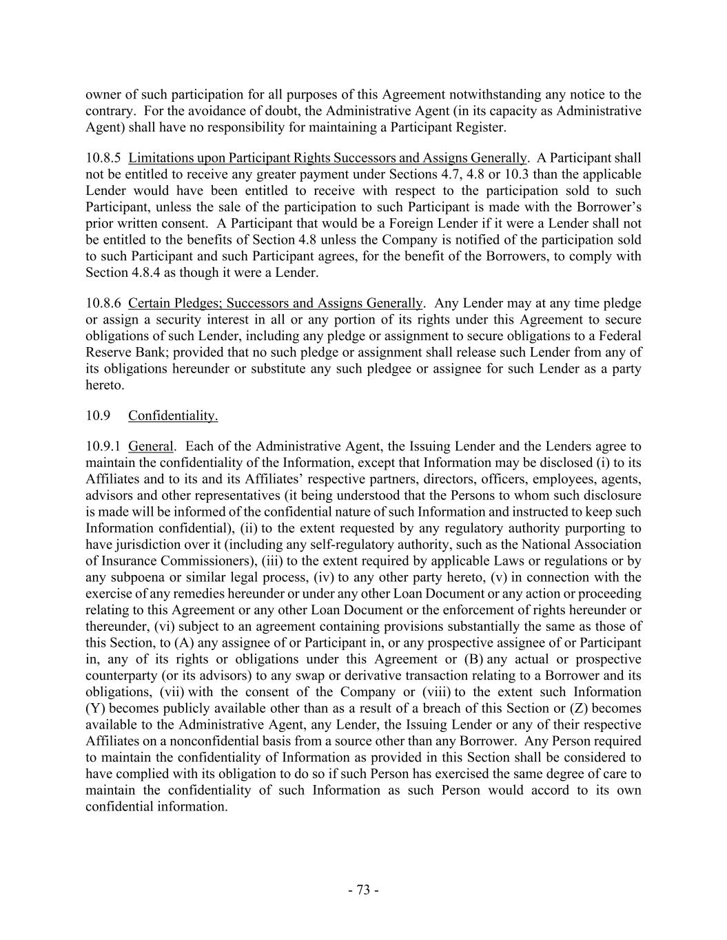 - 73 - owner of such participation for all purposes of this Agreement notwithstanding any notice to the contrary. For the avoidance of doubt, the Administrative Agent (in its capacity as Administrative Agent) shall have no responsibility for maintaining a Participant Register. 10.8.5 Limitations upon Participant Rights Successors and Assigns Generally. A Participant shall not be entitled to receive any greater payment under Sections 4.7, 4.8 or 10.3 than the applicable Lender would have been entitled to receive with respect to the participation sold to such Participant, unless the sale of the participation to such Participant is made with the Borrower’s prior written consent. A Participant that would be a Foreign Lender if it were a Lender shall not be entitled to the benefits of Section 4.8 unless the Company is notified of the participation sold to such Participant and such Participant agrees, for the benefit of the Borrowers, to comply with Section 4.8.4 as though it were a Lender. 10.8.6 Certain Pledges; Successors and Assigns Generally. Any Lender may at any time pledge or assign a security interest in all or any portion of its rights under this Agreement to secure obligations of such Lender, including any pledge or assignment to secure obligations to a Federal Reserve Bank; provided that no such pledge or assignment shall release such Lender from any of its obligations hereunder or substitute any such pledgee or assignee for such Lender as a party hereto. 10.9 Confidentiality. 10.9.1 General. Each of the Administrative Agent, the Issuing Lender and the Lenders agree to maintain the confidentiality of the Information, except that Information may be disclosed (i) to its Affiliates and to its and its Affiliates’ respective partners, directors, officers, employees, agents, advisors and other representatives (it being understood that the Persons to whom such disclosure is made will be informed of the confidential nature of such Information and instructed to keep such Information confidential), (ii) to the extent requested by any regulatory authority purporting to have jurisdiction over it (including any self-regulatory authority, such as the National Association of Insurance Commissioners), (iii) to the extent required by applicable Laws or regulations or by any subpoena or similar legal process, (iv) to any other party hereto, (v) in connection with the exercise of any remedies hereunder or under any other Loan Document or any action or proceeding relating to this Agreement or any other Loan Document or the enforcement of rights hereunder or thereunder, (vi) subject to an agreement containing provisions substantially the same as those of this Section, to (A) any assignee of or Participant in, or any prospective assignee of or Participant in, any of its rights or obligations under this Agreement or (B) any actual or prospective counterparty (or its advisors) to any swap or derivative transaction relating to a Borrower and its obligations, (vii) with the consent of the Company or (viii) to the extent such Information (Y) becomes publicly available other than as a result of a breach of this Section or (Z) becomes available to the Administrative Agent, any Lender, the Issuing Lender or any of their respective Affiliates on a nonconfidential basis from a source other than any Borrower. Any Person required to maintain the confidentiality of Information as provided in this Section shall be considered to have complied with its obligation to do so if such Person has exercised the same degree of care to maintain the confidentiality of such Information as such Person would accord to its own confidential information.