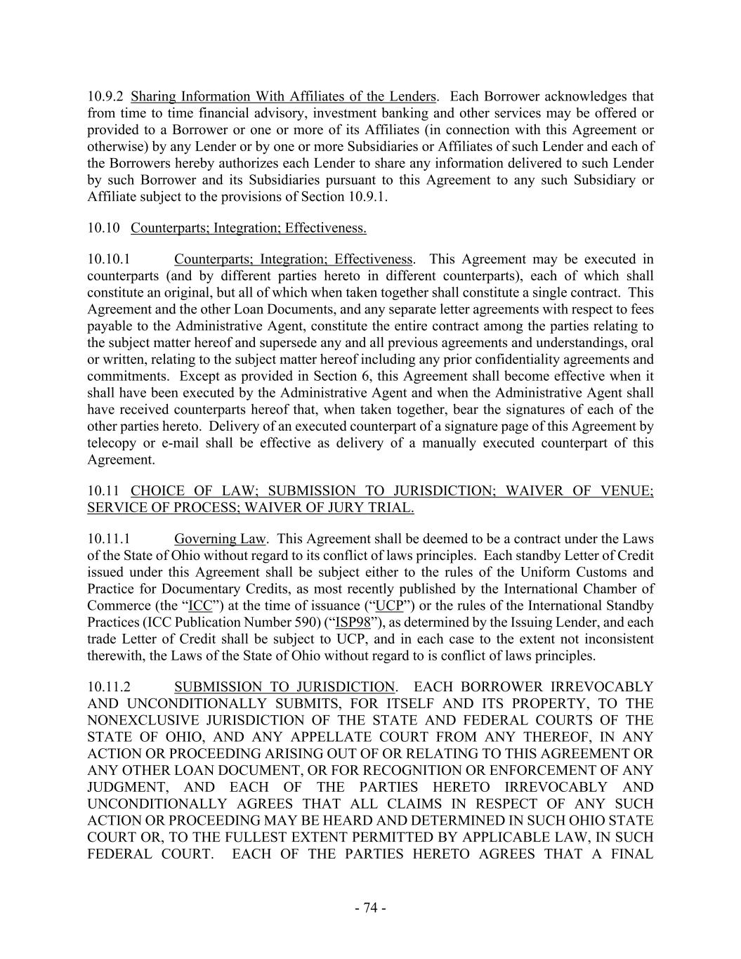 - 74 - 10.9.2 Sharing Information With Affiliates of the Lenders. Each Borrower acknowledges that from time to time financial advisory, investment banking and other services may be offered or provided to a Borrower or one or more of its Affiliates (in connection with this Agreement or otherwise) by any Lender or by one or more Subsidiaries or Affiliates of such Lender and each of the Borrowers hereby authorizes each Lender to share any information delivered to such Lender by such Borrower and its Subsidiaries pursuant to this Agreement to any such Subsidiary or Affiliate subject to the provisions of Section 10.9.1. 10.10 Counterparts; Integration; Effectiveness. 10.10.1 Counterparts; Integration; Effectiveness. This Agreement may be executed in counterparts (and by different parties hereto in different counterparts), each of which shall constitute an original, but all of which when taken together shall constitute a single contract. This Agreement and the other Loan Documents, and any separate letter agreements with respect to fees payable to the Administrative Agent, constitute the entire contract among the parties relating to the subject matter hereof and supersede any and all previous agreements and understandings, oral or written, relating to the subject matter hereof including any prior confidentiality agreements and commitments. Except as provided in Section 6, this Agreement shall become effective when it shall have been executed by the Administrative Agent and when the Administrative Agent shall have received counterparts hereof that, when taken together, bear the signatures of each of the other parties hereto. Delivery of an executed counterpart of a signature page of this Agreement by telecopy or e-mail shall be effective as delivery of a manually executed counterpart of this Agreement. 10.11 CHOICE OF LAW; SUBMISSION TO JURISDICTION; WAIVER OF VENUE; SERVICE OF PROCESS; WAIVER OF JURY TRIAL. 10.11.1 Governing Law. This Agreement shall be deemed to be a contract under the Laws of the State of Ohio without regard to its conflict of laws principles. Each standby Letter of Credit issued under this Agreement shall be subject either to the rules of the Uniform Customs and Practice for Documentary Credits, as most recently published by the International Chamber of Commerce (the “ICC”) at the time of issuance (“UCP”) or the rules of the International Standby Practices (ICC Publication Number 590) (“ISP98”), as determined by the Issuing Lender, and each trade Letter of Credit shall be subject to UCP, and in each case to the extent not inconsistent therewith, the Laws of the State of Ohio without regard to is conflict of laws principles. 10.11.2 SUBMISSION TO JURISDICTION. EACH BORROWER IRREVOCABLY AND UNCONDITIONALLY SUBMITS, FOR ITSELF AND ITS PROPERTY, TO THE NONEXCLUSIVE JURISDICTION OF THE STATE AND FEDERAL COURTS OF THE STATE OF OHIO, AND ANY APPELLATE COURT FROM ANY THEREOF, IN ANY ACTION OR PROCEEDING ARISING OUT OF OR RELATING TO THIS AGREEMENT OR ANY OTHER LOAN DOCUMENT, OR FOR RECOGNITION OR ENFORCEMENT OF ANY JUDGMENT, AND EACH OF THE PARTIES HERETO IRREVOCABLY AND UNCONDITIONALLY AGREES THAT ALL CLAIMS IN RESPECT OF ANY SUCH ACTION OR PROCEEDING MAY BE HEARD AND DETERMINED IN SUCH OHIO STATE COURT OR, TO THE FULLEST EXTENT PERMITTED BY APPLICABLE LAW, IN SUCH FEDERAL COURT. EACH OF THE PARTIES HERETO AGREES THAT A FINAL