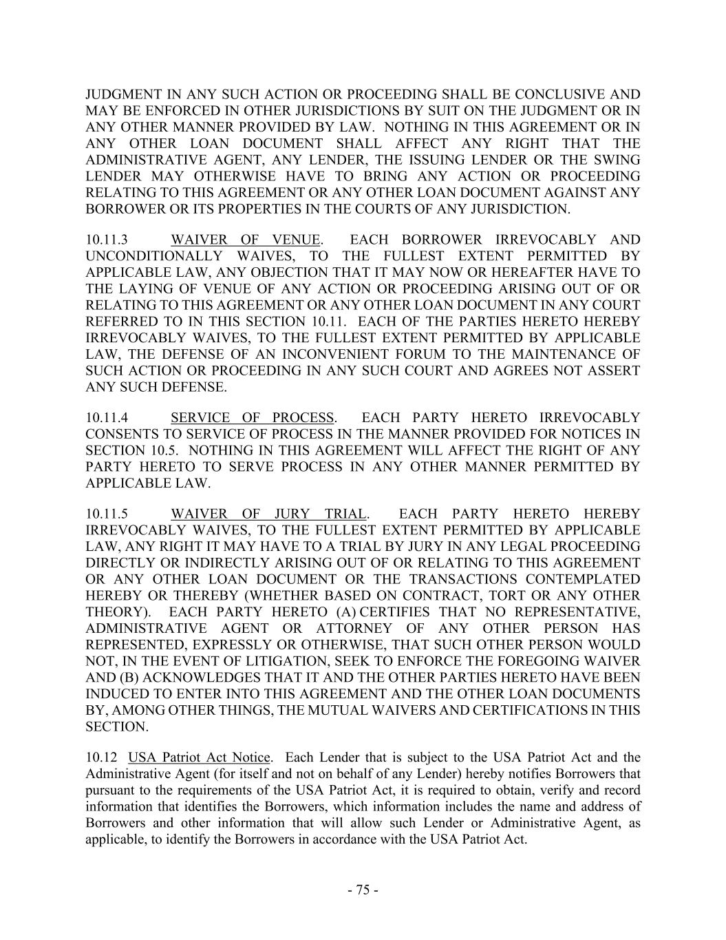 - 75 - JUDGMENT IN ANY SUCH ACTION OR PROCEEDING SHALL BE CONCLUSIVE AND MAY BE ENFORCED IN OTHER JURISDICTIONS BY SUIT ON THE JUDGMENT OR IN ANY OTHER MANNER PROVIDED BY LAW. NOTHING IN THIS AGREEMENT OR IN ANY OTHER LOAN DOCUMENT SHALL AFFECT ANY RIGHT THAT THE ADMINISTRATIVE AGENT, ANY LENDER, THE ISSUING LENDER OR THE SWING LENDER MAY OTHERWISE HAVE TO BRING ANY ACTION OR PROCEEDING RELATING TO THIS AGREEMENT OR ANY OTHER LOAN DOCUMENT AGAINST ANY BORROWER OR ITS PROPERTIES IN THE COURTS OF ANY JURISDICTION. 10.11.3 WAIVER OF VENUE. EACH BORROWER IRREVOCABLY AND UNCONDITIONALLY WAIVES, TO THE FULLEST EXTENT PERMITTED BY APPLICABLE LAW, ANY OBJECTION THAT IT MAY NOW OR HEREAFTER HAVE TO THE LAYING OF VENUE OF ANY ACTION OR PROCEEDING ARISING OUT OF OR RELATING TO THIS AGREEMENT OR ANY OTHER LOAN DOCUMENT IN ANY COURT REFERRED TO IN THIS SECTION 10.11. EACH OF THE PARTIES HERETO HEREBY IRREVOCABLY WAIVES, TO THE FULLEST EXTENT PERMITTED BY APPLICABLE LAW, THE DEFENSE OF AN INCONVENIENT FORUM TO THE MAINTENANCE OF SUCH ACTION OR PROCEEDING IN ANY SUCH COURT AND AGREES NOT ASSERT ANY SUCH DEFENSE. 10.11.4 SERVICE OF PROCESS. EACH PARTY HERETO IRREVOCABLY CONSENTS TO SERVICE OF PROCESS IN THE MANNER PROVIDED FOR NOTICES IN SECTION 10.5. NOTHING IN THIS AGREEMENT WILL AFFECT THE RIGHT OF ANY PARTY HERETO TO SERVE PROCESS IN ANY OTHER MANNER PERMITTED BY APPLICABLE LAW. 10.11.5 WAIVER OF JURY TRIAL. EACH PARTY HERETO HEREBY IRREVOCABLY WAIVES, TO THE FULLEST EXTENT PERMITTED BY APPLICABLE LAW, ANY RIGHT IT MAY HAVE TO A TRIAL BY JURY IN ANY LEGAL PROCEEDING DIRECTLY OR INDIRECTLY ARISING OUT OF OR RELATING TO THIS AGREEMENT OR ANY OTHER LOAN DOCUMENT OR THE TRANSACTIONS CONTEMPLATED HEREBY OR THEREBY (WHETHER BASED ON CONTRACT, TORT OR ANY OTHER THEORY). EACH PARTY HERETO (A) CERTIFIES THAT NO REPRESENTATIVE, ADMINISTRATIVE AGENT OR ATTORNEY OF ANY OTHER PERSON HAS REPRESENTED, EXPRESSLY OR OTHERWISE, THAT SUCH OTHER PERSON WOULD NOT, IN THE EVENT OF LITIGATION, SEEK TO ENFORCE THE FOREGOING WAIVER AND (B) ACKNOWLEDGES THAT IT AND THE OTHER PARTIES HERETO HAVE BEEN INDUCED TO ENTER INTO THIS AGREEMENT AND THE OTHER LOAN DOCUMENTS BY, AMONG OTHER THINGS, THE MUTUAL WAIVERS AND CERTIFICATIONS IN THIS SECTION. 10.12 USA Patriot Act Notice. Each Lender that is subject to the USA Patriot Act and the Administrative Agent (for itself and not on behalf of any Lender) hereby notifies Borrowers that pursuant to the requirements of the USA Patriot Act, it is required to obtain, verify and record information that identifies the Borrowers, which information includes the name and address of Borrowers and other information that will allow such Lender or Administrative Agent, as applicable, to identify the Borrowers in accordance with the USA Patriot Act.