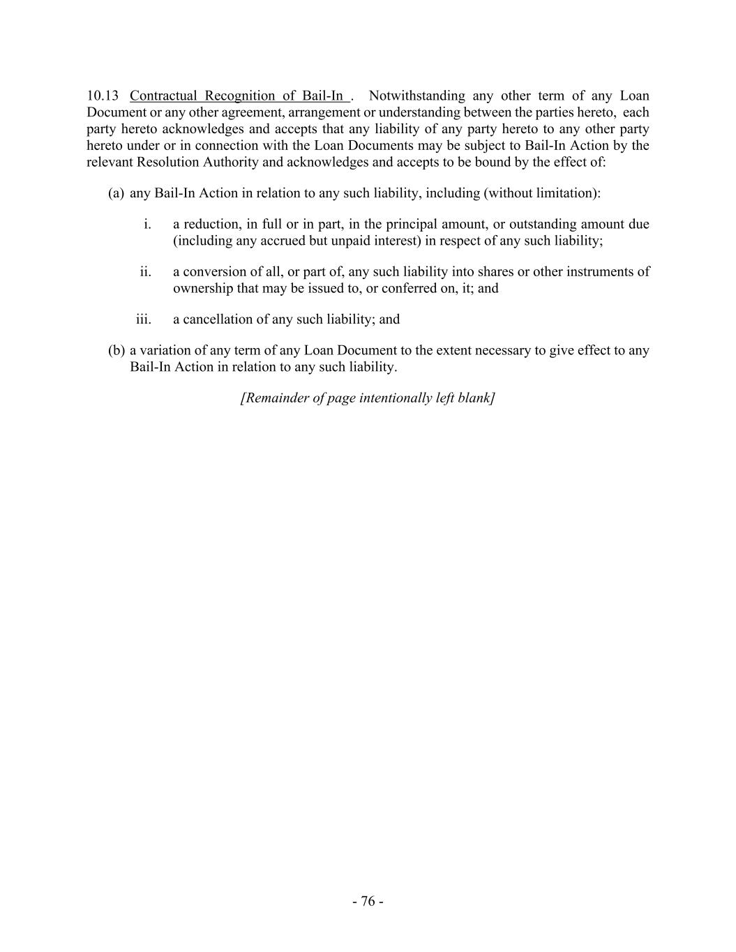 - 76 - 10.13 Contractual Recognition of Bail-In . Notwithstanding any other term of any Loan Document or any other agreement, arrangement or understanding between the parties hereto, each party hereto acknowledges and accepts that any liability of any party hereto to any other party hereto under or in connection with the Loan Documents may be subject to Bail-In Action by the relevant Resolution Authority and acknowledges and accepts to be bound by the effect of: (a) any Bail-In Action in relation to any such liability, including (without limitation): i. a reduction, in full or in part, in the principal amount, or outstanding amount due (including any accrued but unpaid interest) in respect of any such liability; ii. a conversion of all, or part of, any such liability into shares or other instruments of ownership that may be issued to, or conferred on, it; and iii. a cancellation of any such liability; and (b) a variation of any term of any Loan Document to the extent necessary to give effect to any Bail-In Action in relation to any such liability. [Remainder of page intentionally left blank]