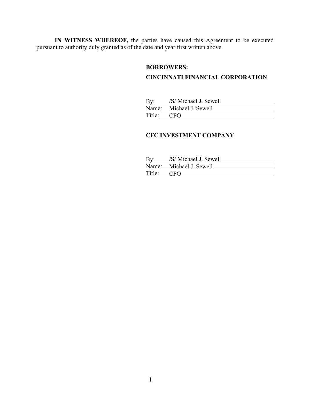 1 IN WITNESS WHEREOF, the parties have caused this Agreement to be executed pursuant to authority duly granted as of the date and year first written above. BORROWERS: CINCINNATI FINANCIAL CORPORATION By: Name: Title: CFC INVESTMENT COMPANY By: Name: Title: /S/ Michael J. Sewell Michael J. Sewell CFO /S/ Michael J. Sewell Michael J. Sewell CFO