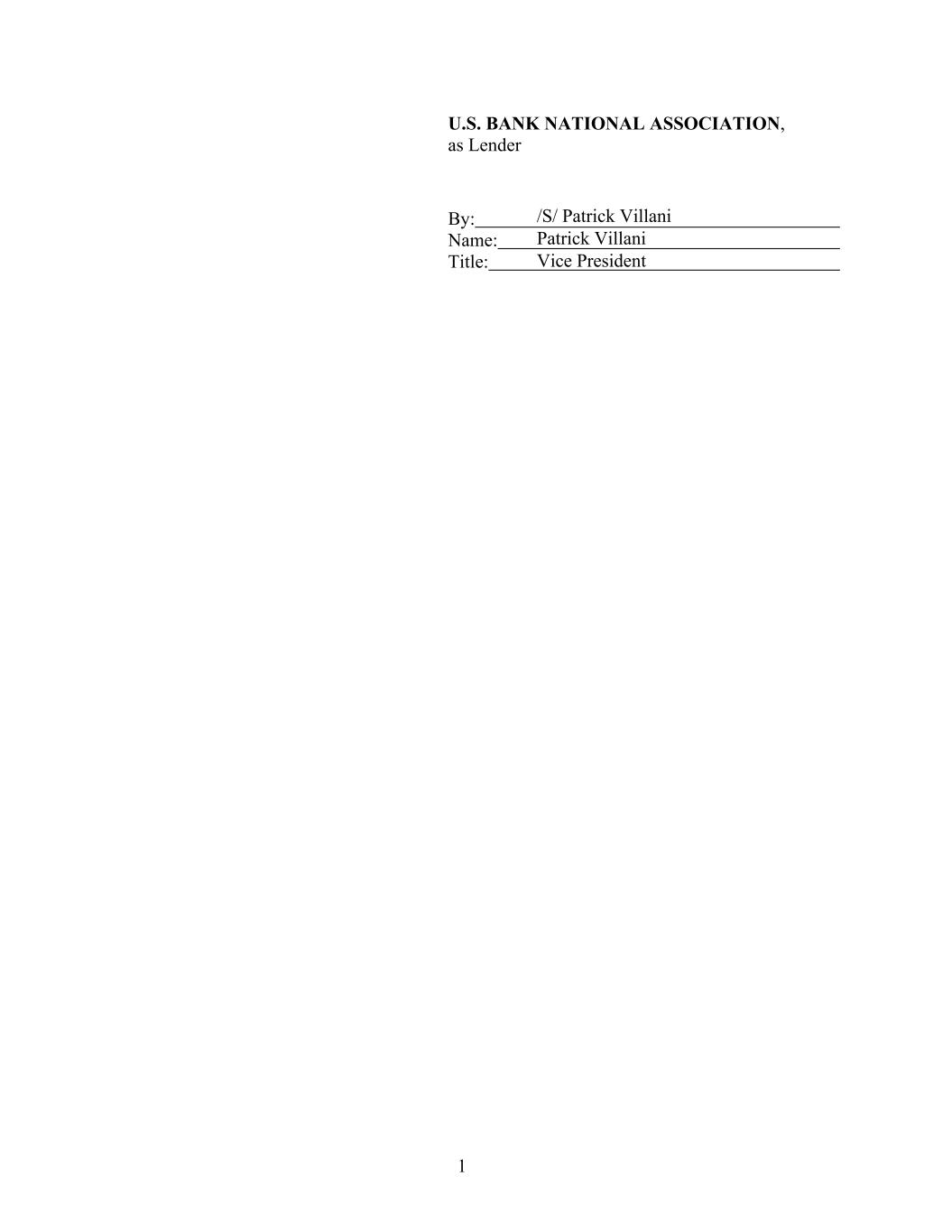 1 U.S. BANK NATIONAL ASSOCIATION, as Lender By: Name: Title: /S/ Patrick Villani Patrick Villani Vice President