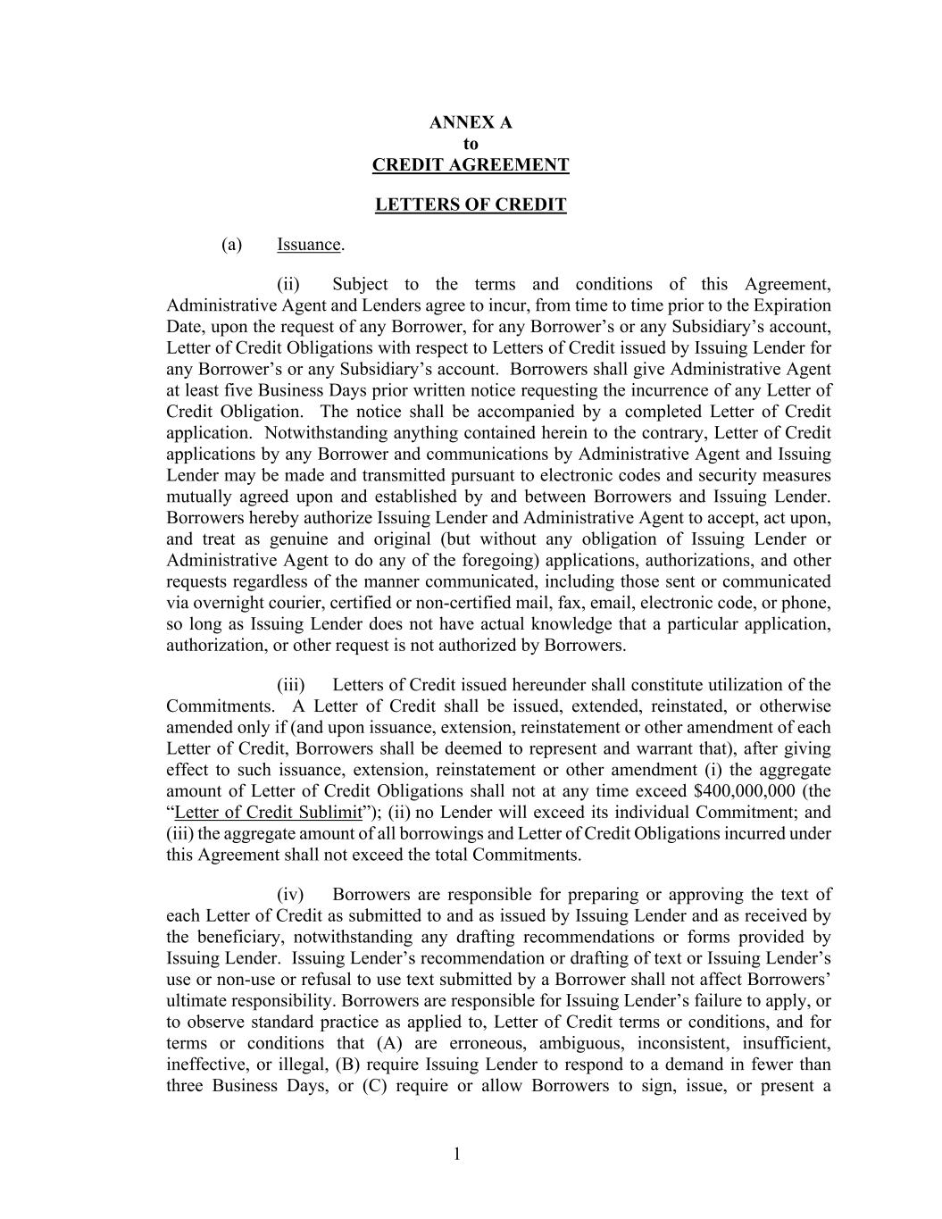 1 ANNEX A to CREDIT AGREEMENT LETTERS OF CREDIT (a) Issuance. (ii) Subject to the terms and conditions of this Agreement, Administrative Agent and Lenders agree to incur, from time to time prior to the Expiration Date, upon the request of any Borrower, for any Borrower’s or any Subsidiary’s account, Letter of Credit Obligations with respect to Letters of Credit issued by Issuing Lender for any Borrower’s or any Subsidiary’s account. Borrowers shall give Administrative Agent at least five Business Days prior written notice requesting the incurrence of any Letter of Credit Obligation. The notice shall be accompanied by a completed Letter of Credit application. Notwithstanding anything contained herein to the contrary, Letter of Credit applications by any Borrower and communications by Administrative Agent and Issuing Lender may be made and transmitted pursuant to electronic codes and security measures mutually agreed upon and established by and between Borrowers and Issuing Lender. Borrowers hereby authorize Issuing Lender and Administrative Agent to accept, act upon, and treat as genuine and original (but without any obligation of Issuing Lender or Administrative Agent to do any of the foregoing) applications, authorizations, and other requests regardless of the manner communicated, including those sent or communicated via overnight courier, certified or non-certified mail, fax, email, electronic code, or phone, so long as Issuing Lender does not have actual knowledge that a particular application, authorization, or other request is not authorized by Borrowers. (iii) Letters of Credit issued hereunder shall constitute utilization of the Commitments. A Letter of Credit shall be issued, extended, reinstated, or otherwise amended only if (and upon issuance, extension, reinstatement or other amendment of each Letter of Credit, Borrowers shall be deemed to represent and warrant that), after giving effect to such issuance, extension, reinstatement or other amendment (i) the aggregate amount of Letter of Credit Obligations shall not at any time exceed $400,000,000 (the “Letter of Credit Sublimit”); (ii) no Lender will exceed its individual Commitment; and (iii) the aggregate amount of all borrowings and Letter of Credit Obligations incurred under this Agreement shall not exceed the total Commitments. (iv) Borrowers are responsible for preparing or approving the text of each Letter of Credit as submitted to and as issued by Issuing Lender and as received by the beneficiary, notwithstanding any drafting recommendations or forms provided by Issuing Lender. Issuing Lender’s recommendation or drafting of text or Issuing Lender’s use or non-use or refusal to use text submitted by a Borrower shall not affect Borrowers’ ultimate responsibility. Borrowers are responsible for Issuing Lender’s failure to apply, or to observe standard practice as applied to, Letter of Credit terms or conditions, and for terms or conditions that (A) are erroneous, ambiguous, inconsistent, insufficient, ineffective, or illegal, (B) require Issuing Lender to respond to a demand in fewer than three Business Days, or (C) require or allow Borrowers to sign, issue, or present a