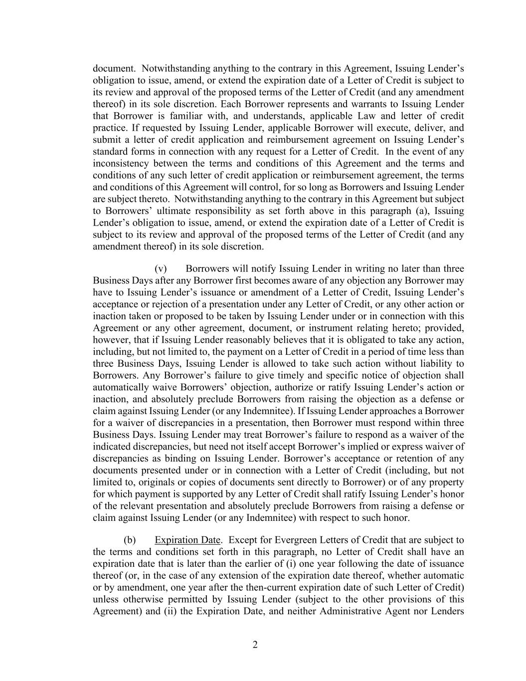 2 document. Notwithstanding anything to the contrary in this Agreement, Issuing Lender’s obligation to issue, amend, or extend the expiration date of a Letter of Credit is subject to its review and approval of the proposed terms of the Letter of Credit (and any amendment thereof) in its sole discretion. Each Borrower represents and warrants to Issuing Lender that Borrower is familiar with, and understands, applicable Law and letter of credit practice. If requested by Issuing Lender, applicable Borrower will execute, deliver, and submit a letter of credit application and reimbursement agreement on Issuing Lender’s standard forms in connection with any request for a Letter of Credit. In the event of any inconsistency between the terms and conditions of this Agreement and the terms and conditions of any such letter of credit application or reimbursement agreement, the terms and conditions of this Agreement will control, for so long as Borrowers and Issuing Lender are subject thereto. Notwithstanding anything to the contrary in this Agreement but subject to Borrowers’ ultimate responsibility as set forth above in this paragraph (a), Issuing Lender’s obligation to issue, amend, or extend the expiration date of a Letter of Credit is subject to its review and approval of the proposed terms of the Letter of Credit (and any amendment thereof) in its sole discretion. (v) Borrowers will notify Issuing Lender in writing no later than three Business Days after any Borrower first becomes aware of any objection any Borrower may have to Issuing Lender’s issuance or amendment of a Letter of Credit, Issuing Lender’s acceptance or rejection of a presentation under any Letter of Credit, or any other action or inaction taken or proposed to be taken by Issuing Lender under or in connection with this Agreement or any other agreement, document, or instrument relating hereto; provided, however, that if Issuing Lender reasonably believes that it is obligated to take any action, including, but not limited to, the payment on a Letter of Credit in a period of time less than three Business Days, Issuing Lender is allowed to take such action without liability to Borrowers. Any Borrower’s failure to give timely and specific notice of objection shall automatically waive Borrowers’ objection, authorize or ratify Issuing Lender’s action or inaction, and absolutely preclude Borrowers from raising the objection as a defense or claim against Issuing Lender (or any Indemnitee). If Issuing Lender approaches a Borrower for a waiver of discrepancies in a presentation, then Borrower must respond within three Business Days. Issuing Lender may treat Borrower’s failure to respond as a waiver of the indicated discrepancies, but need not itself accept Borrower’s implied or express waiver of discrepancies as binding on Issuing Lender. Borrower’s acceptance or retention of any documents presented under or in connection with a Letter of Credit (including, but not limited to, originals or copies of documents sent directly to Borrower) or of any property for which payment is supported by any Letter of Credit shall ratify Issuing Lender’s honor of the relevant presentation and absolutely preclude Borrowers from raising a defense or claim against Issuing Lender (or any Indemnitee) with respect to such honor. (b) Expiration Date. Except for Evergreen Letters of Credit that are subject to the terms and conditions set forth in this paragraph, no Letter of Credit shall have an expiration date that is later than the earlier of (i) one year following the date of issuance thereof (or, in the case of any extension of the expiration date thereof, whether automatic or by amendment, one year after the then-current expiration date of such Letter of Credit) unless otherwise permitted by Issuing Lender (subject to the other provisions of this Agreement) and (ii) the Expiration Date, and neither Administrative Agent nor Lenders
