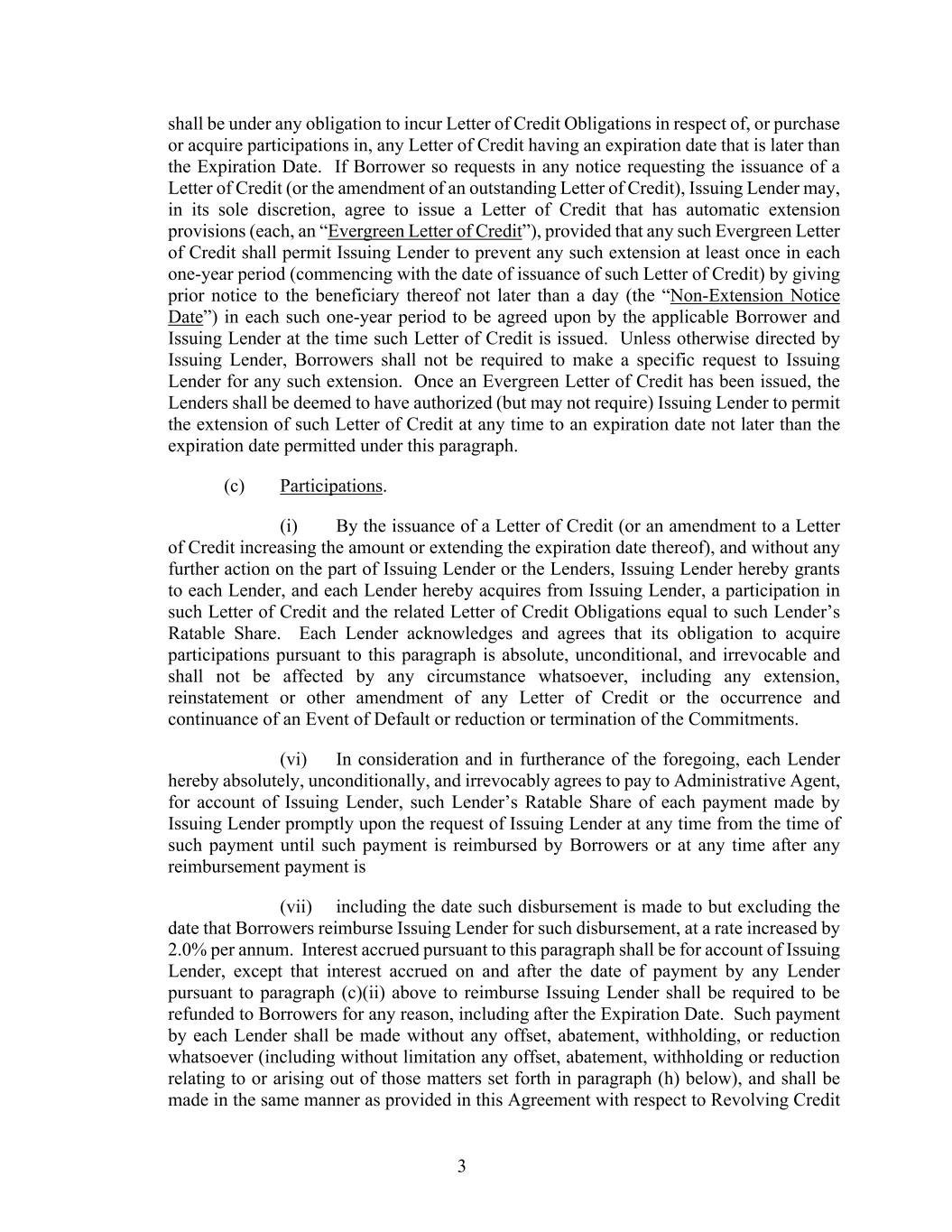 3 shall be under any obligation to incur Letter of Credit Obligations in respect of, or purchase or acquire participations in, any Letter of Credit having an expiration date that is later than the Expiration Date. If Borrower so requests in any notice requesting the issuance of a Letter of Credit (or the amendment of an outstanding Letter of Credit), Issuing Lender may, in its sole discretion, agree to issue a Letter of Credit that has automatic extension provisions (each, an “Evergreen Letter of Credit”), provided that any such Evergreen Letter of Credit shall permit Issuing Lender to prevent any such extension at least once in each one-year period (commencing with the date of issuance of such Letter of Credit) by giving prior notice to the beneficiary thereof not later than a day (the “Non-Extension Notice Date”) in each such one-year period to be agreed upon by the applicable Borrower and Issuing Lender at the time such Letter of Credit is issued. Unless otherwise directed by Issuing Lender, Borrowers shall not be required to make a specific request to Issuing Lender for any such extension. Once an Evergreen Letter of Credit has been issued, the Lenders shall be deemed to have authorized (but may not require) Issuing Lender to permit the extension of such Letter of Credit at any time to an expiration date not later than the expiration date permitted under this paragraph. (c) Participations. (i) By the issuance of a Letter of Credit (or an amendment to a Letter of Credit increasing the amount or extending the expiration date thereof), and without any further action on the part of Issuing Lender or the Lenders, Issuing Lender hereby grants to each Lender, and each Lender hereby acquires from Issuing Lender, a participation in such Letter of Credit and the related Letter of Credit Obligations equal to such Lender’s Ratable Share. Each Lender acknowledges and agrees that its obligation to acquire participations pursuant to this paragraph is absolute, unconditional, and irrevocable and shall not be affected by any circumstance whatsoever, including any extension, reinstatement or other amendment of any Letter of Credit or the occurrence and continuance of an Event of Default or reduction or termination of the Commitments. (vi) In consideration and in furtherance of the foregoing, each Lender hereby absolutely, unconditionally, and irrevocably agrees to pay to Administrative Agent, for account of Issuing Lender, such Lender’s Ratable Share of each payment made by Issuing Lender promptly upon the request of Issuing Lender at any time from the time of such payment until such payment is reimbursed by Borrowers or at any time after any reimbursement payment is (vii) including the date such disbursement is made to but excluding the date that Borrowers reimburse Issuing Lender for such disbursement, at a rate increased by 2.0% per annum. Interest accrued pursuant to this paragraph shall be for account of Issuing Lender, except that interest accrued on and after the date of payment by any Lender pursuant to paragraph (c)(ii) above to reimburse Issuing Lender shall be required to be refunded to Borrowers for any reason, including after the Expiration Date. Such payment by each Lender shall be made without any offset, abatement, withholding, or reduction whatsoever (including without limitation any offset, abatement, withholding or reduction relating to or arising out of those matters set forth in paragraph (h) below), and shall be made in the same manner as provided in this Agreement with respect to Revolving Credit