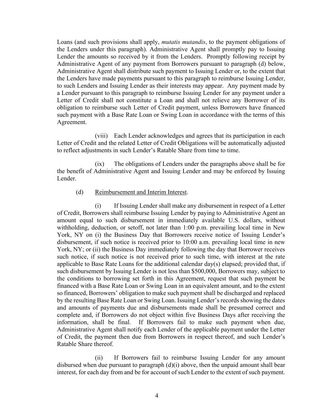 4 Loans (and such provisions shall apply, mutatis mutandis, to the payment obligations of the Lenders under this paragraph). Administrative Agent shall promptly pay to Issuing Lender the amounts so received by it from the Lenders. Promptly following receipt by Administrative Agent of any payment from Borrowers pursuant to paragraph (d) below, Administrative Agent shall distribute such payment to Issuing Lender or, to the extent that the Lenders have made payments pursuant to this paragraph to reimburse Issuing Lender, to such Lenders and Issuing Lender as their interests may appear. Any payment made by a Lender pursuant to this paragraph to reimburse Issuing Lender for any payment under a Letter of Credit shall not constitute a Loan and shall not relieve any Borrower of its obligation to reimburse such Letter of Credit payment, unless Borrowers have financed such payment with a Base Rate Loan or Swing Loan in accordance with the terms of this Agreement. (viii) Each Lender acknowledges and agrees that its participation in each Letter of Credit and the related Letter of Credit Obligations will be automatically adjusted to reflect adjustments in such Lender’s Ratable Share from time to time. (ix) The obligations of Lenders under the paragraphs above shall be for the benefit of Administrative Agent and Issuing Lender and may be enforced by Issuing Lender. (d) Reimbursement and Interim Interest. (i) If Issuing Lender shall make any disbursement in respect of a Letter of Credit, Borrowers shall reimburse Issuing Lender by paying to Administrative Agent an amount equal to such disbursement in immediately available U.S. dollars, without withholding, deduction, or setoff, not later than 1:00 p.m. prevailing local time in New York, NY on (i) the Business Day that Borrowers receive notice of Issuing Lender’s disbursement, if such notice is received prior to 10:00 a.m. prevailing local time in new York, NY; or (ii) the Business Day immediately following the day that Borrower receives such notice, if such notice is not received prior to such time, with interest at the rate applicable to Base Rate Loans for the additional calendar day(s) elapsed; provided that, if such disbursement by Issuing Lender is not less than $500,000, Borrowers may, subject to the conditions to borrowing set forth in this Agreement, request that such payment be financed with a Base Rate Loan or Swing Loan in an equivalent amount, and to the extent so financed, Borrowers’ obligation to make such payment shall be discharged and replaced by the resulting Base Rate Loan or Swing Loan. Issuing Lender’s records showing the dates and amounts of payments due and disbursements made shall be presumed correct and complete and, if Borrowers do not object within five Business Days after receiving the information, shall be final. If Borrowers fail to make such payment when due, Administrative Agent shall notify each Lender of the applicable payment under the Letter of Credit, the payment then due from Borrowers in respect thereof, and such Lender’s Ratable Share thereof. (ii) If Borrowers fail to reimburse Issuing Lender for any amount disbursed when due pursuant to paragraph (d)(i) above, then the unpaid amount shall bear interest, for each day from and be for account of such Lender to the extent of such payment.