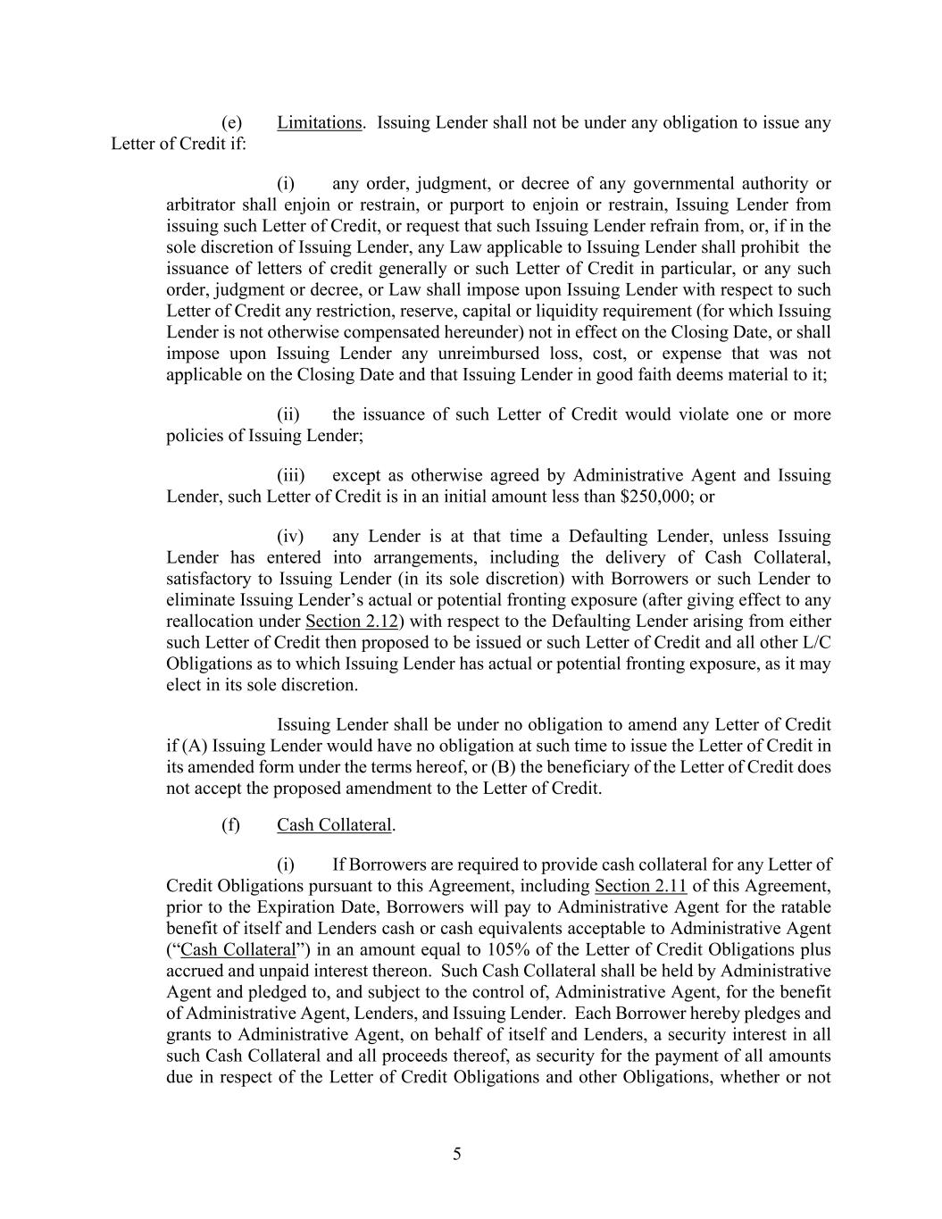 5 (e) Limitations. Issuing Lender shall not be under any obligation to issue any Letter of Credit if: (i) any order, judgment, or decree of any governmental authority or arbitrator shall enjoin or restrain, or purport to enjoin or restrain, Issuing Lender from issuing such Letter of Credit, or request that such Issuing Lender refrain from, or, if in the sole discretion of Issuing Lender, any Law applicable to Issuing Lender shall prohibit the issuance of letters of credit generally or such Letter of Credit in particular, or any such order, judgment or decree, or Law shall impose upon Issuing Lender with respect to such Letter of Credit any restriction, reserve, capital or liquidity requirement (for which Issuing Lender is not otherwise compensated hereunder) not in effect on the Closing Date, or shall impose upon Issuing Lender any unreimbursed loss, cost, or expense that was not applicable on the Closing Date and that Issuing Lender in good faith deems material to it; (ii) the issuance of such Letter of Credit would violate one or more policies of Issuing Lender; (iii) except as otherwise agreed by Administrative Agent and Issuing Lender, such Letter of Credit is in an initial amount less than $250,000; or (iv) any Lender is at that time a Defaulting Lender, unless Issuing Lender has entered into arrangements, including the delivery of Cash Collateral, satisfactory to Issuing Lender (in its sole discretion) with Borrowers or such Lender to eliminate Issuing Lender’s actual or potential fronting exposure (after giving effect to any reallocation under Section 2.12) with respect to the Defaulting Lender arising from either such Letter of Credit then proposed to be issued or such Letter of Credit and all other L/C Obligations as to which Issuing Lender has actual or potential fronting exposure, as it may elect in its sole discretion. Issuing Lender shall be under no obligation to amend any Letter of Credit if (A) Issuing Lender would have no obligation at such time to issue the Letter of Credit in its amended form under the terms hereof, or (B) the beneficiary of the Letter of Credit does not accept the proposed amendment to the Letter of Credit. (f) Cash Collateral. (i) If Borrowers are required to provide cash collateral for any Letter of Credit Obligations pursuant to this Agreement, including Section 2.11 of this Agreement, prior to the Expiration Date, Borrowers will pay to Administrative Agent for the ratable benefit of itself and Lenders cash or cash equivalents acceptable to Administrative Agent (“Cash Collateral”) in an amount equal to 105% of the Letter of Credit Obligations plus accrued and unpaid interest thereon. Such Cash Collateral shall be held by Administrative Agent and pledged to, and subject to the control of, Administrative Agent, for the benefit of Administrative Agent, Lenders, and Issuing Lender. Each Borrower hereby pledges and grants to Administrative Agent, on behalf of itself and Lenders, a security interest in all such Cash Collateral and all proceeds thereof, as security for the payment of all amounts due in respect of the Letter of Credit Obligations and other Obligations, whether or not
