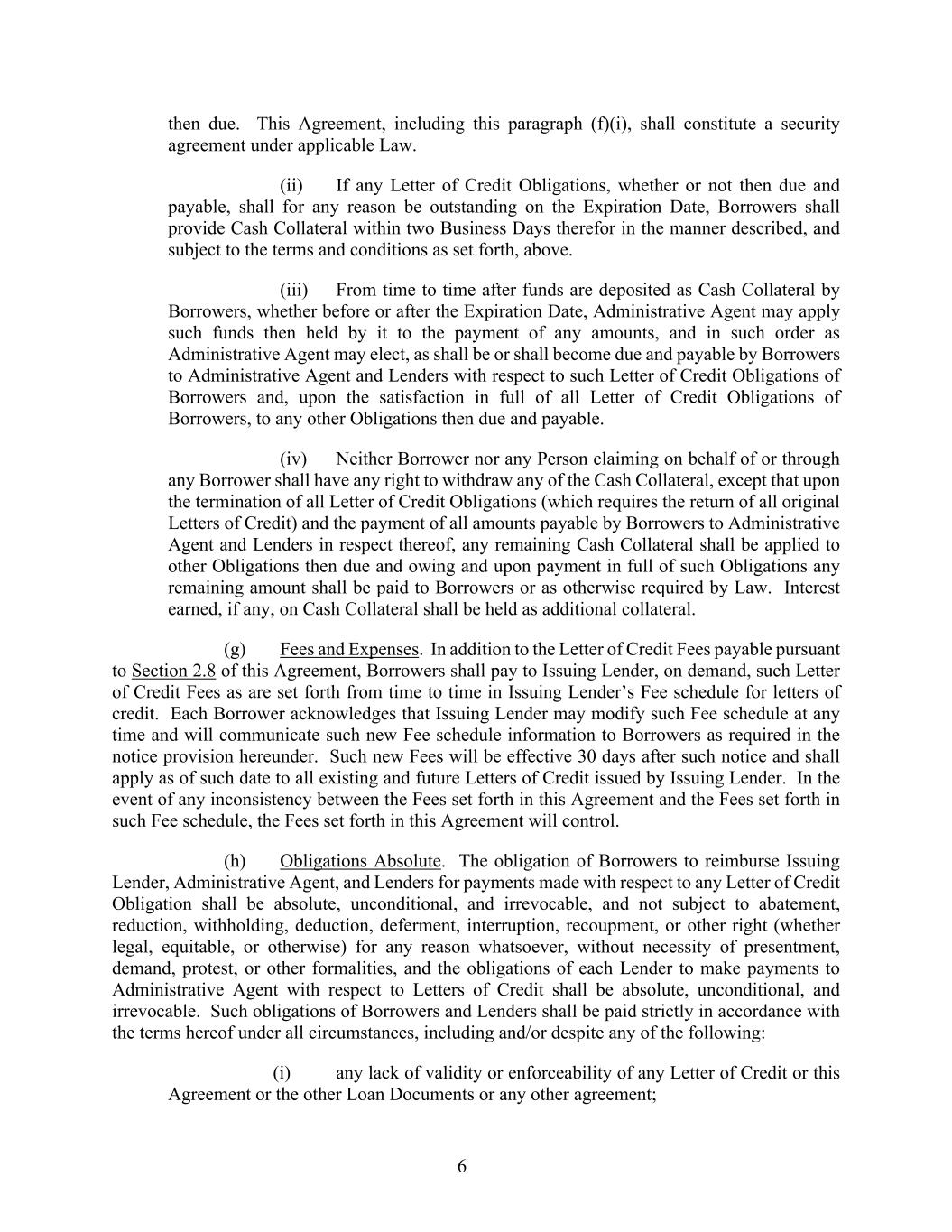 6 then due. This Agreement, including this paragraph (f)(i), shall constitute a security agreement under applicable Law. (ii) If any Letter of Credit Obligations, whether or not then due and payable, shall for any reason be outstanding on the Expiration Date, Borrowers shall provide Cash Collateral within two Business Days therefor in the manner described, and subject to the terms and conditions as set forth, above. (iii) From time to time after funds are deposited as Cash Collateral by Borrowers, whether before or after the Expiration Date, Administrative Agent may apply such funds then held by it to the payment of any amounts, and in such order as Administrative Agent may elect, as shall be or shall become due and payable by Borrowers to Administrative Agent and Lenders with respect to such Letter of Credit Obligations of Borrowers and, upon the satisfaction in full of all Letter of Credit Obligations of Borrowers, to any other Obligations then due and payable. (iv) Neither Borrower nor any Person claiming on behalf of or through any Borrower shall have any right to withdraw any of the Cash Collateral, except that upon the termination of all Letter of Credit Obligations (which requires the return of all original Letters of Credit) and the payment of all amounts payable by Borrowers to Administrative Agent and Lenders in respect thereof, any remaining Cash Collateral shall be applied to other Obligations then due and owing and upon payment in full of such Obligations any remaining amount shall be paid to Borrowers or as otherwise required by Law. Interest earned, if any, on Cash Collateral shall be held as additional collateral. (g) Fees and Expenses. In addition to the Letter of Credit Fees payable pursuant to Section 2.8 of this Agreement, Borrowers shall pay to Issuing Lender, on demand, such Letter of Credit Fees as are set forth from time to time in Issuing Lender’s Fee schedule for letters of credit. Each Borrower acknowledges that Issuing Lender may modify such Fee schedule at any time and will communicate such new Fee schedule information to Borrowers as required in the notice provision hereunder. Such new Fees will be effective 30 days after such notice and shall apply as of such date to all existing and future Letters of Credit issued by Issuing Lender. In the event of any inconsistency between the Fees set forth in this Agreement and the Fees set forth in such Fee schedule, the Fees set forth in this Agreement will control. (h) Obligations Absolute. The obligation of Borrowers to reimburse Issuing Lender, Administrative Agent, and Lenders for payments made with respect to any Letter of Credit Obligation shall be absolute, unconditional, and irrevocable, and not subject to abatement, reduction, withholding, deduction, deferment, interruption, recoupment, or other right (whether legal, equitable, or otherwise) for any reason whatsoever, without necessity of presentment, demand, protest, or other formalities, and the obligations of each Lender to make payments to Administrative Agent with respect to Letters of Credit shall be absolute, unconditional, and irrevocable. Such obligations of Borrowers and Lenders shall be paid strictly in accordance with the terms hereof under all circumstances, including and/or despite any of the following: (i) any lack of validity or enforceability of any Letter of Credit or this Agreement or the other Loan Documents or any other agreement;