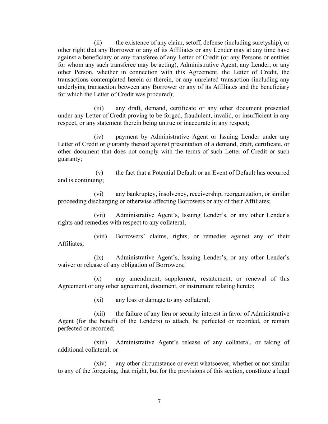 7 (ii) the existence of any claim, setoff, defense (including suretyship), or other right that any Borrower or any of its Affiliates or any Lender may at any time have against a beneficiary or any transferee of any Letter of Credit (or any Persons or entities for whom any such transferee may be acting), Administrative Agent, any Lender, or any other Person, whether in connection with this Agreement, the Letter of Credit, the transactions contemplated herein or therein, or any unrelated transaction (including any underlying transaction between any Borrower or any of its Affiliates and the beneficiary for which the Letter of Credit was procured); (iii) any draft, demand, certificate or any other document presented under any Letter of Credit proving to be forged, fraudulent, invalid, or insufficient in any respect, or any statement therein being untrue or inaccurate in any respect; (iv) payment by Administrative Agent or Issuing Lender under any Letter of Credit or guaranty thereof against presentation of a demand, draft, certificate, or other document that does not comply with the terms of such Letter of Credit or such guaranty; (v) the fact that a Potential Default or an Event of Default has occurred and is continuing; (vi) any bankruptcy, insolvency, receivership, reorganization, or similar proceeding discharging or otherwise affecting Borrowers or any of their Affiliates; (vii) Administrative Agent’s, Issuing Lender’s, or any other Lender’s rights and remedies with respect to any collateral; (viii) Borrowers’ claims, rights, or remedies against any of their Affiliates; (ix) Administrative Agent’s, Issuing Lender’s, or any other Lender’s waiver or release of any obligation of Borrowers; (x) any amendment, supplement, restatement, or renewal of this Agreement or any other agreement, document, or instrument relating hereto; (xi) any loss or damage to any collateral; (xii) the failure of any lien or security interest in favor of Administrative Agent (for the benefit of the Lenders) to attach, be perfected or recorded, or remain perfected or recorded; (xiii) Administrative Agent’s release of any collateral, or taking of additional collateral; or (xiv) any other circumstance or event whatsoever, whether or not similar to any of the foregoing, that might, but for the provisions of this section, constitute a legal